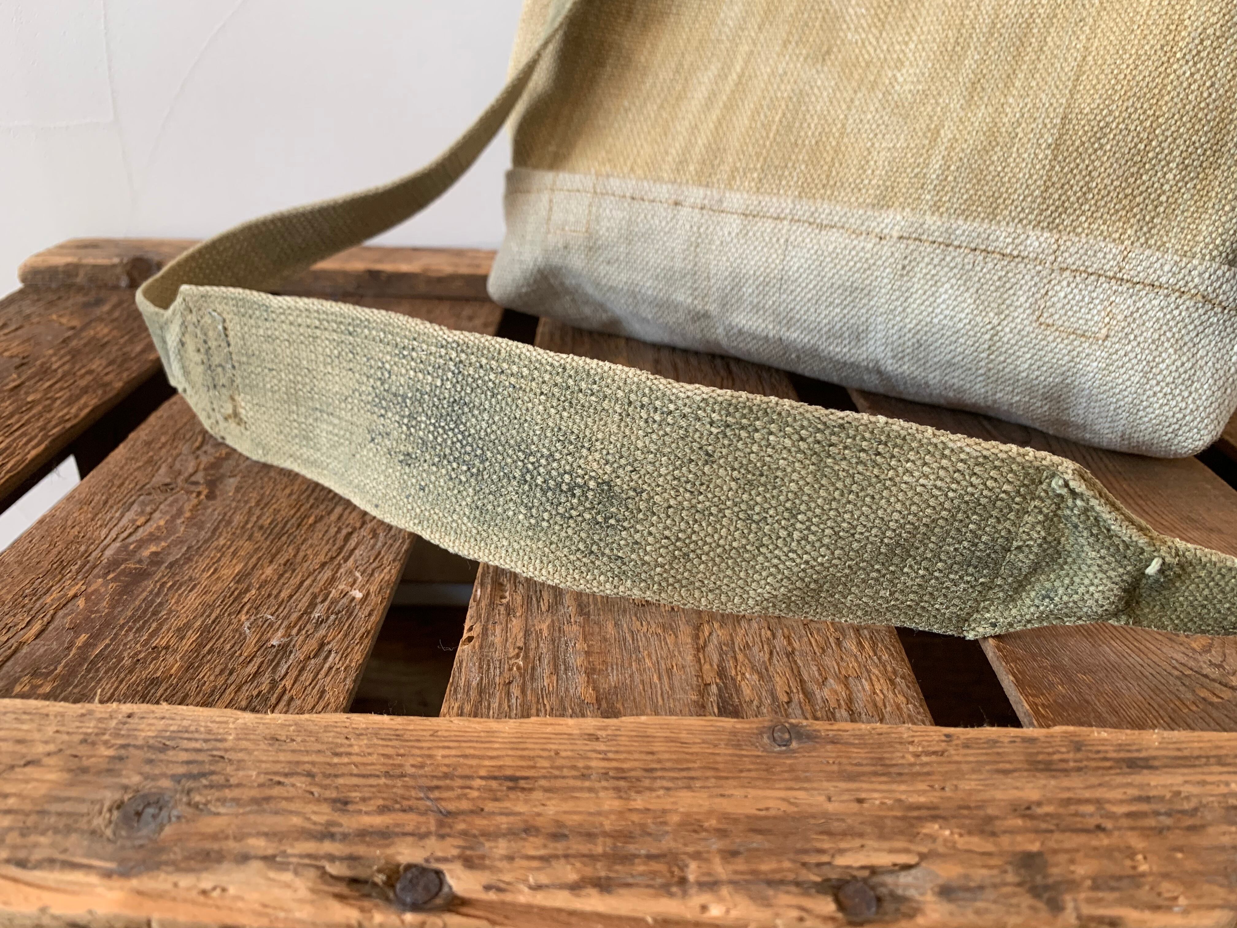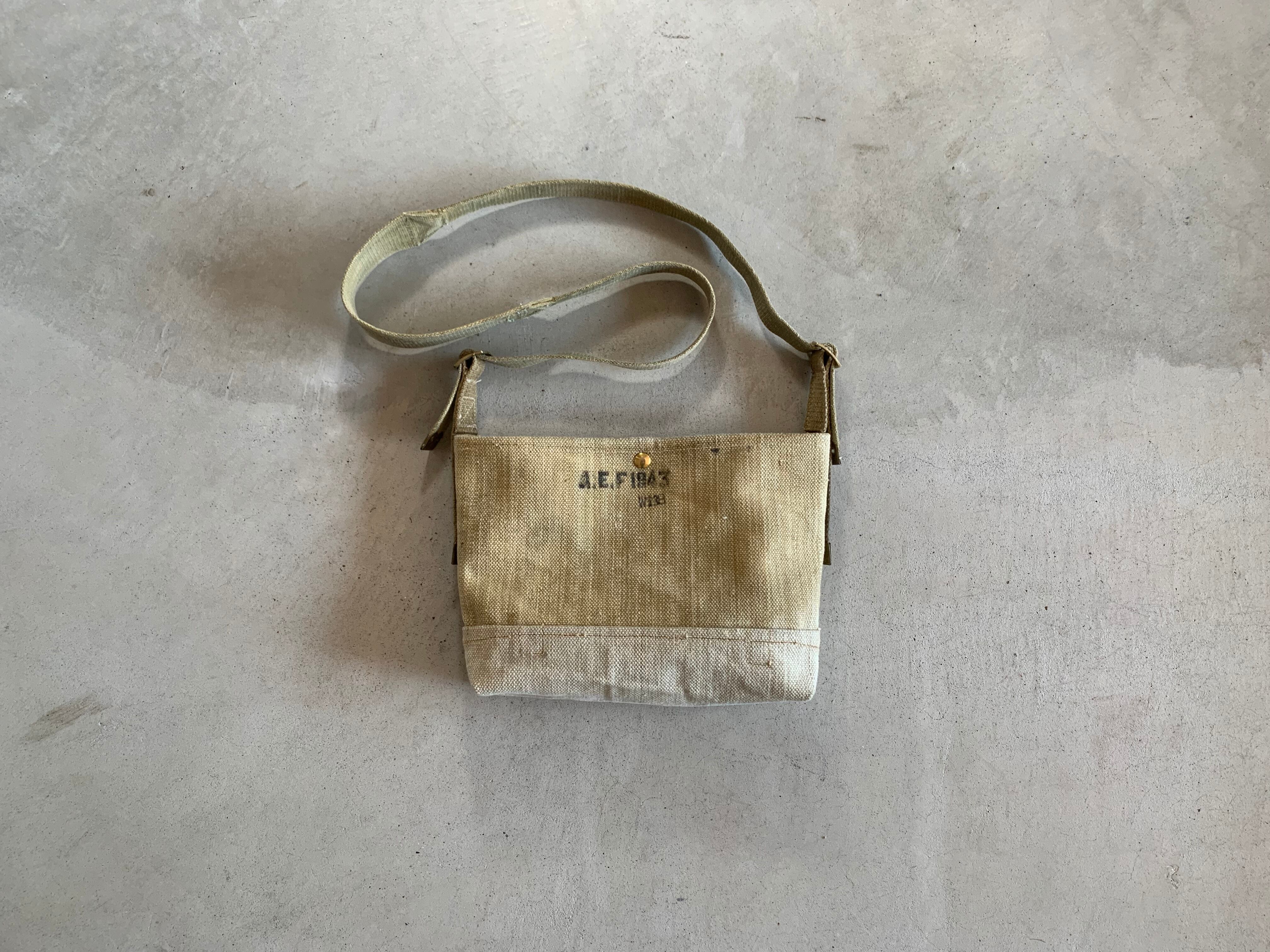 素材はおそらく麻素材で、かなり分厚く丈夫な素材です。開口部付近に『A.E.F 1943』のステンシル、真鍮のアジャスターには『I.W.M.C.1942』の刻印と、マニア心をくすぐるギミックがたくさん。やれた雰囲気のショルダーベルトも味があってグッドです。