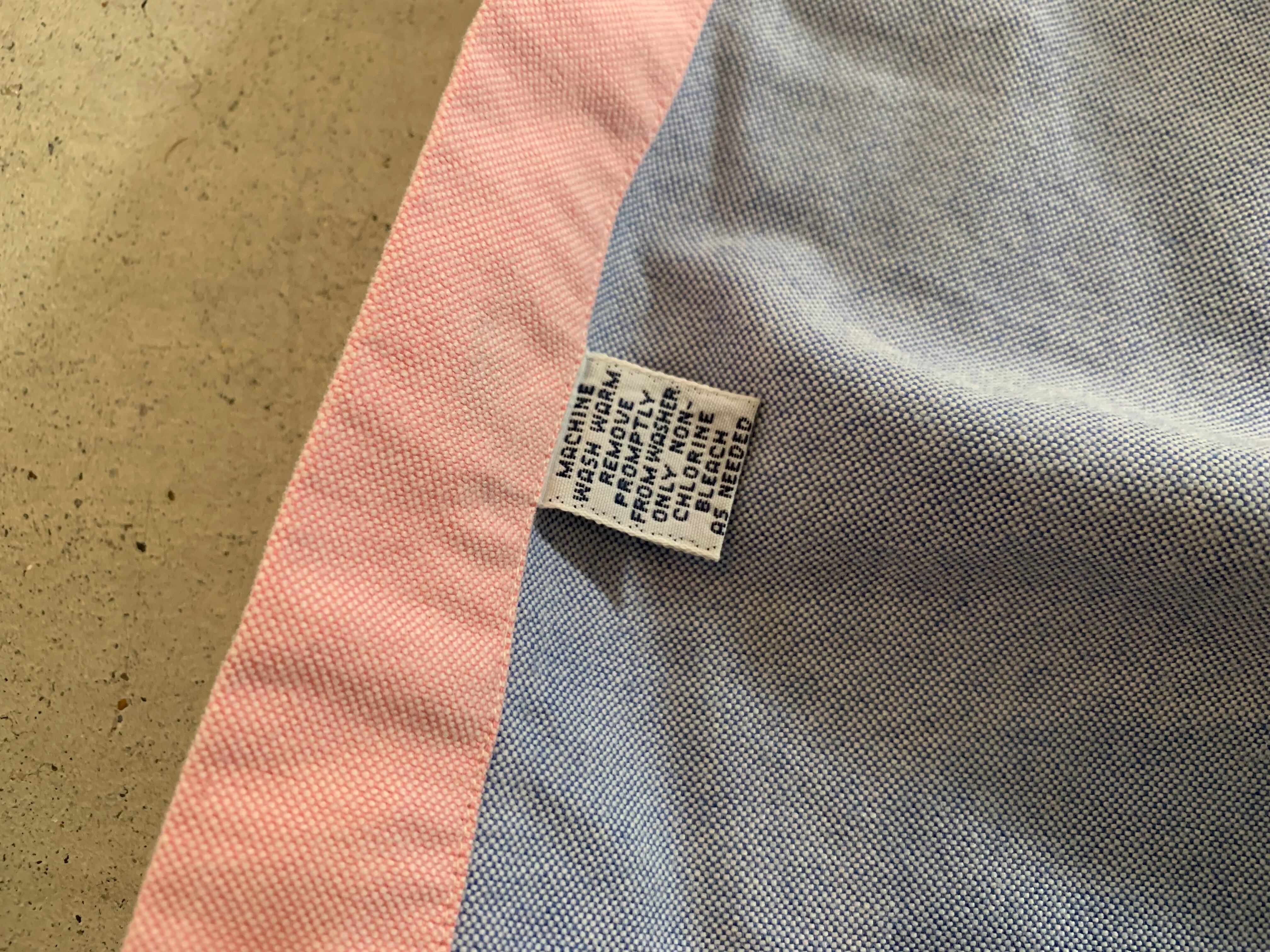 素材はコットン100%のオックスフォード、色味はサックスブルーとピンクのポップなカラーリングの太ストライプ。