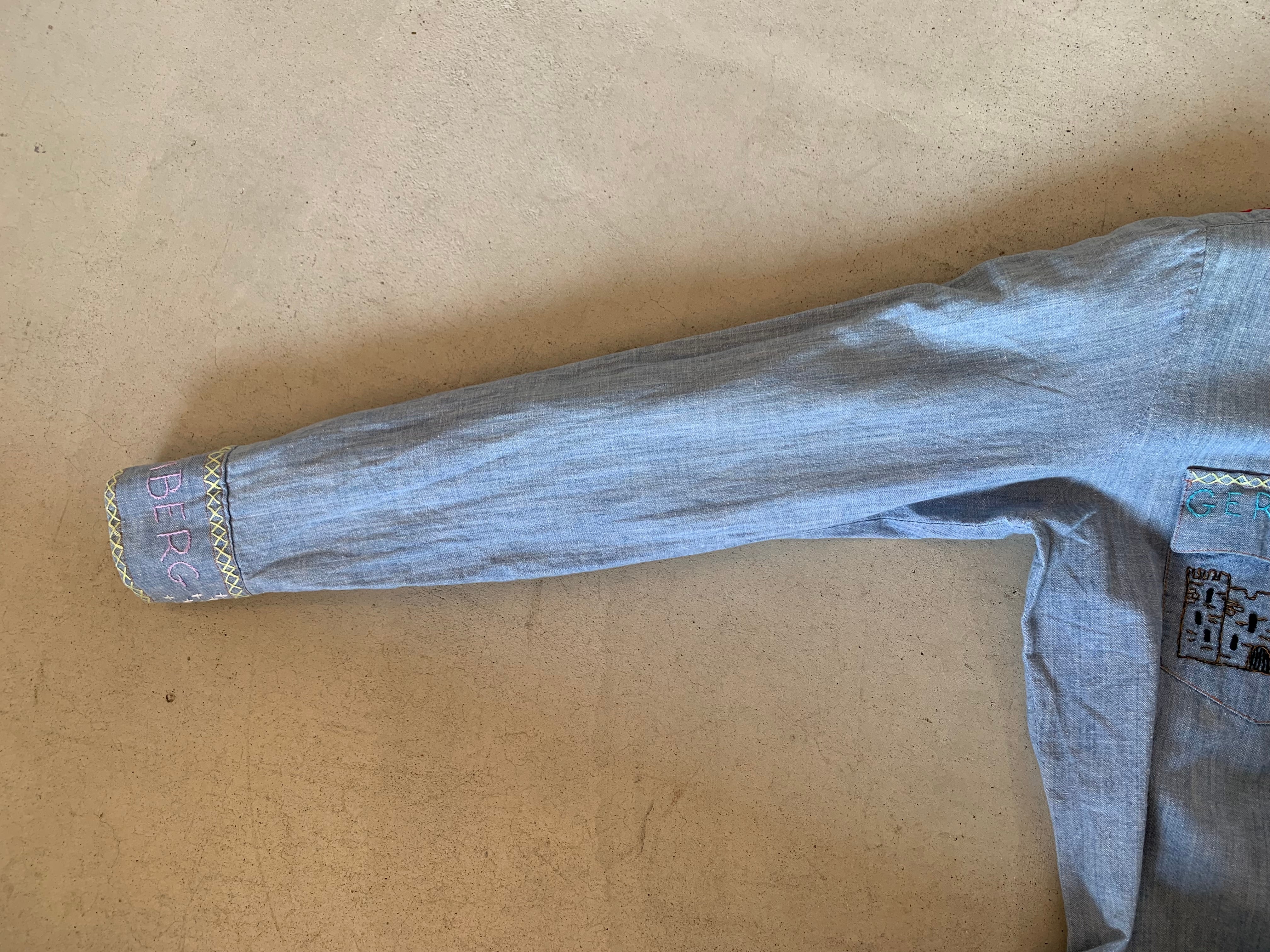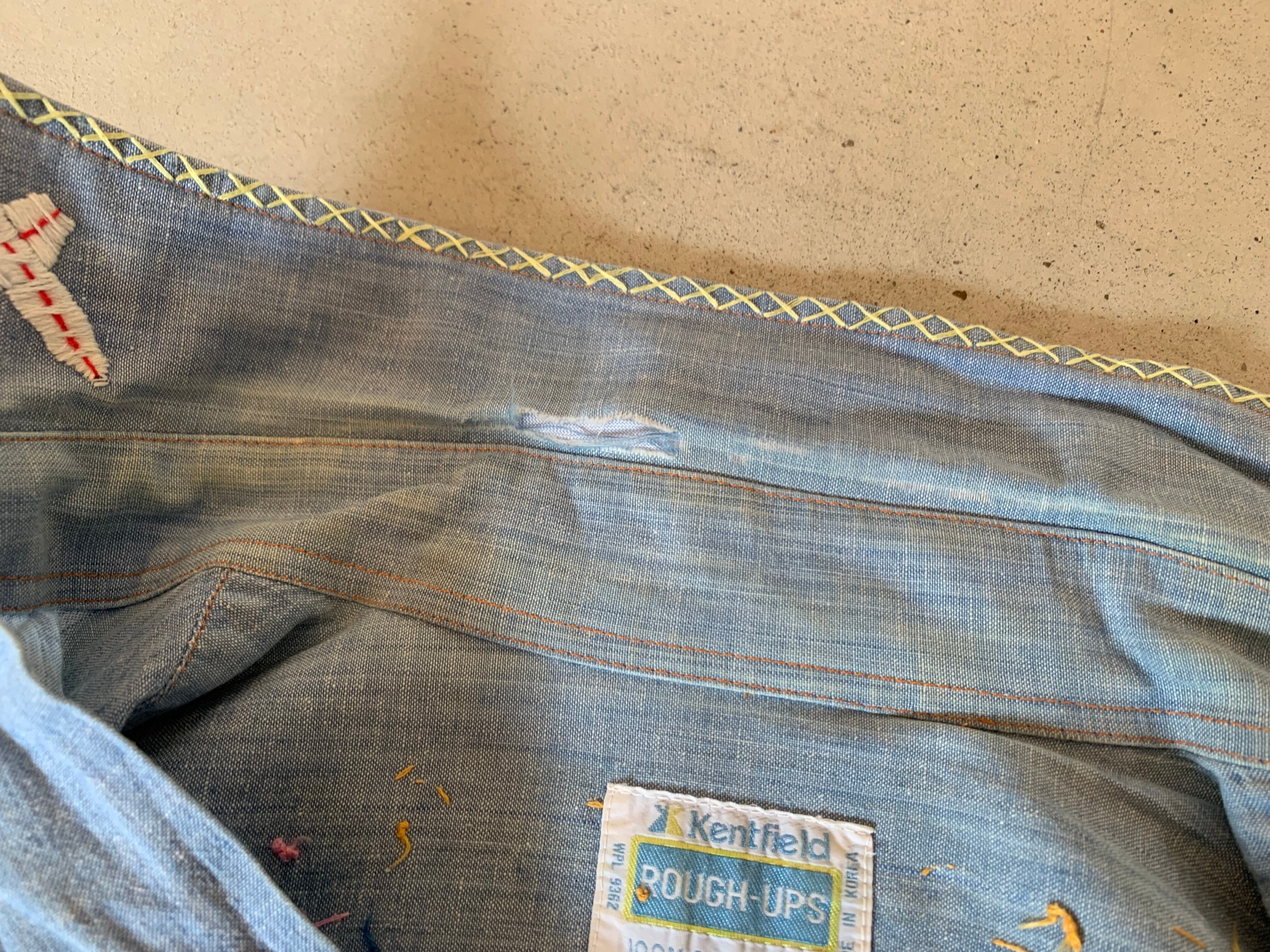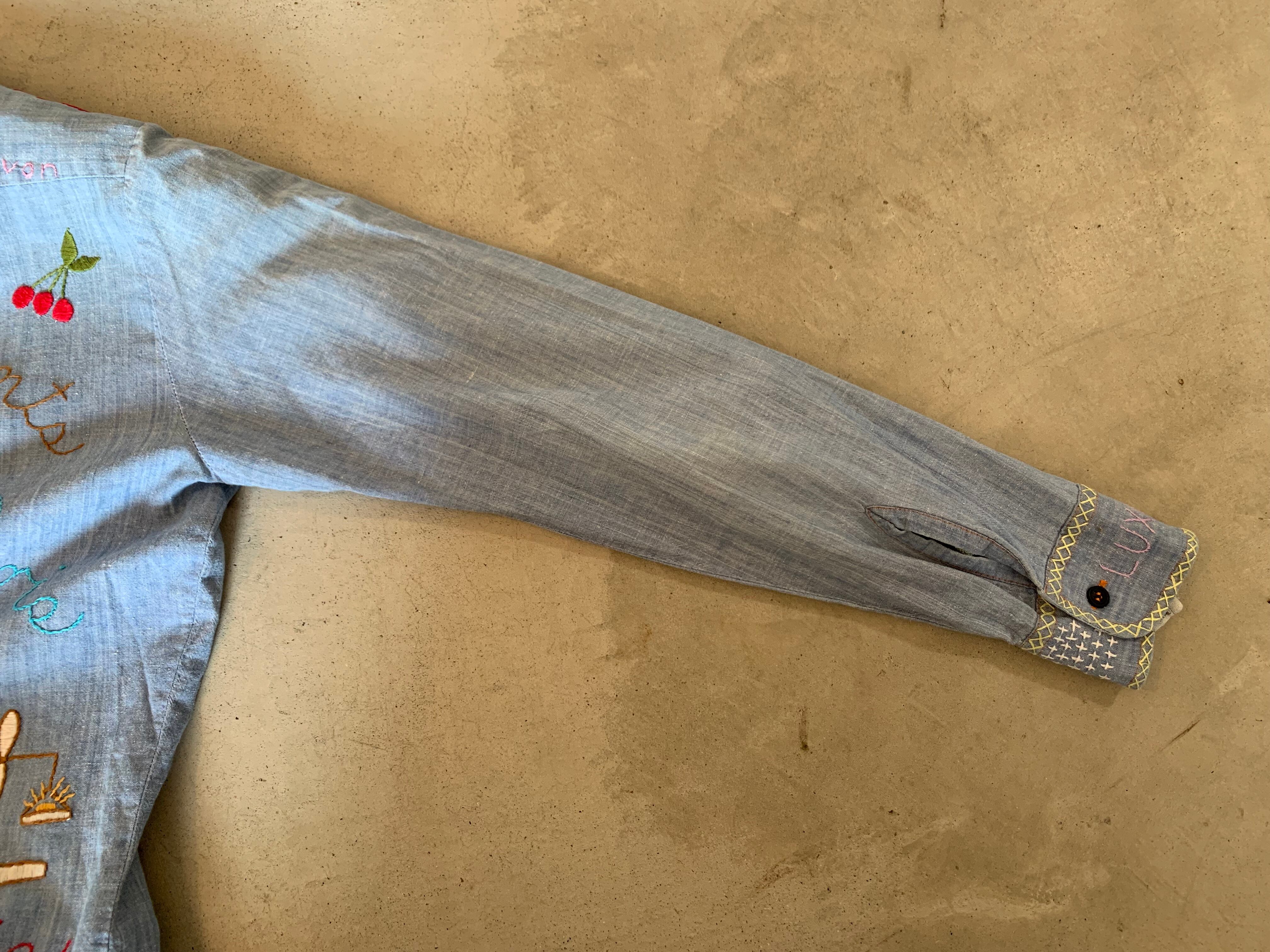 70年代頃のハンドメイドの刺繍が施されたシャンブレーシャツ。全体的に刺繍されていて、かなり賑やかなシャツです。