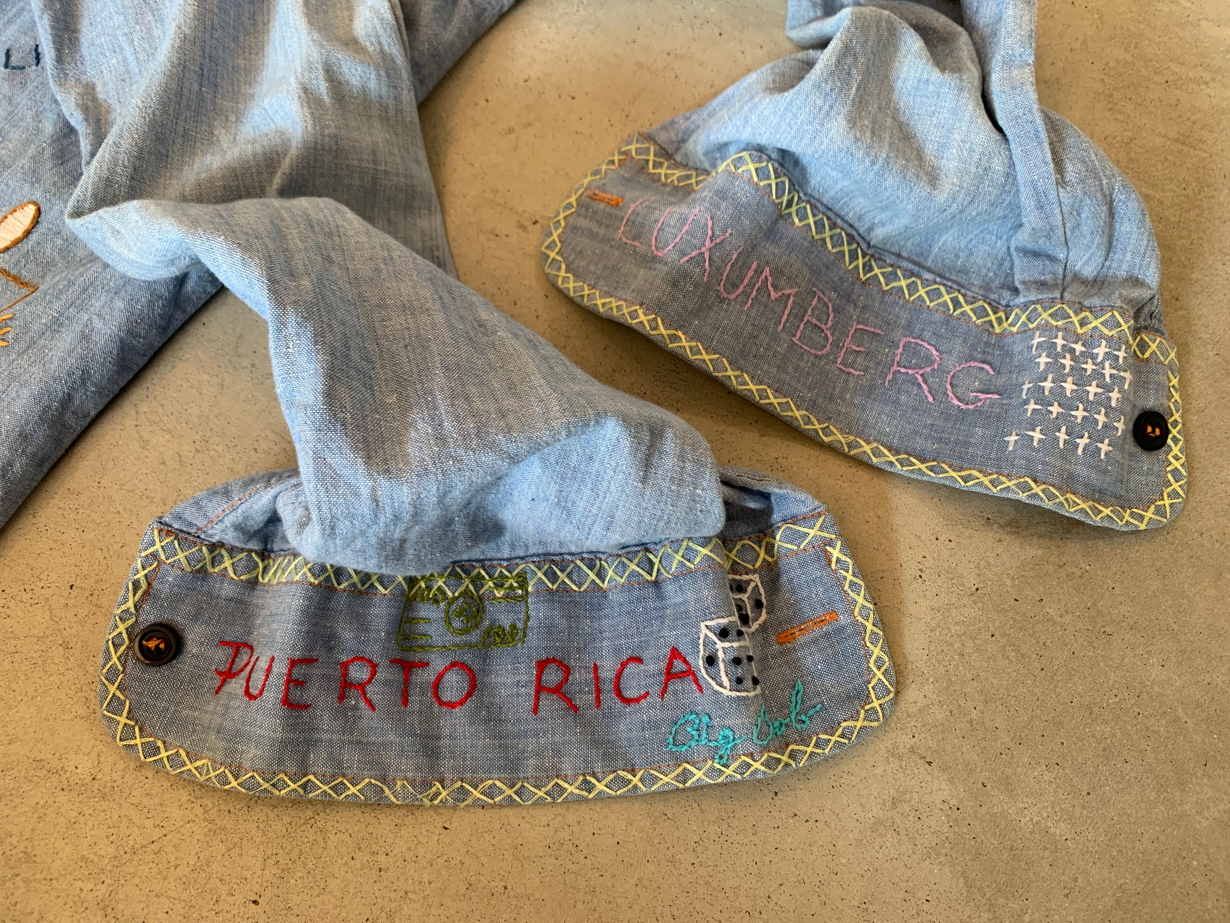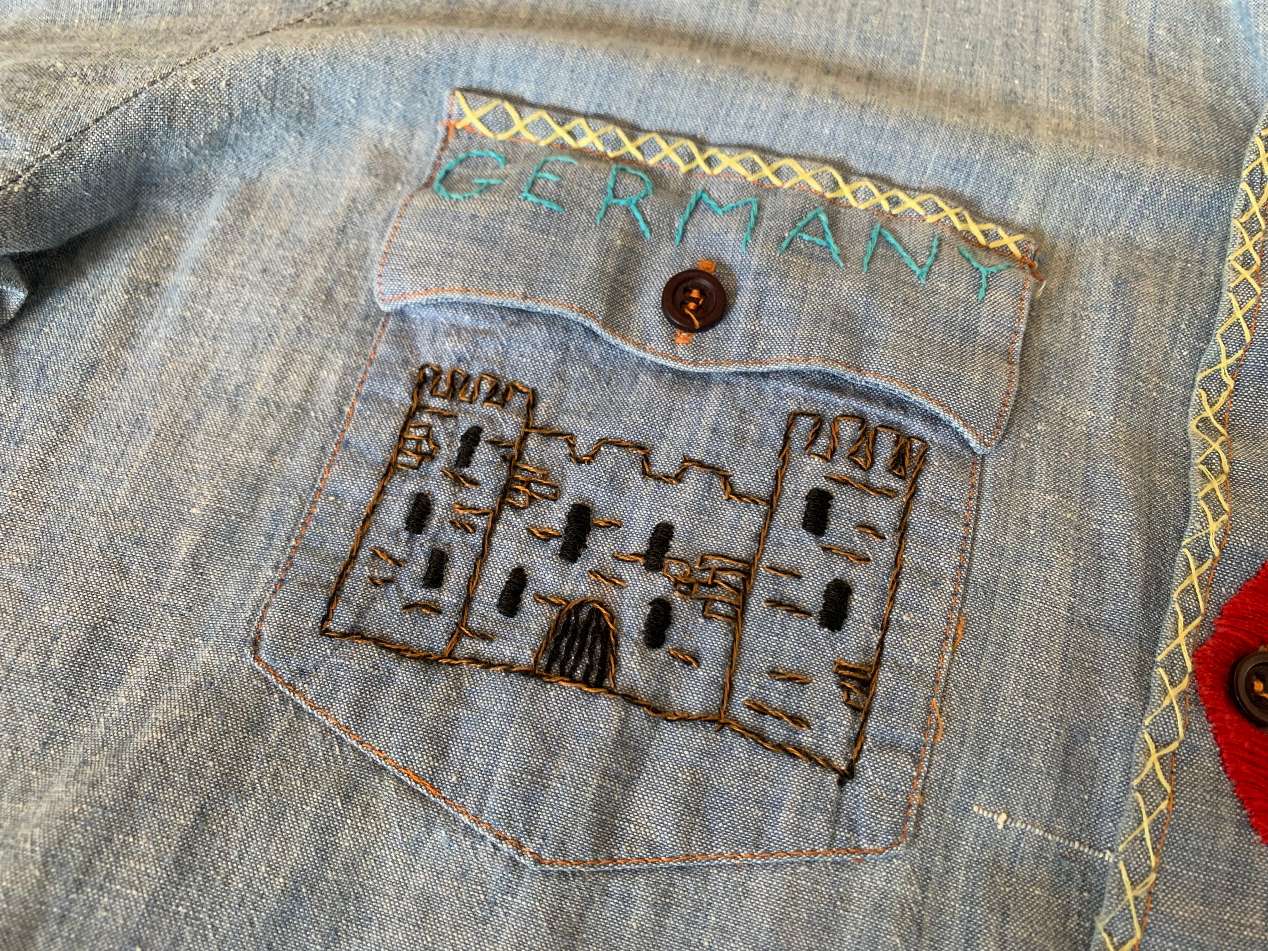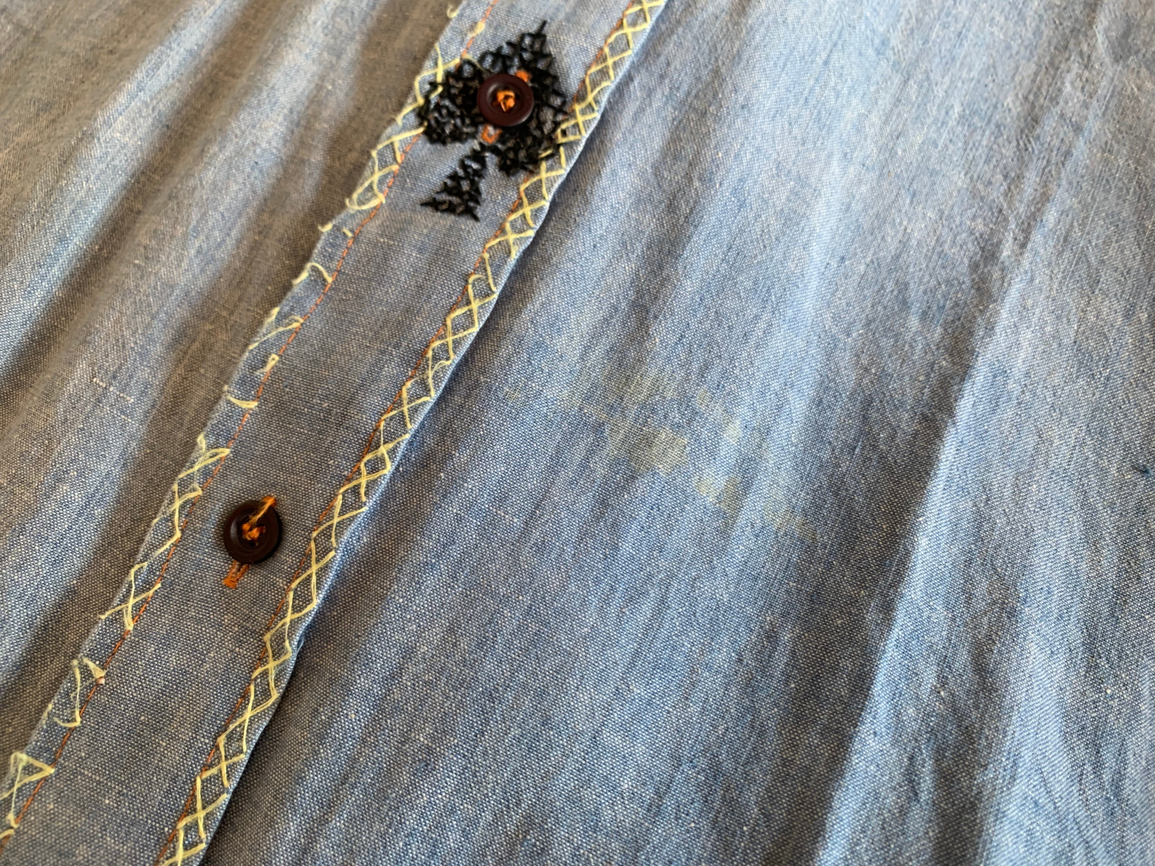 70年代頃のハンドメイドの刺繍が施されたシャンブレーシャツ。全体的に刺繍されていて、かなり賑やかなシャツです。