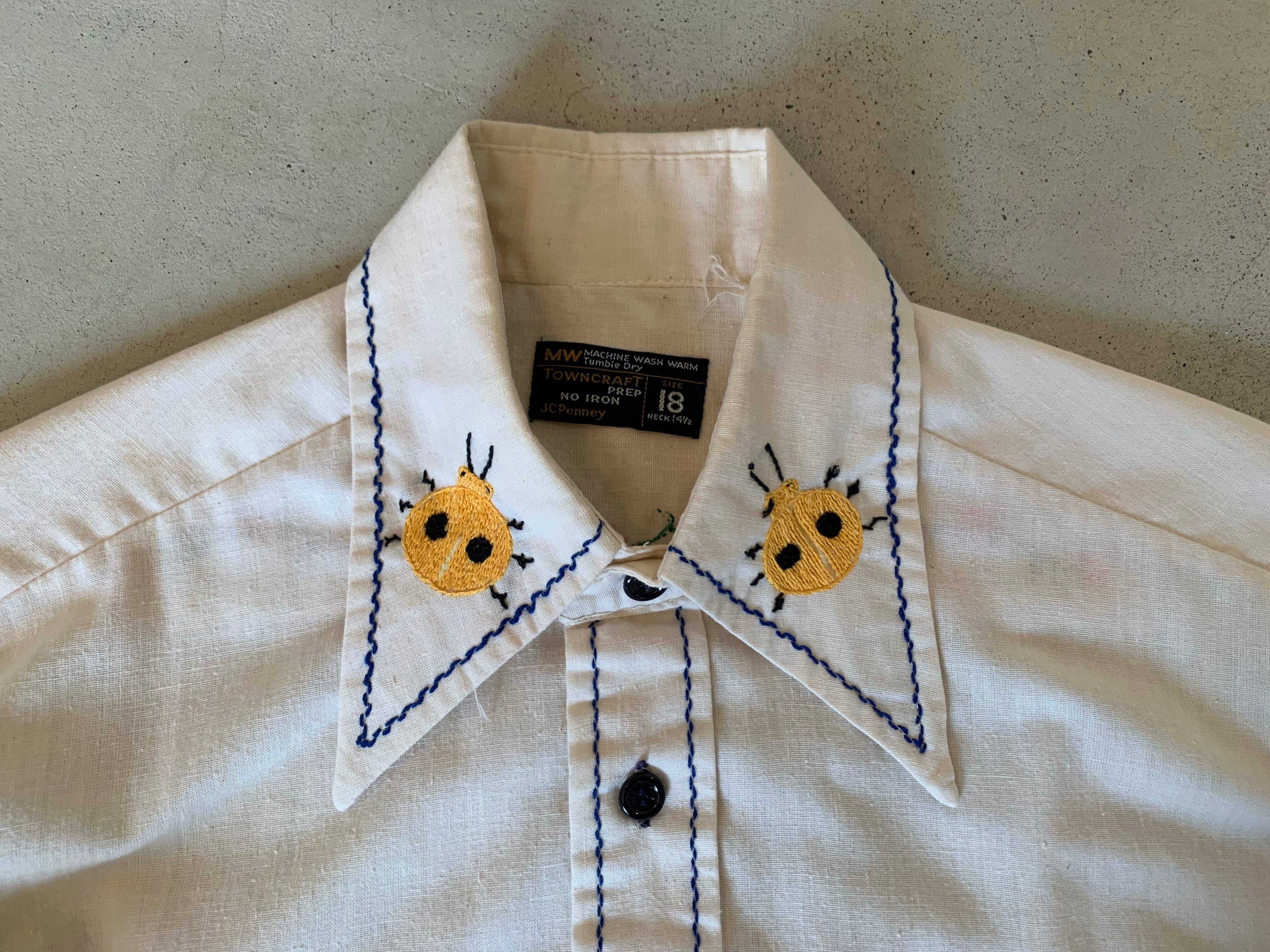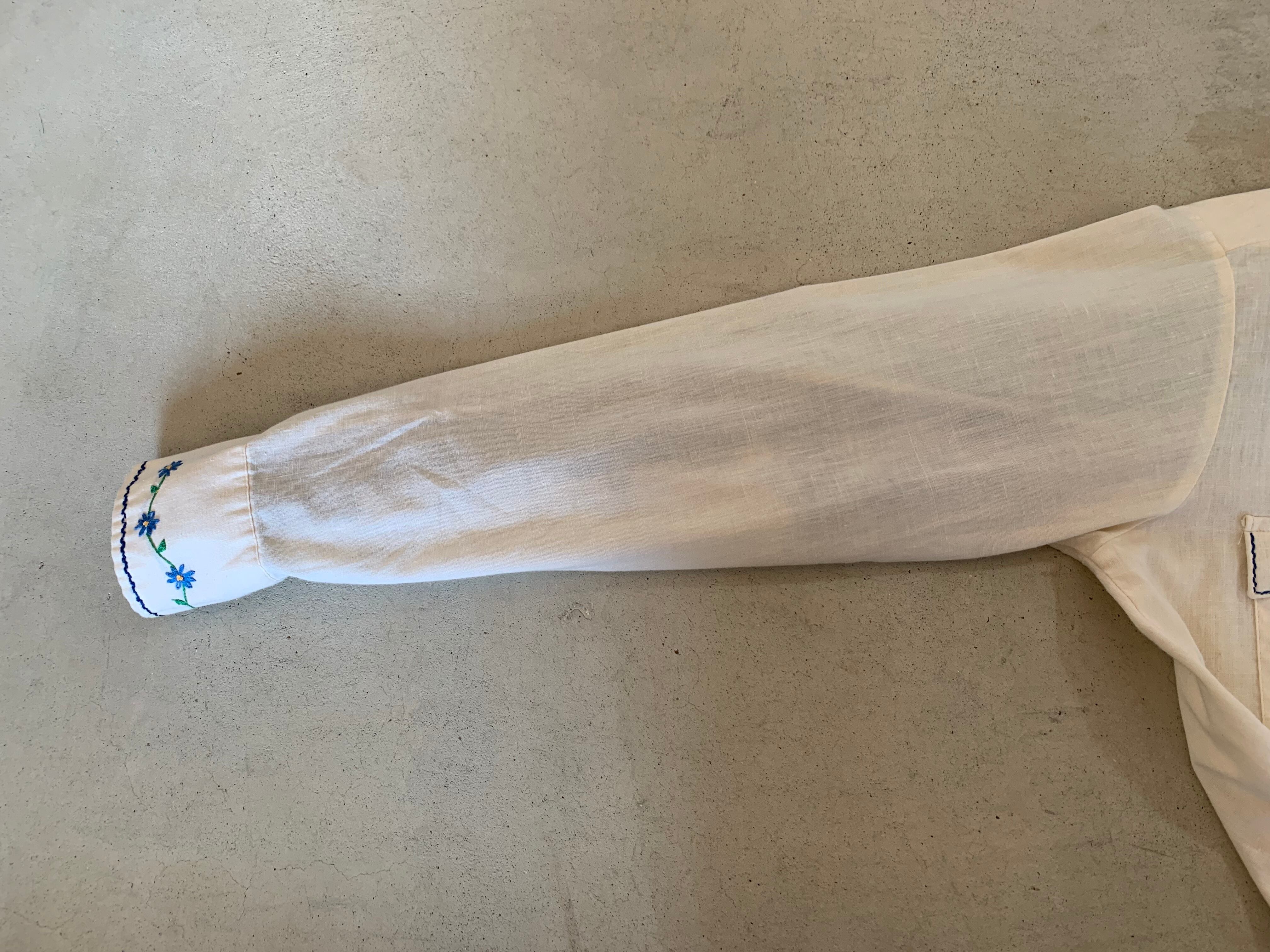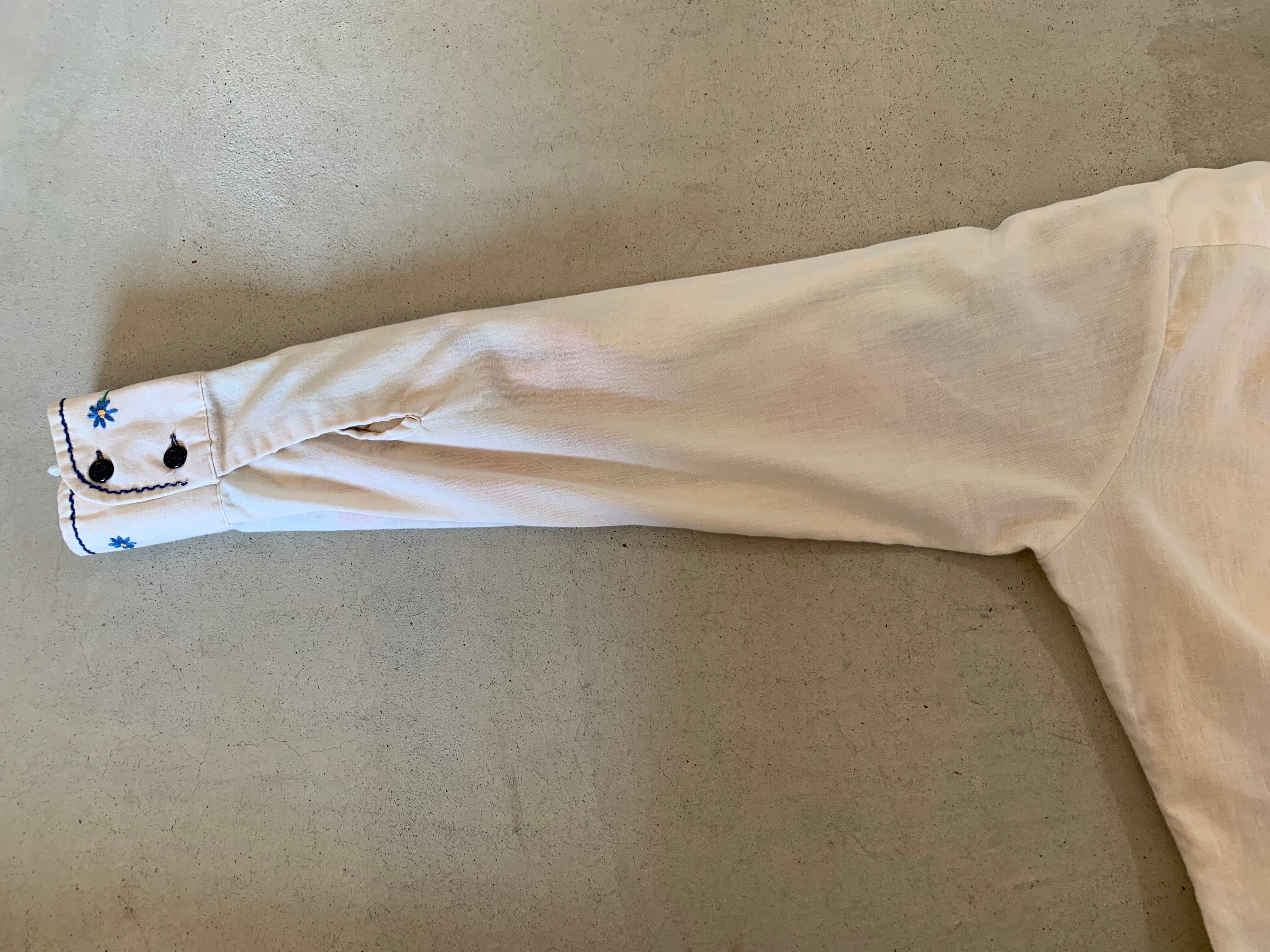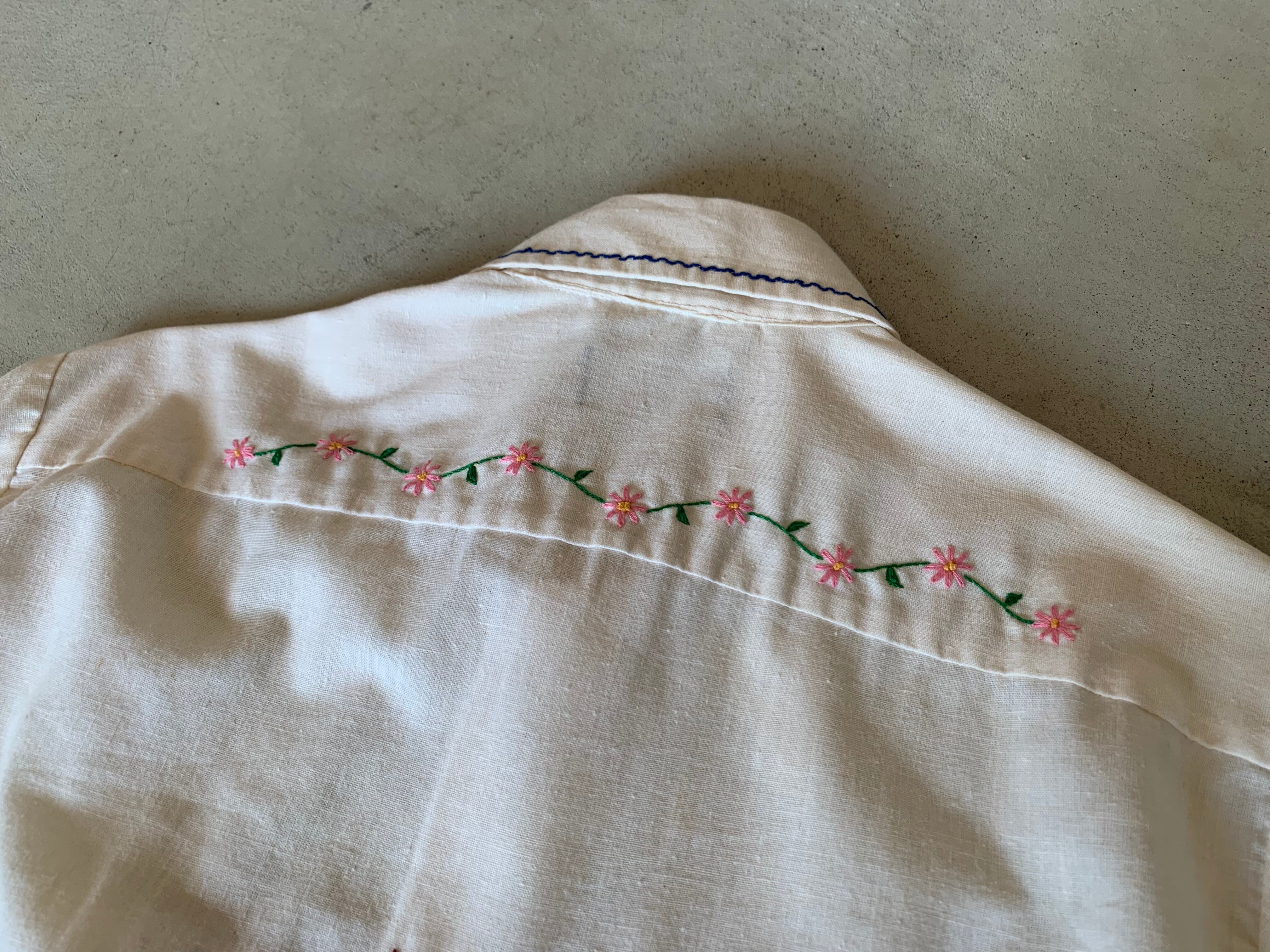 70年代頃のハンドメイドの刺繍が施されたキナリ色のシャツ。背中のフクロウが70年代を感じさせる、可愛らしいシャツです。