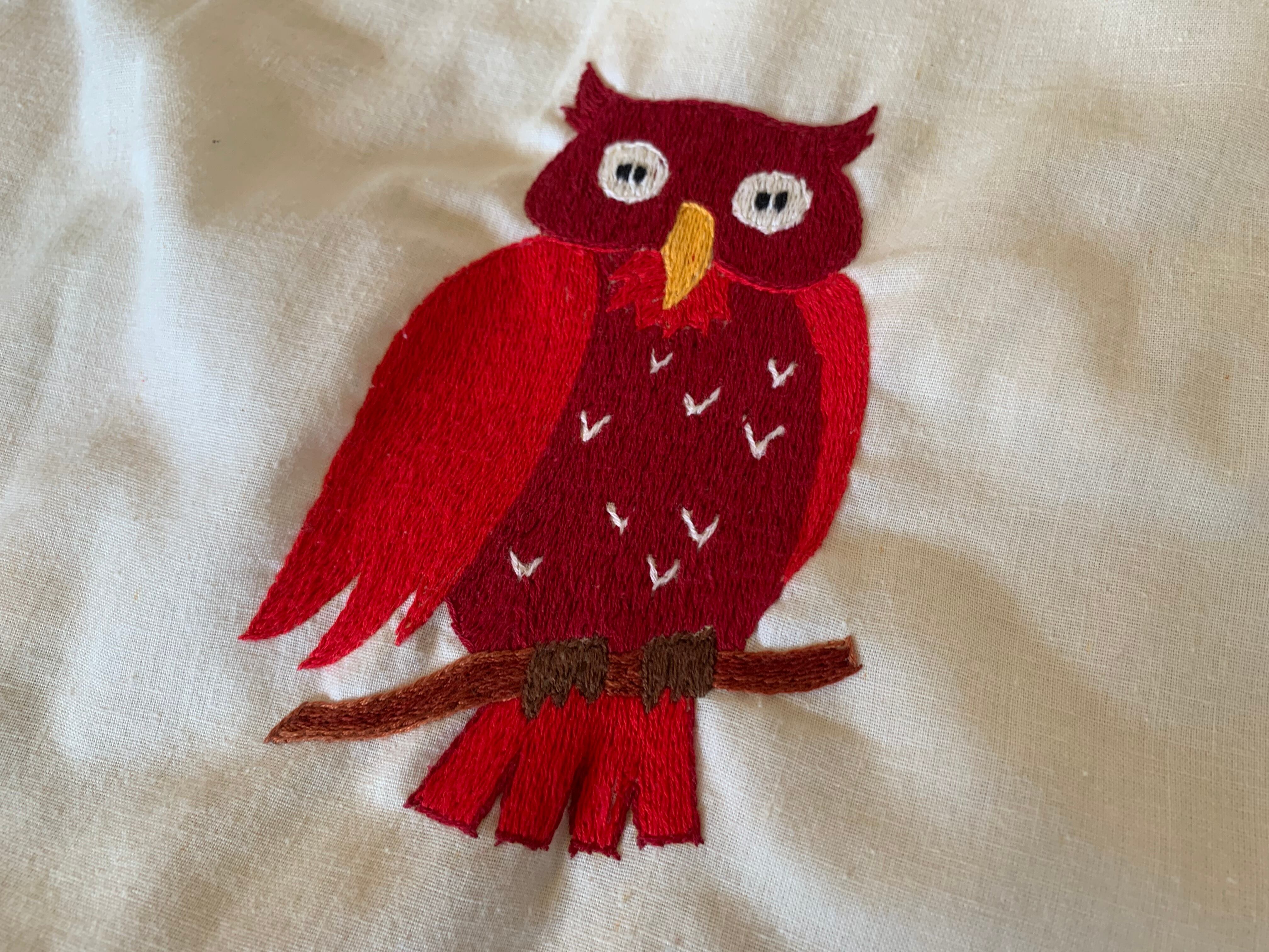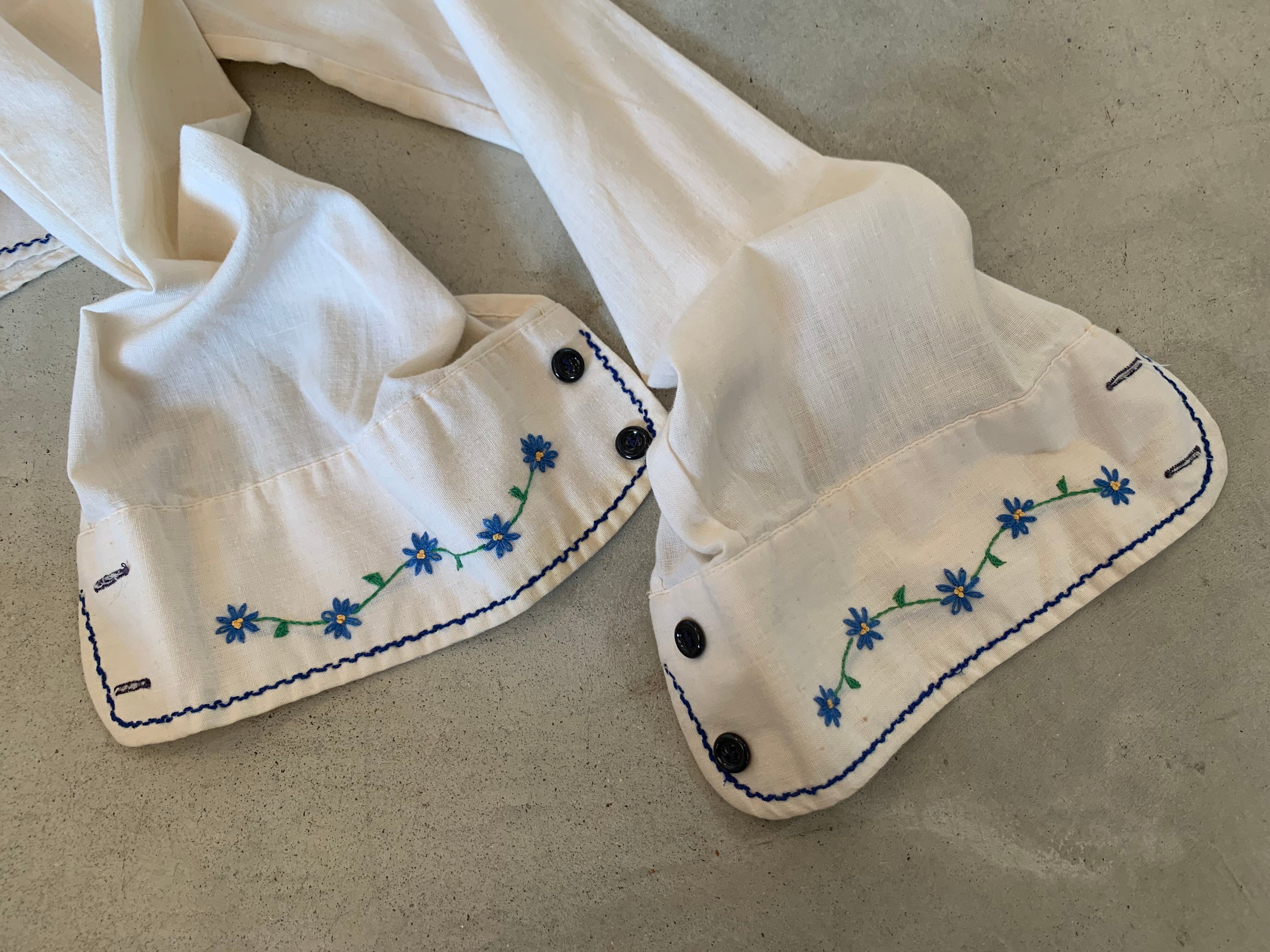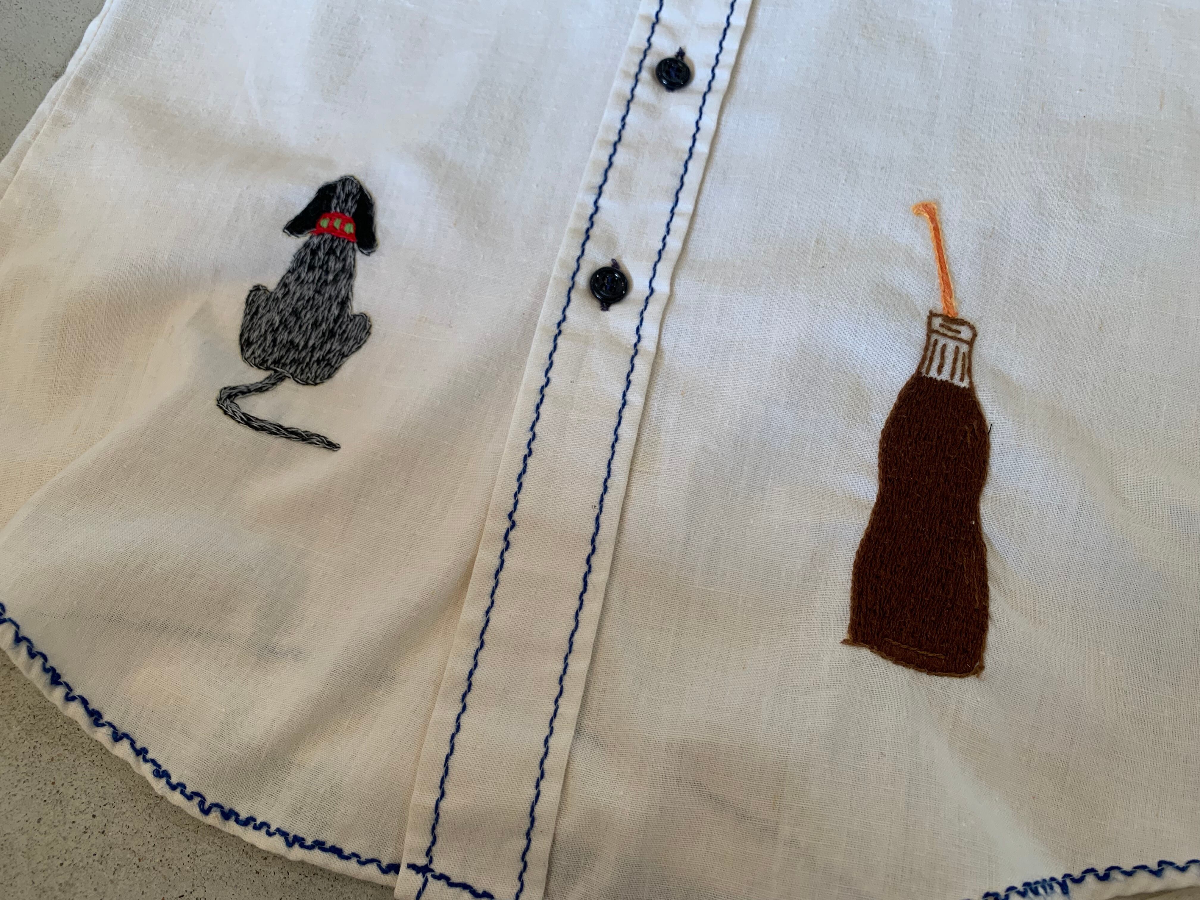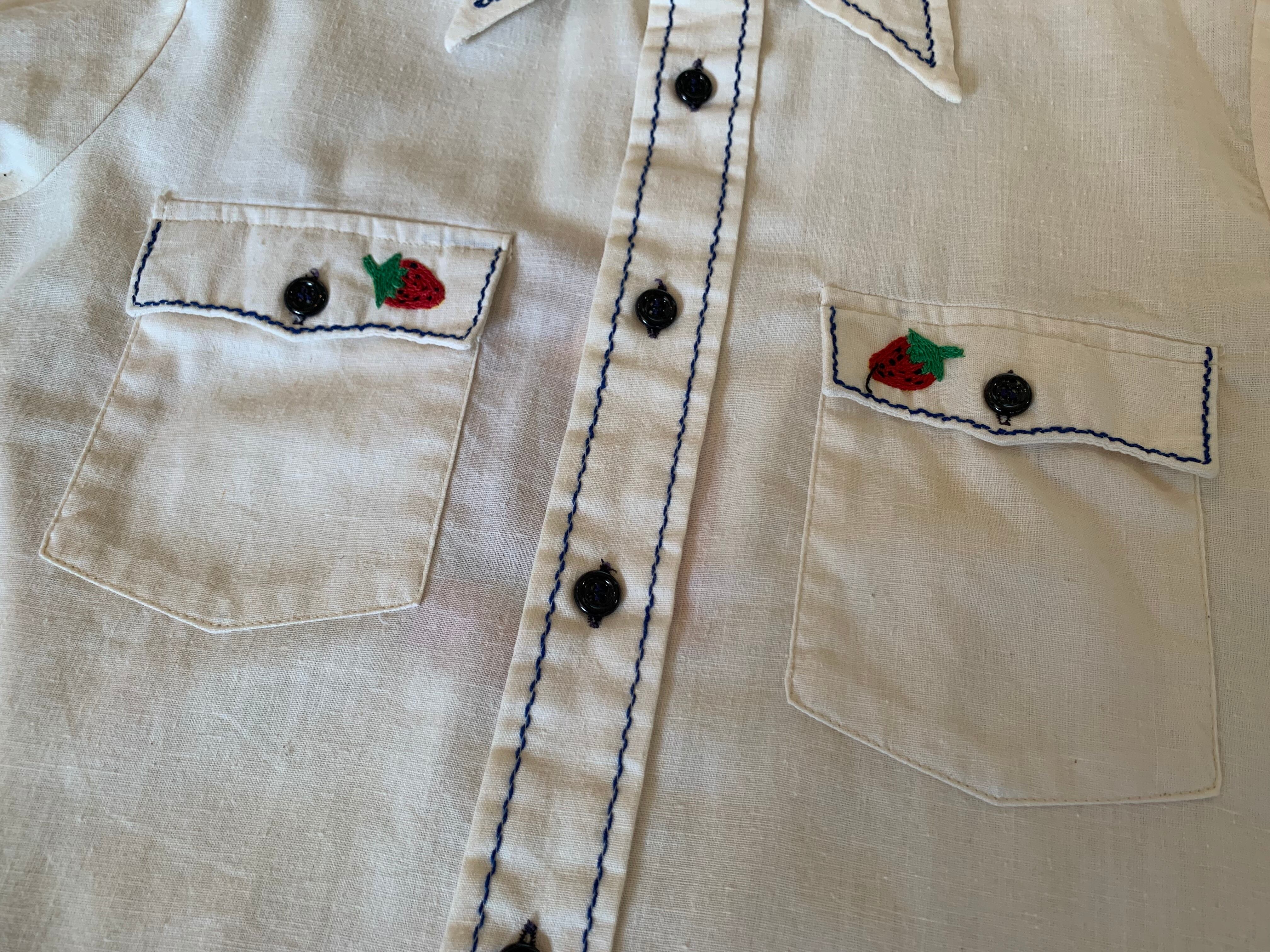 70年代頃のハンドメイドの刺繍が施されたキナリ色のシャツ。背中のフクロウが70年代を感じさせる、可愛らしいシャツです。