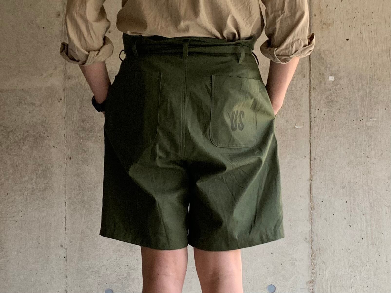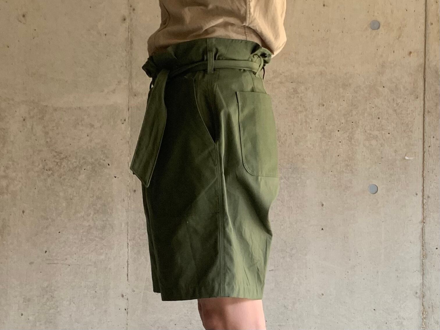 シルエットはイタリア軍のグルカショーツのサイズ感で作っており、履いた時にウエストがクシュッとギャザーができるようデザインしました。タックインをしてベルトでギュッとしめると独特な雰囲気がでます。