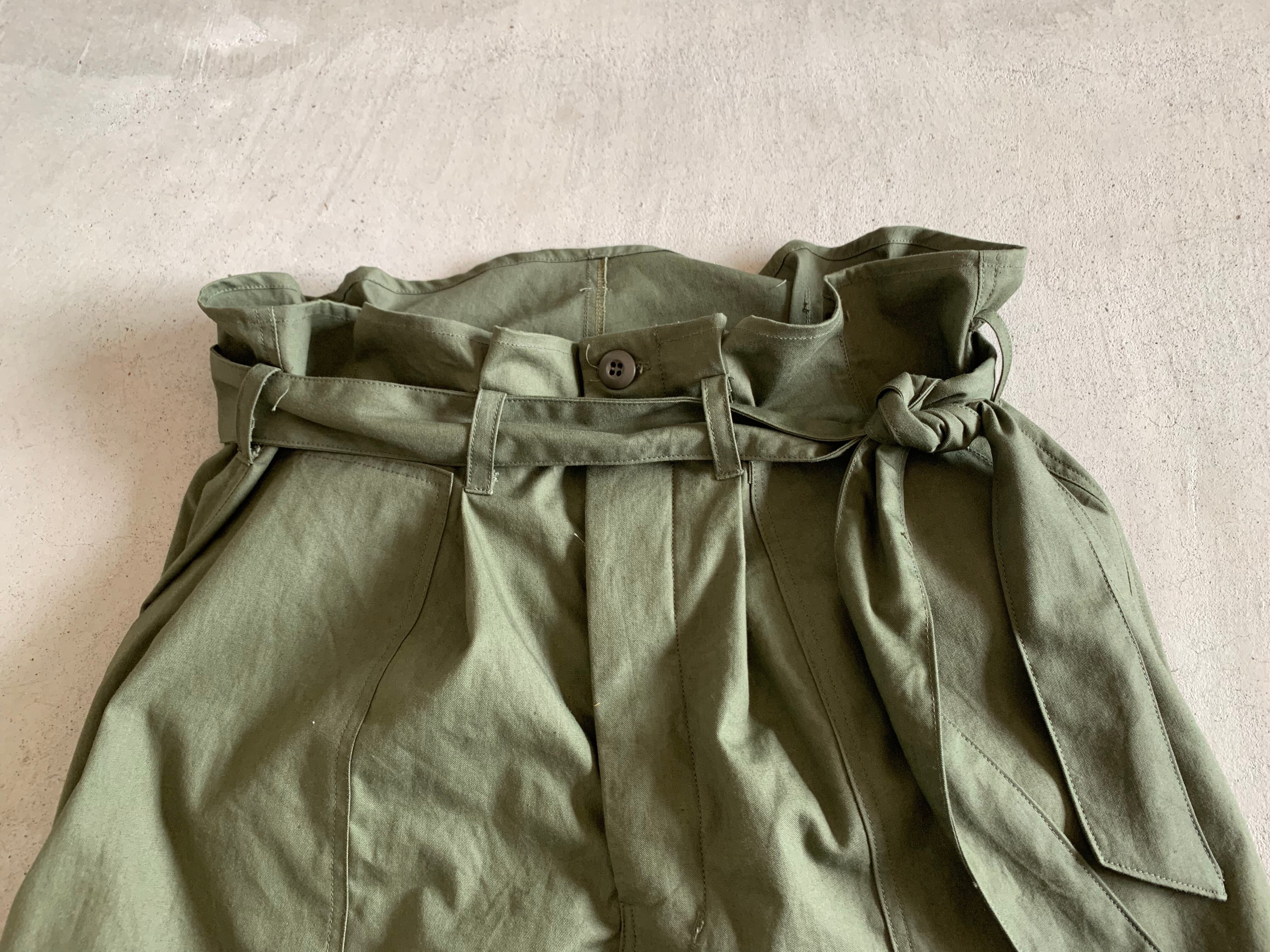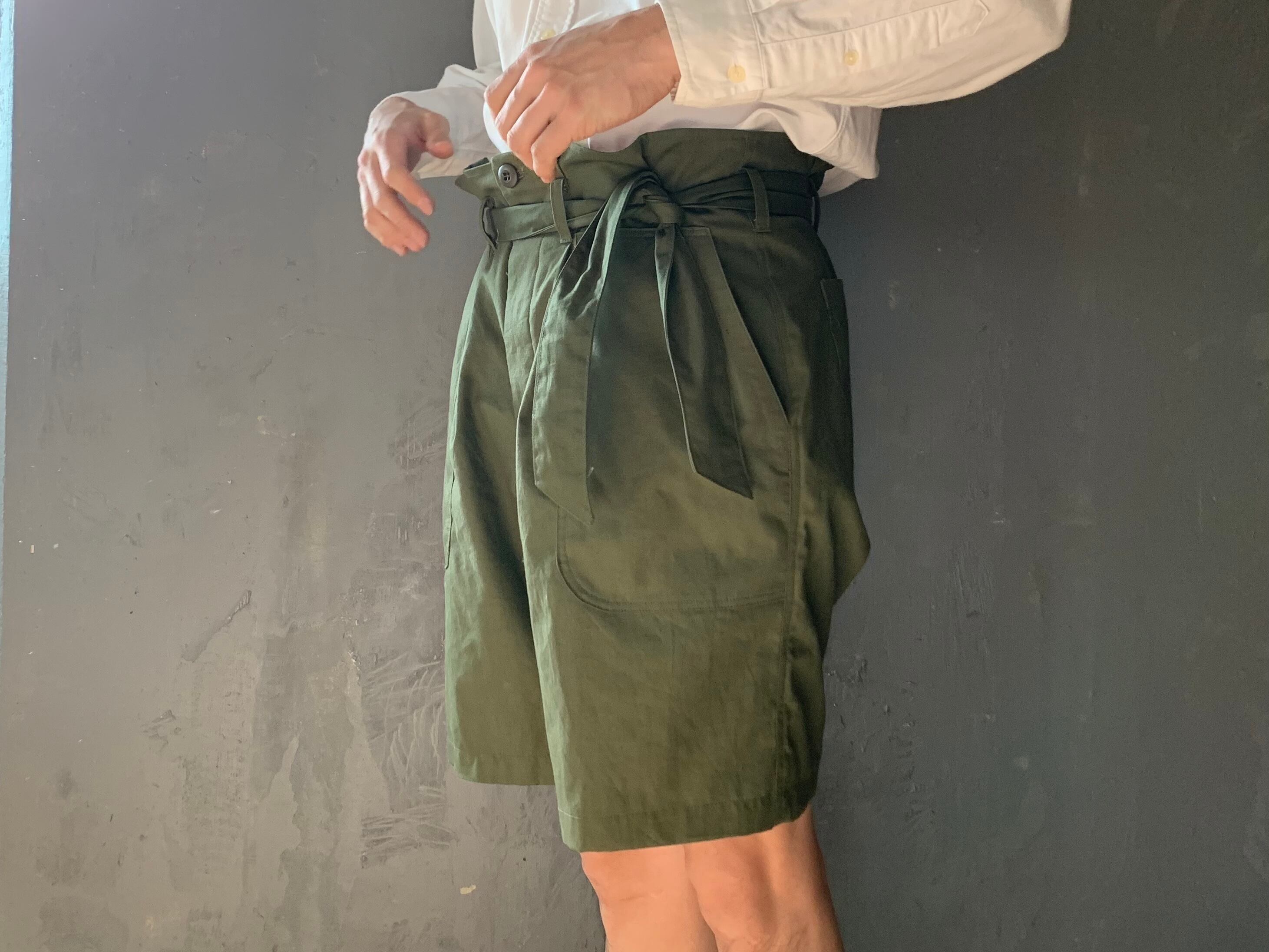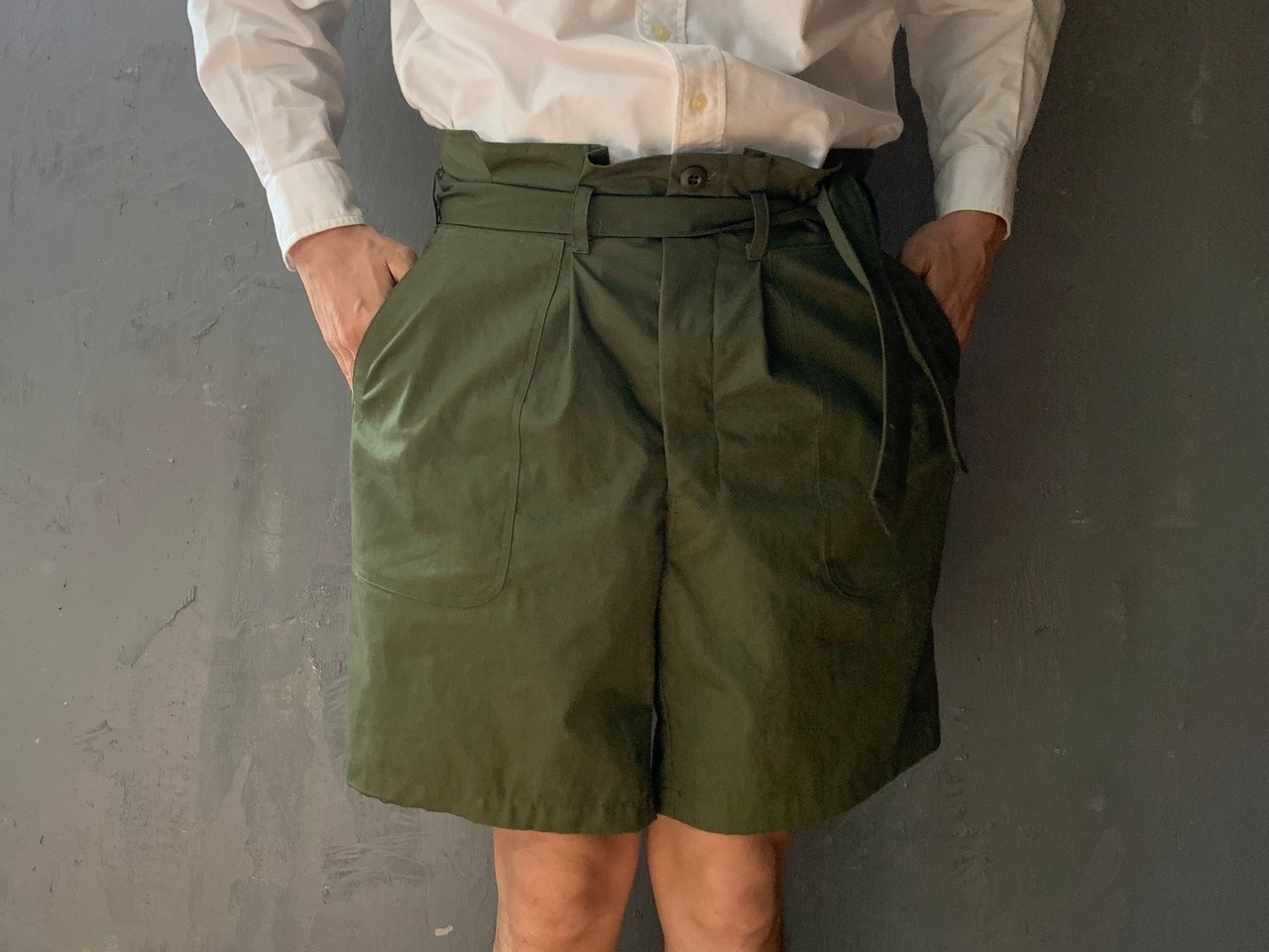 シルエットはイタリア軍のグルカショーツのサイズ感で作っており、履いた時にウエストがクシュッとギャザーができるようデザインしました。タックインをしてベルトでギュッとしめると独特な雰囲気がでます。