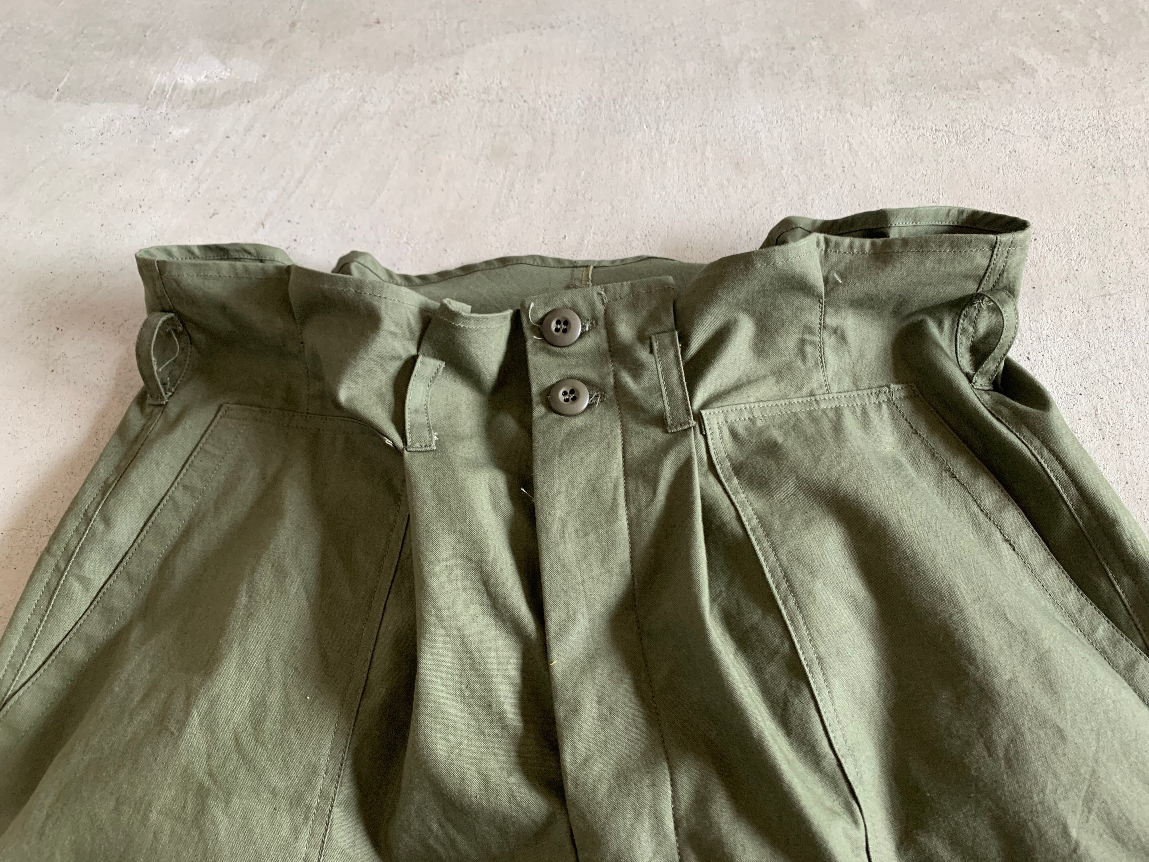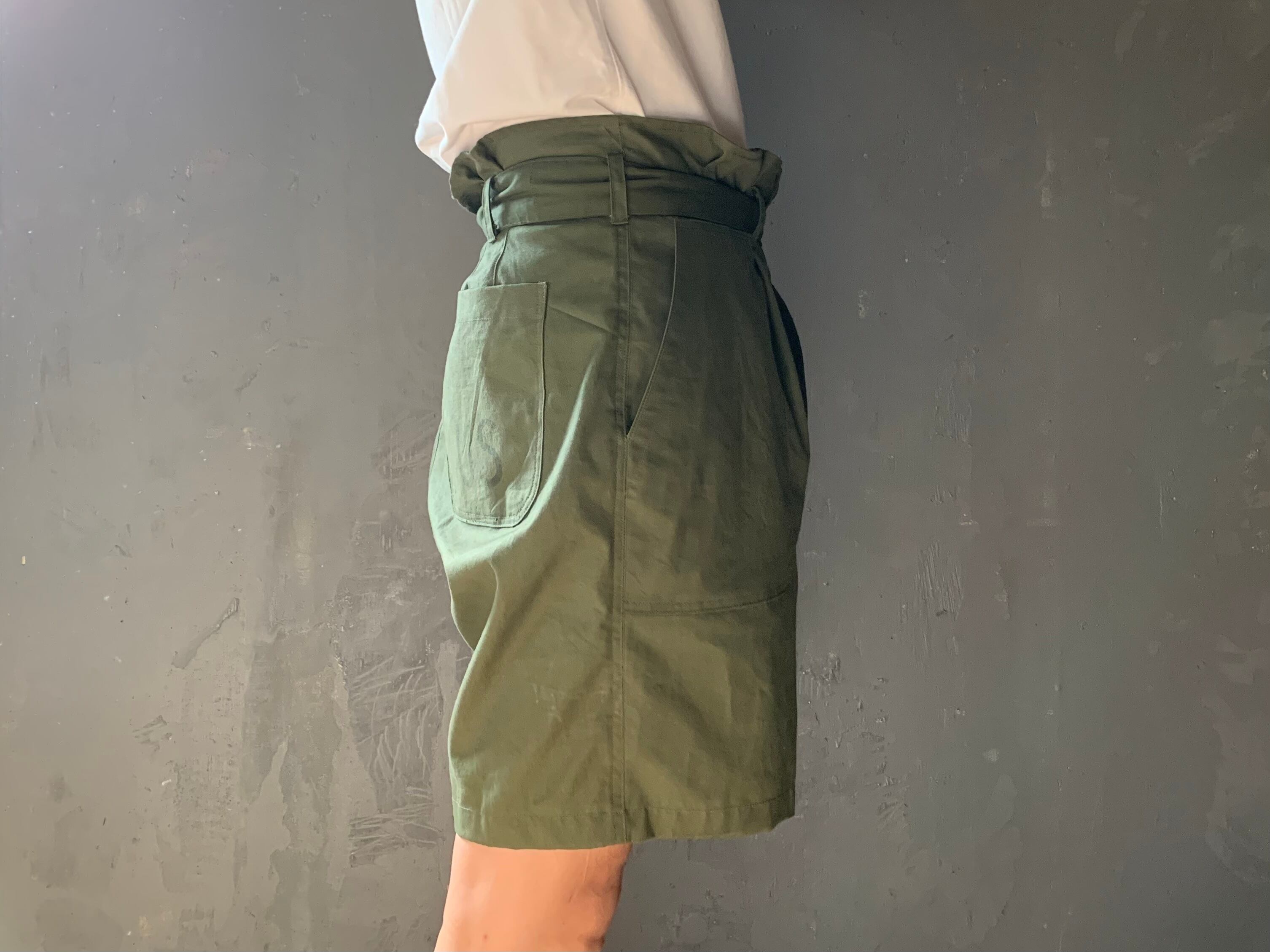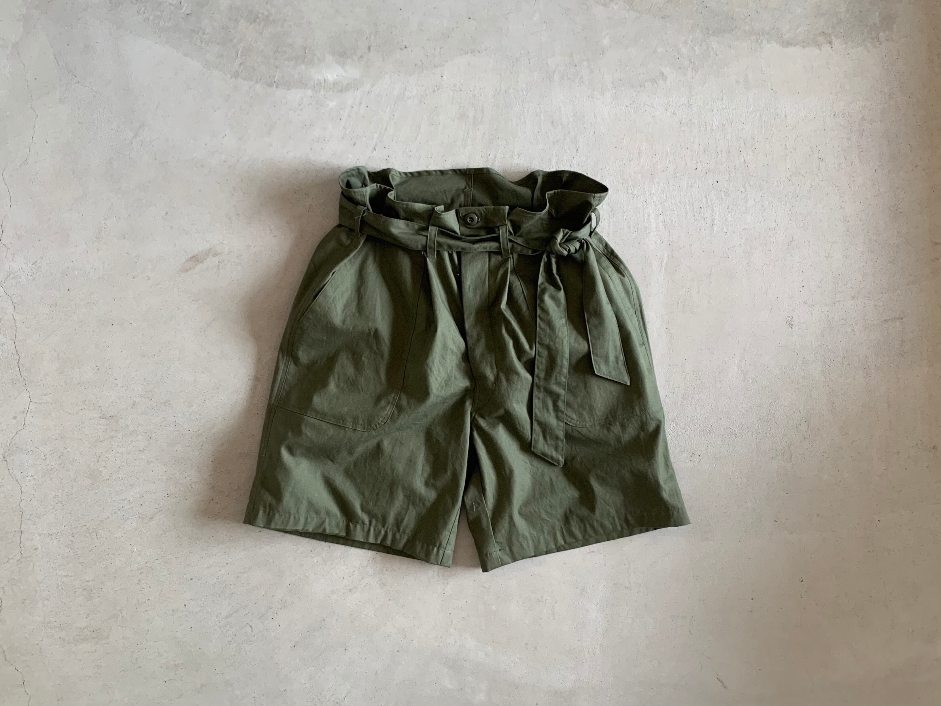 シルエットはイタリア軍のグルカショーツのサイズ感で作っており、履いた時にウエストがクシュッとギャザーができるようデザインしました。タックインをしてベルトでギュッとしめると独特な雰囲気がでます。