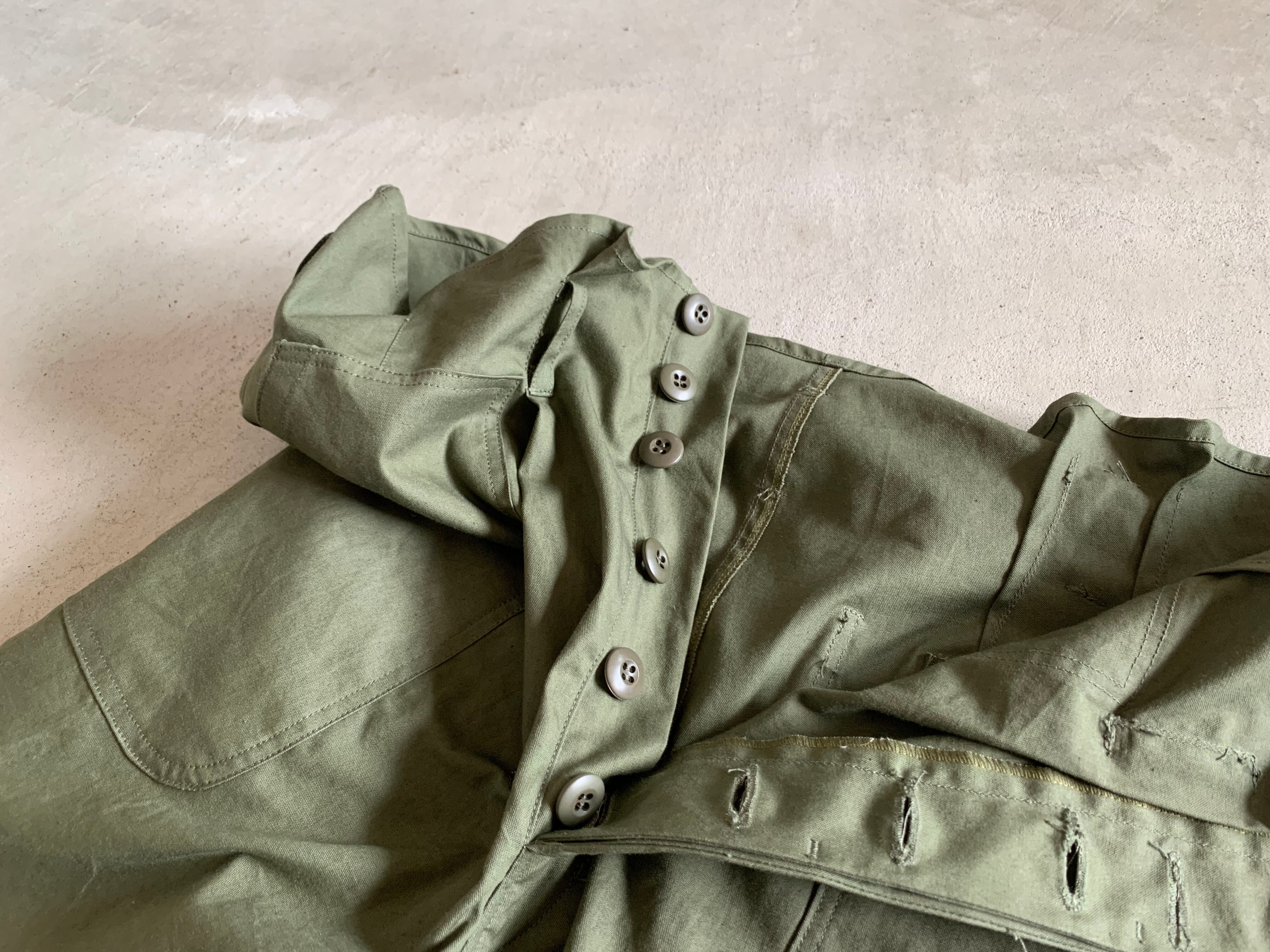 ボディーの生地は50年代、アメリカ軍のスリーピングバッグケース。ボタンは80年代、アメリカ軍のもの。糸は30番手の太めの綿糸で縫っているので、ミリタリー らしい武骨な雰囲気を醸し出しいます。