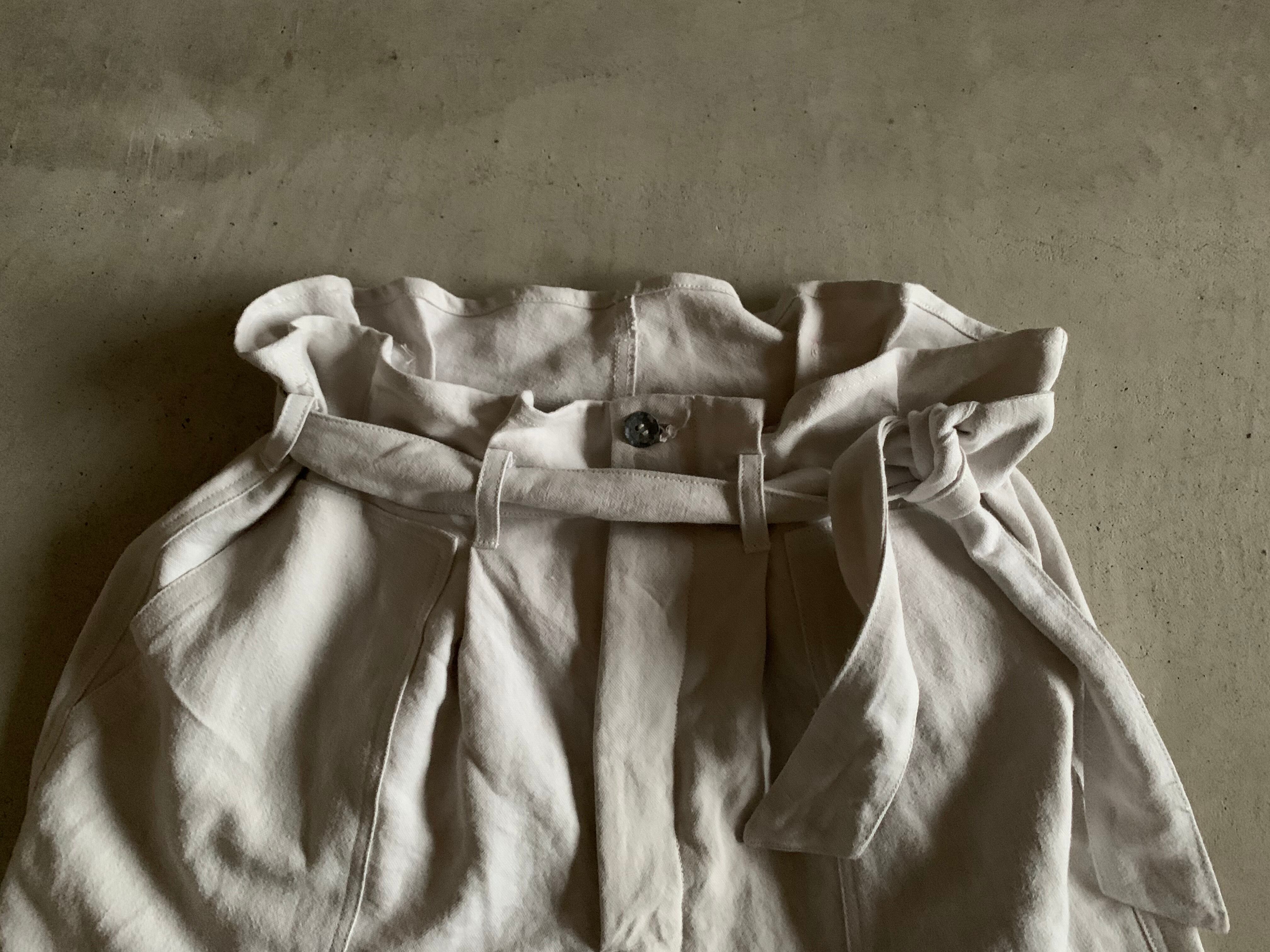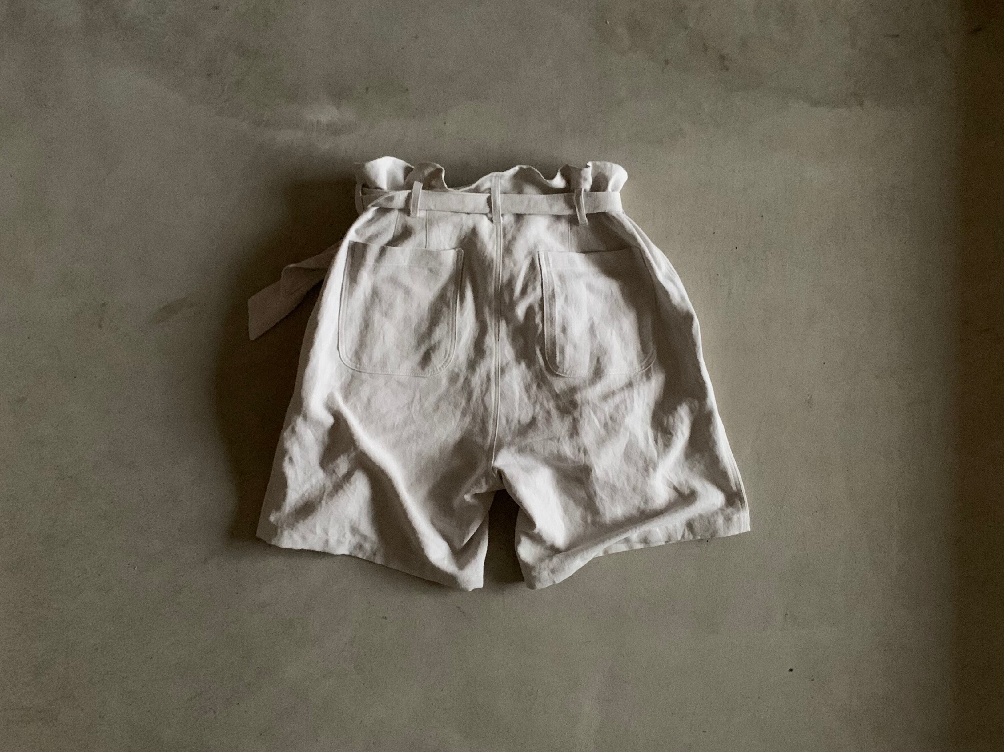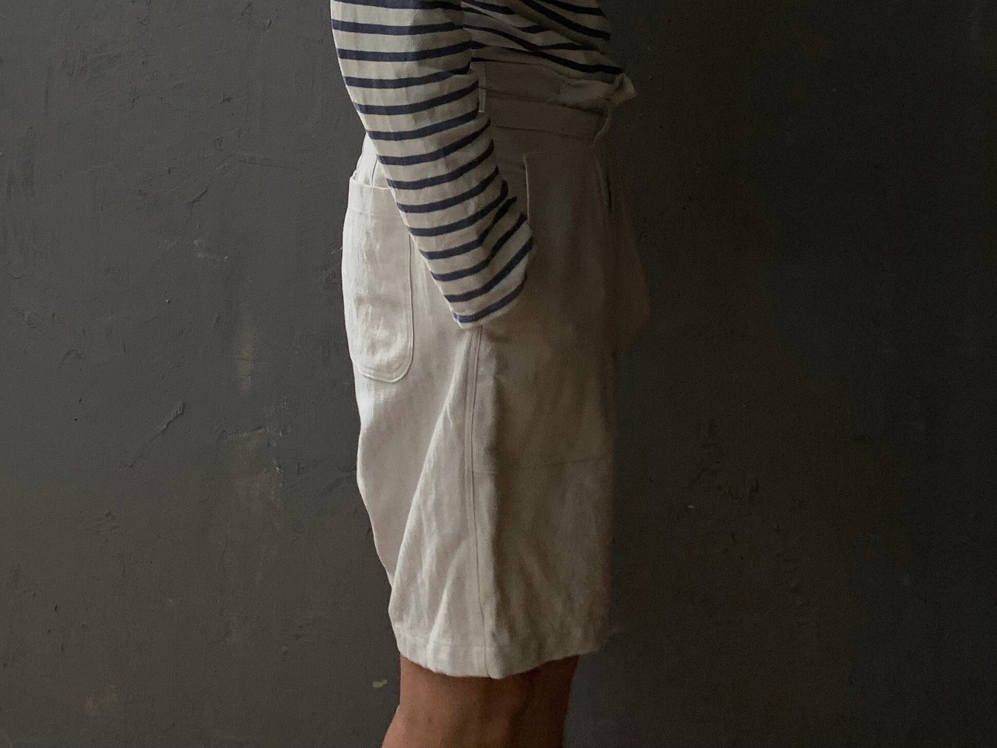 シルエットはイタリア軍のグルカショーツのサイズ感で作っており、履いた時にウエストがクシュッとギャザーができるようデザインしました。タックインをしてベルトでギュッとしめると独特な雰囲気がでます。