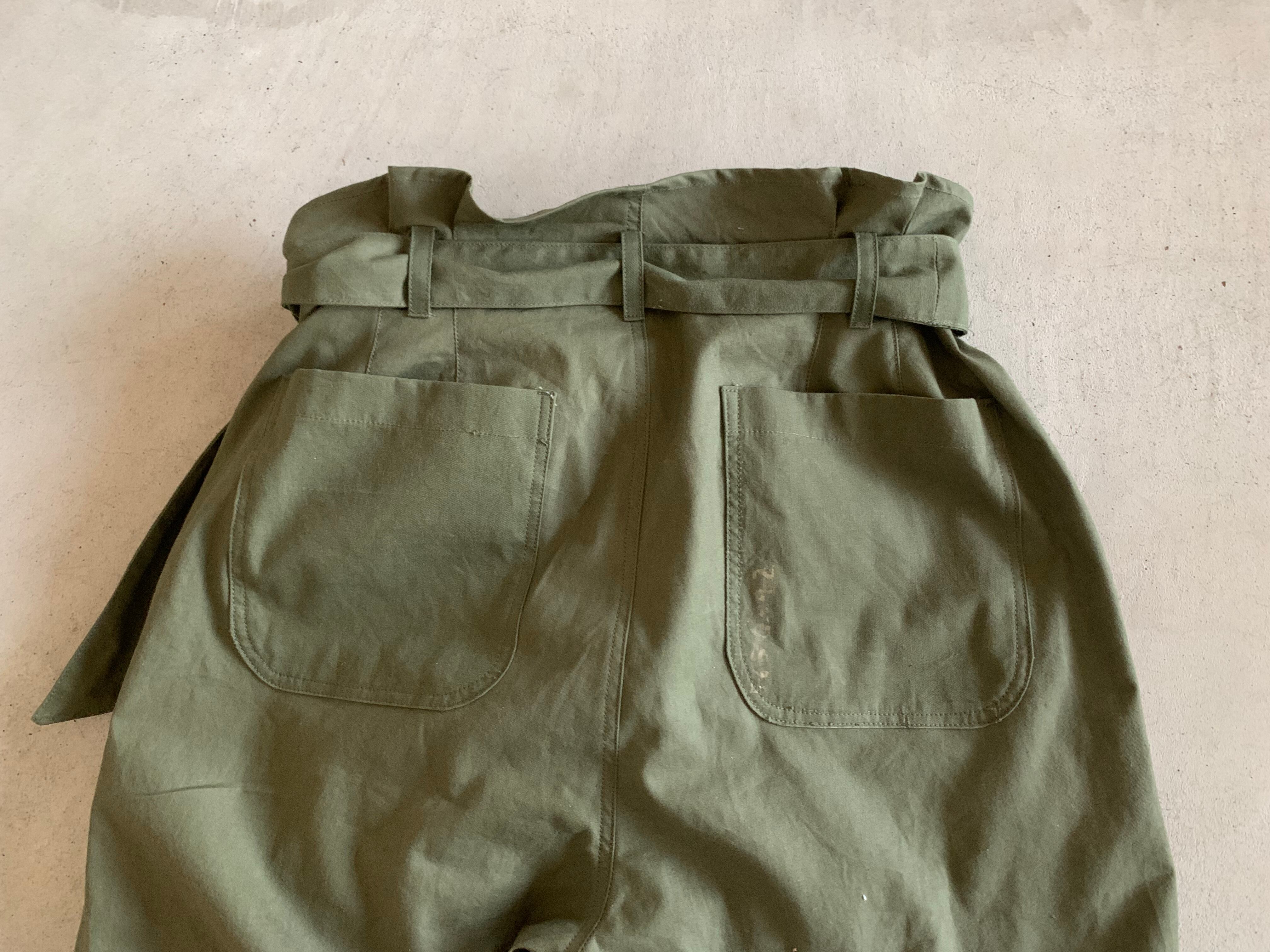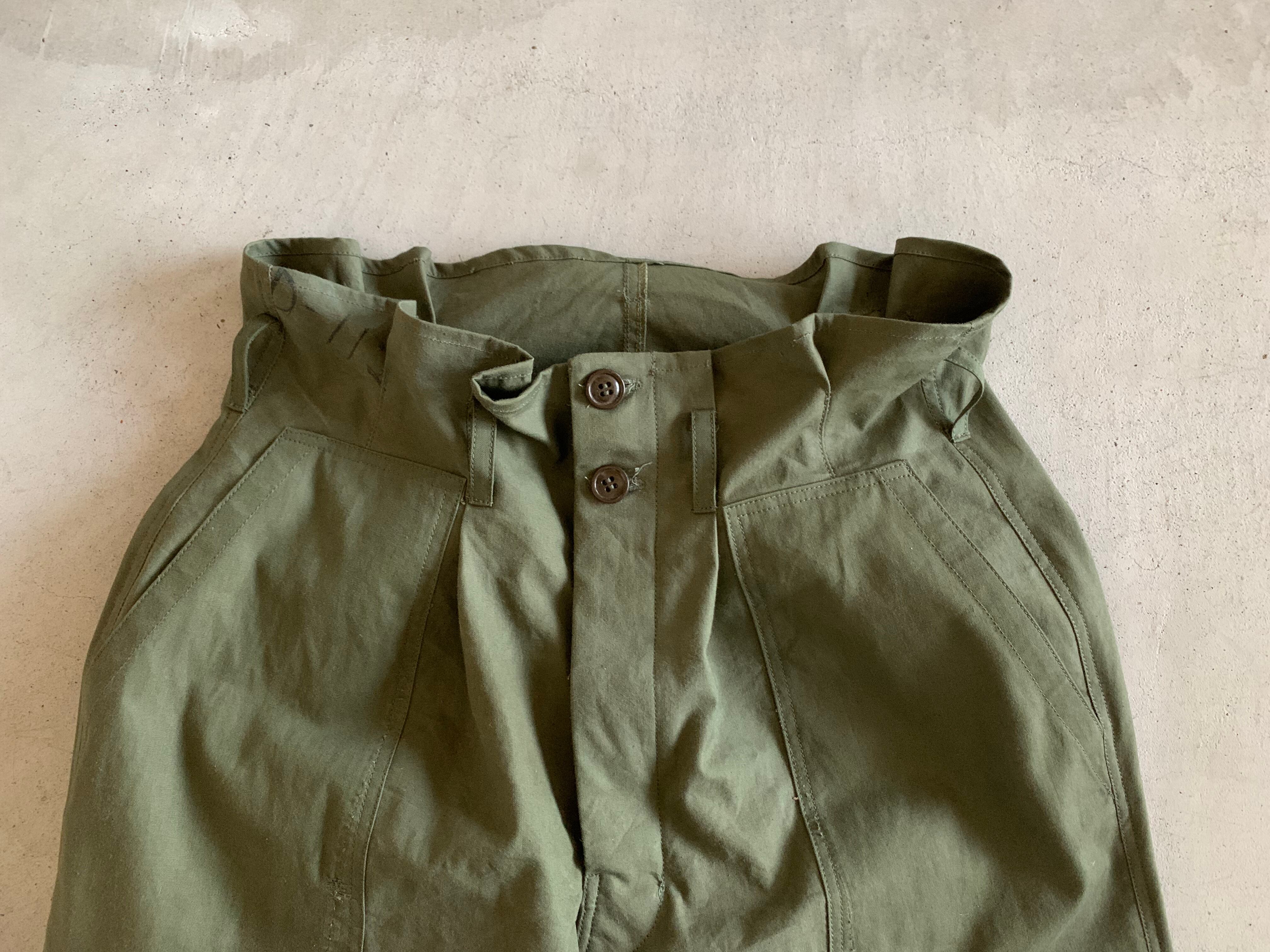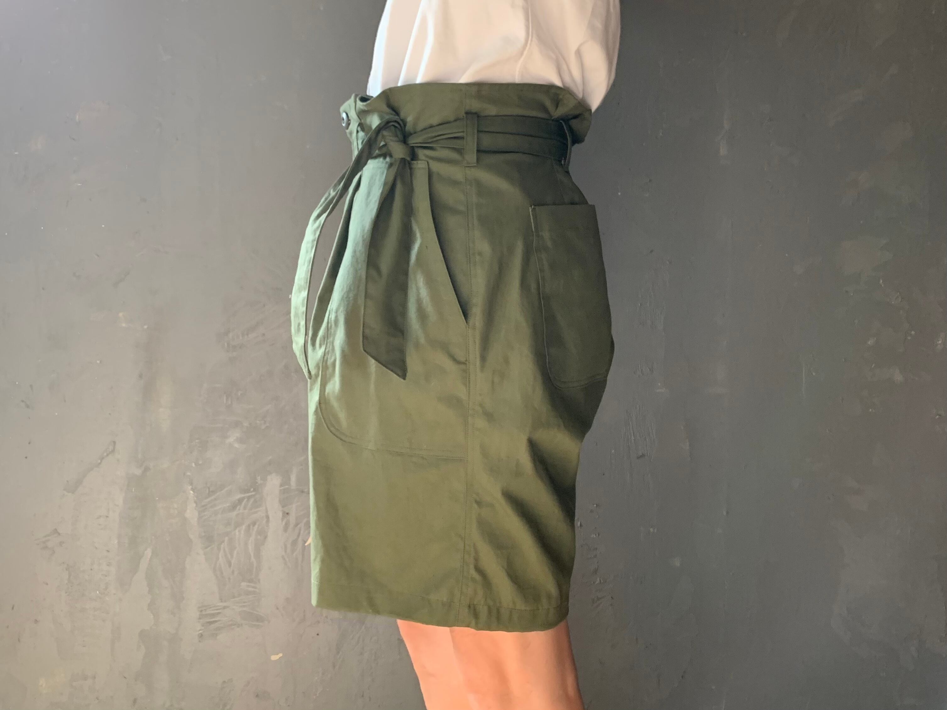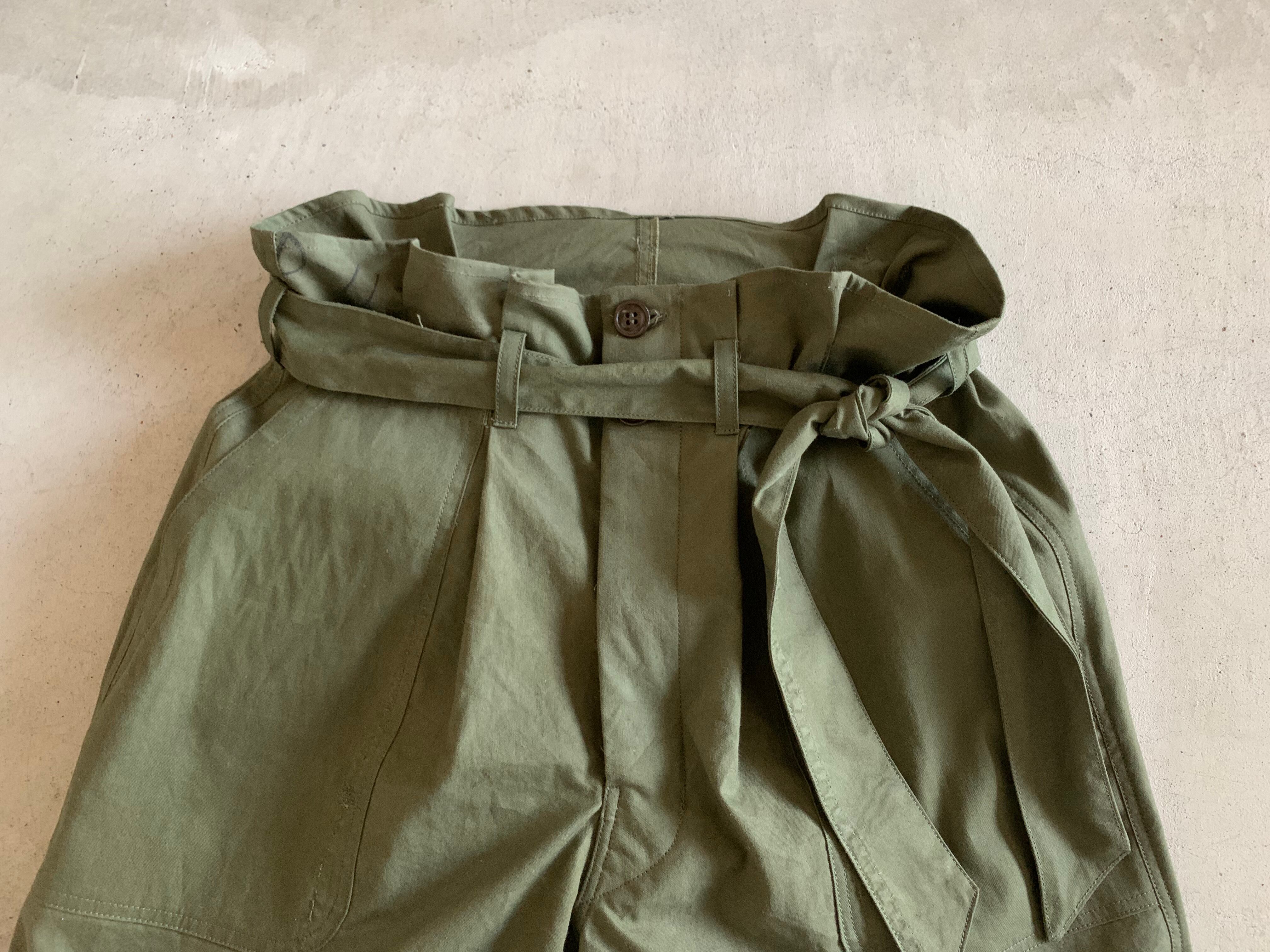 シルエットはイタリア軍のグルカショーツのサイズ感で作っており、履いた時にウエストがクシュッとギャザーができるようデザインしました。タックインをしてベルトでギュッとしめると独特な雰囲気がでます。