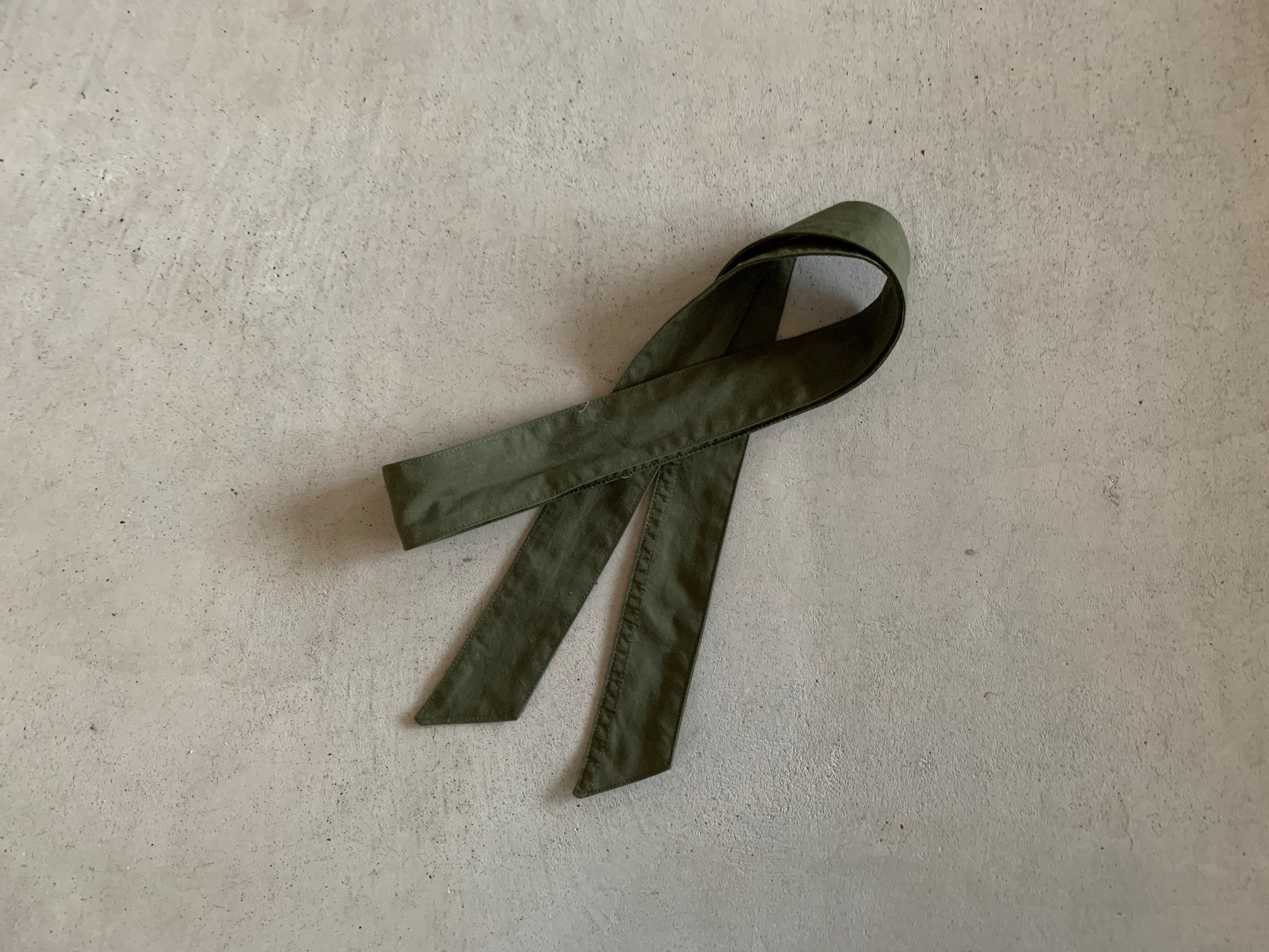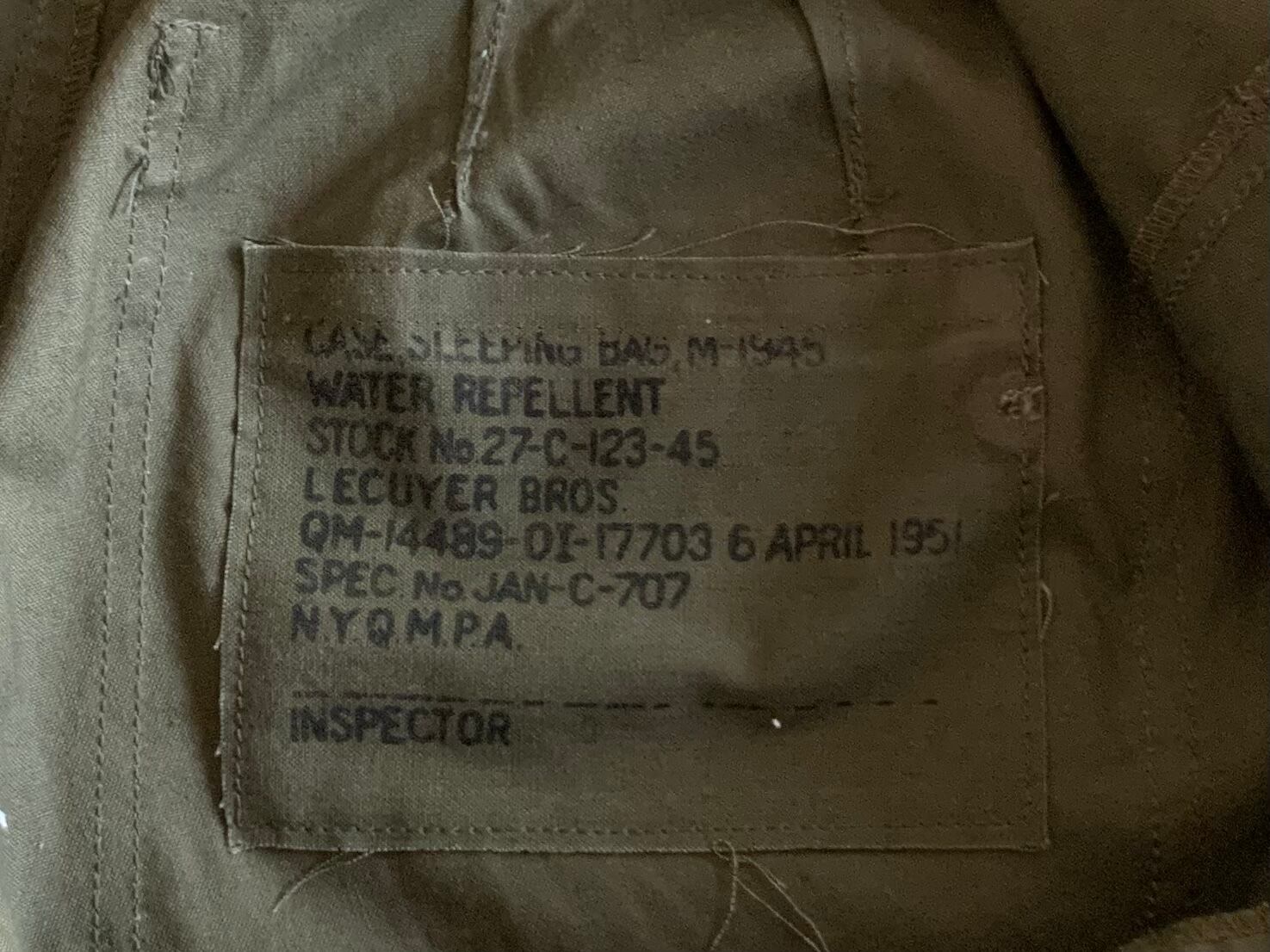 内側にはスリーピングバッグケースにプリントされていたミルスペックを切り取ってつけています。1951年4月6日に納入された個体というのがわかります。共生地で作った帯ベルトも付属します。