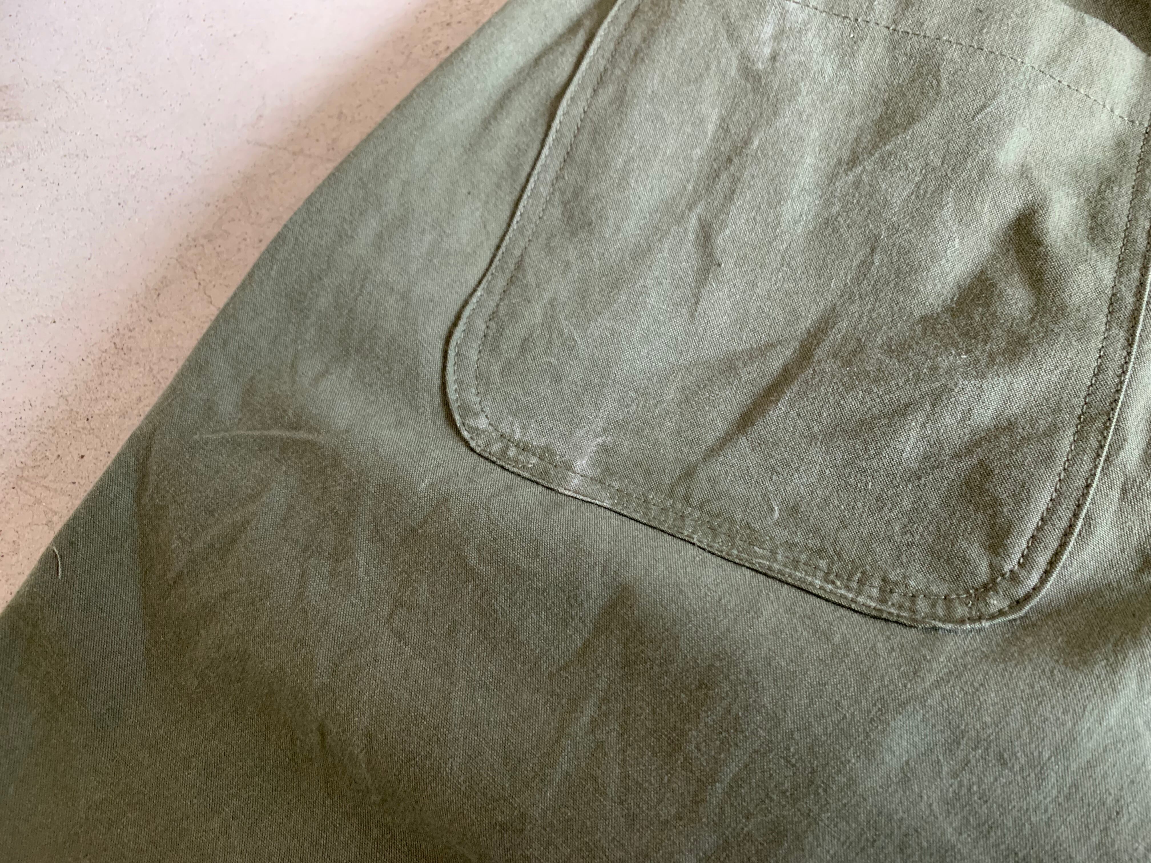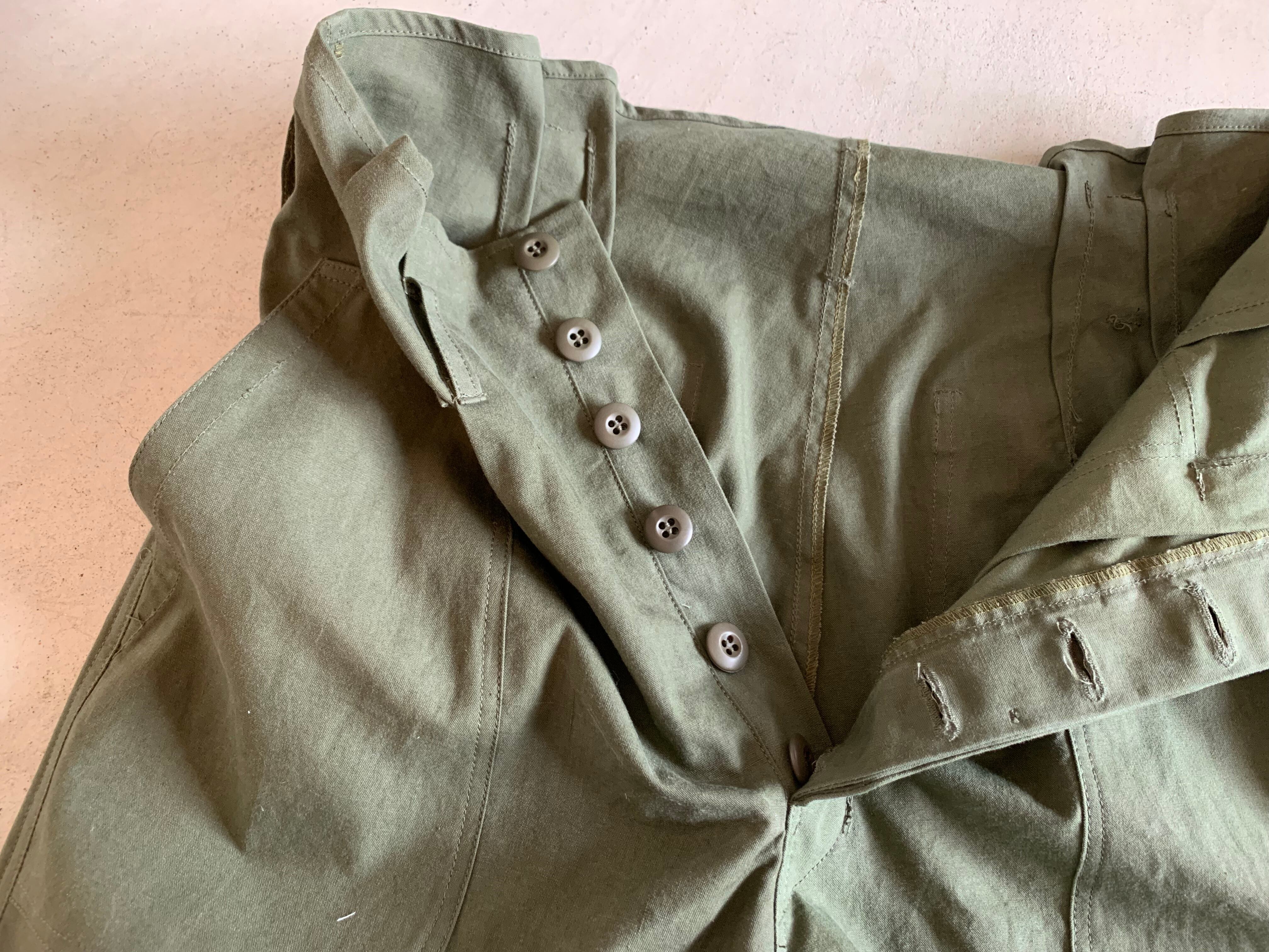 ボディーの生地は50年代、アメリカ軍のスリーピングバッグケース。ボタンは80年代、アメリカ軍のもの。糸は30番手の太めの綿糸で縫っているので、ミリタリー らしい武骨な雰囲気を醸し出しいます。