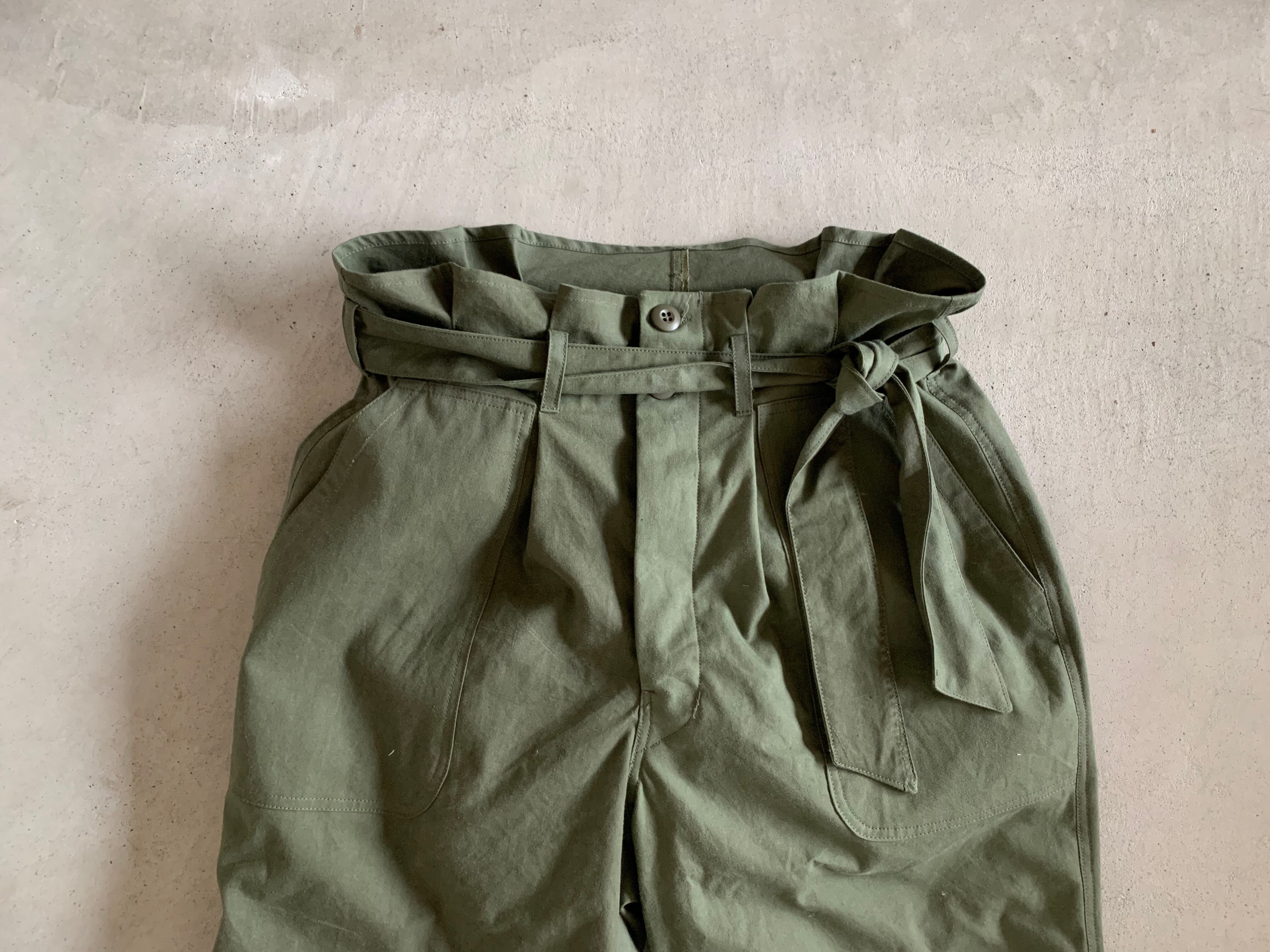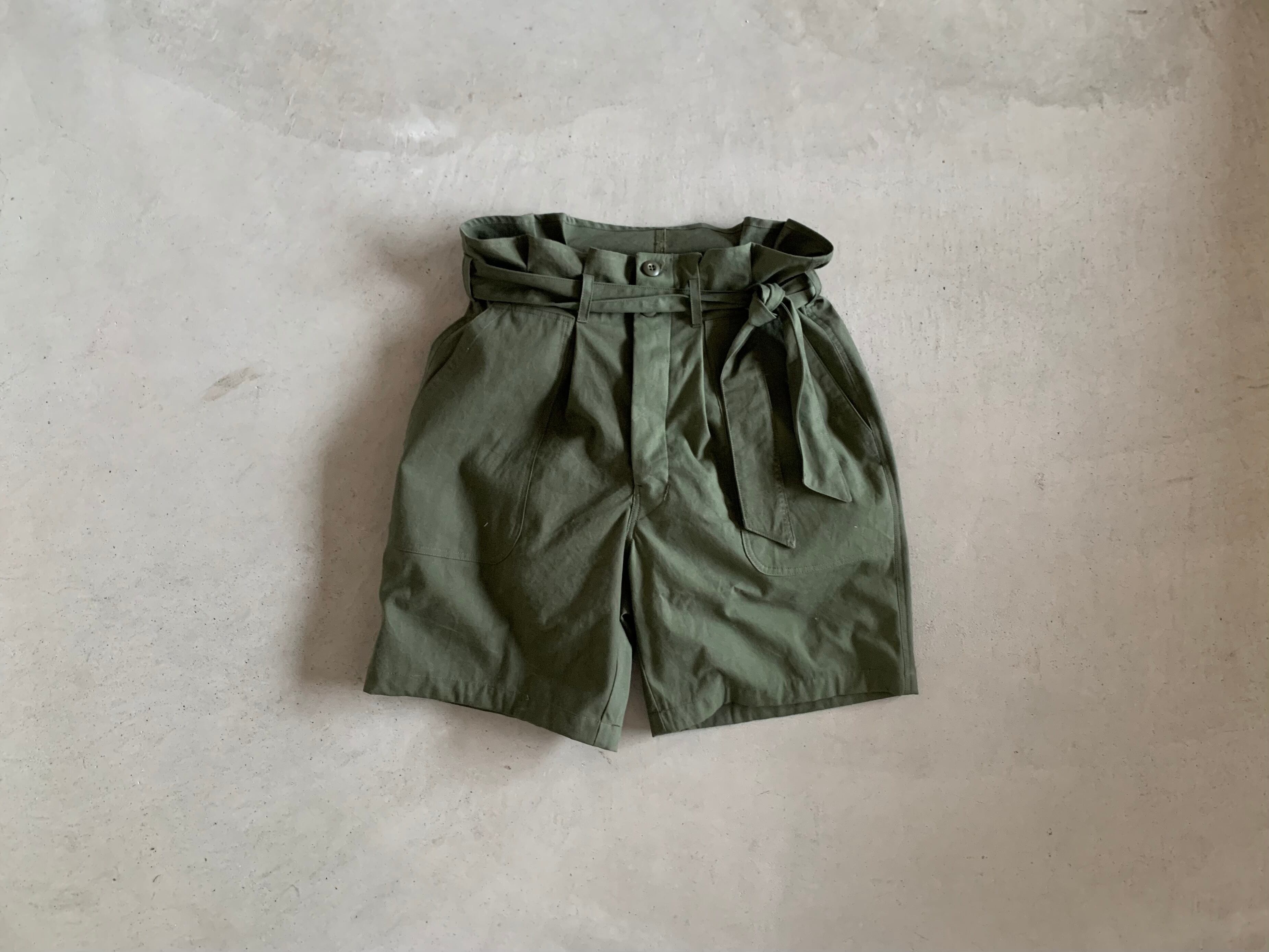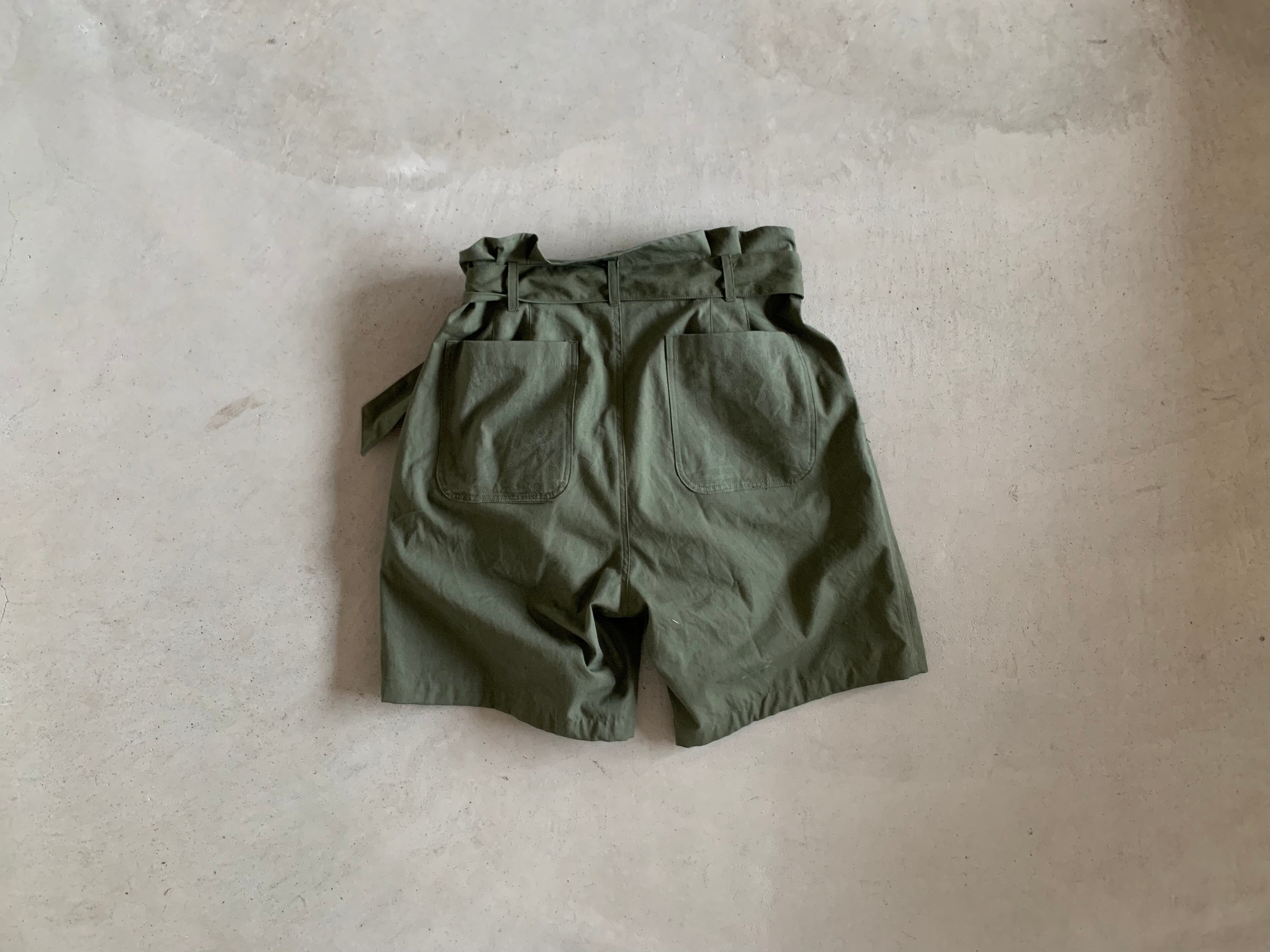 シルエットはイタリア軍のグルカショーツのサイズ感で作っており、履いた時にウエストがクシュッとギャザーができるようデザインしました。タックインをしてベルトでギュッとしめると独特な雰囲気がでます。