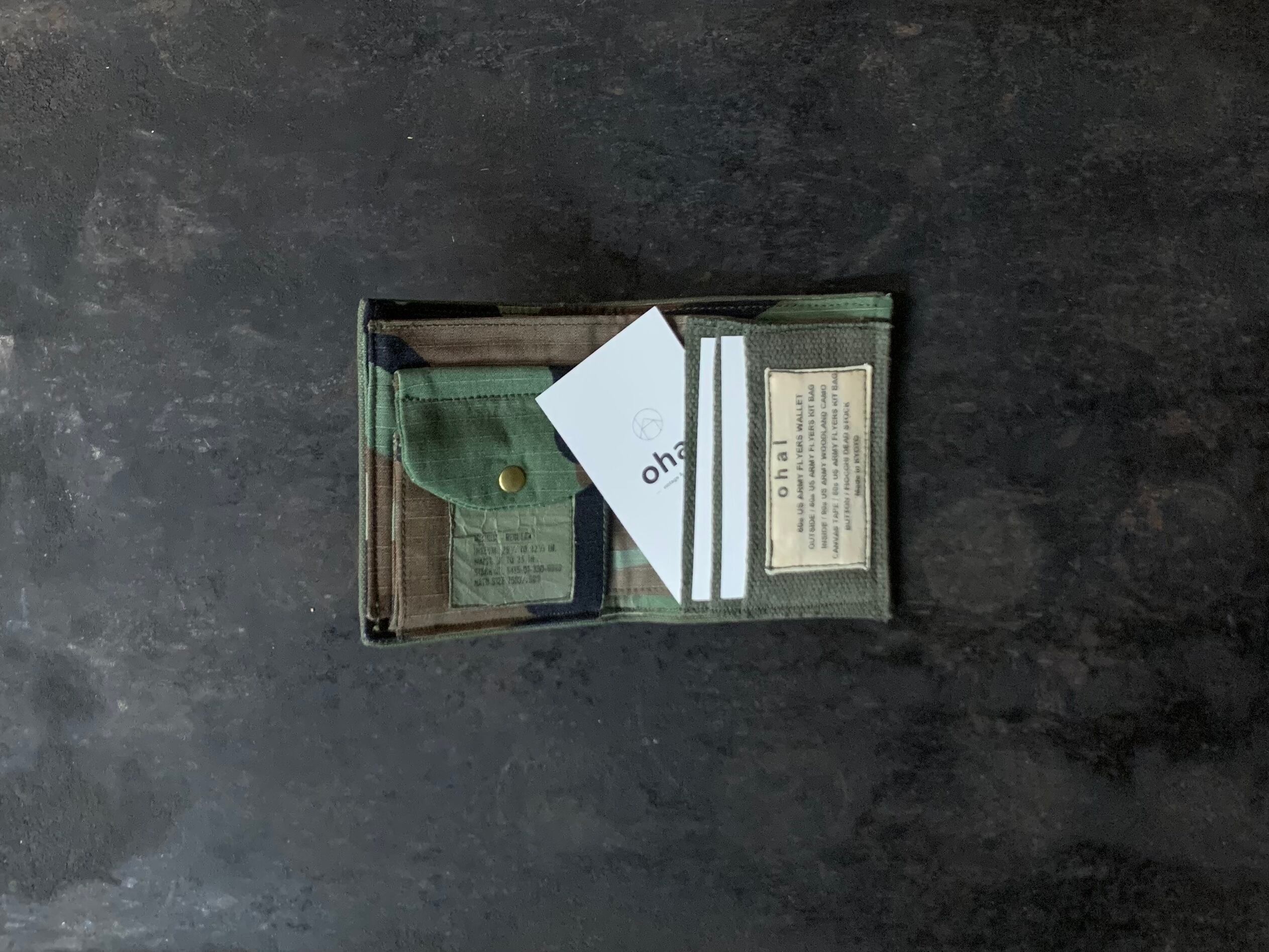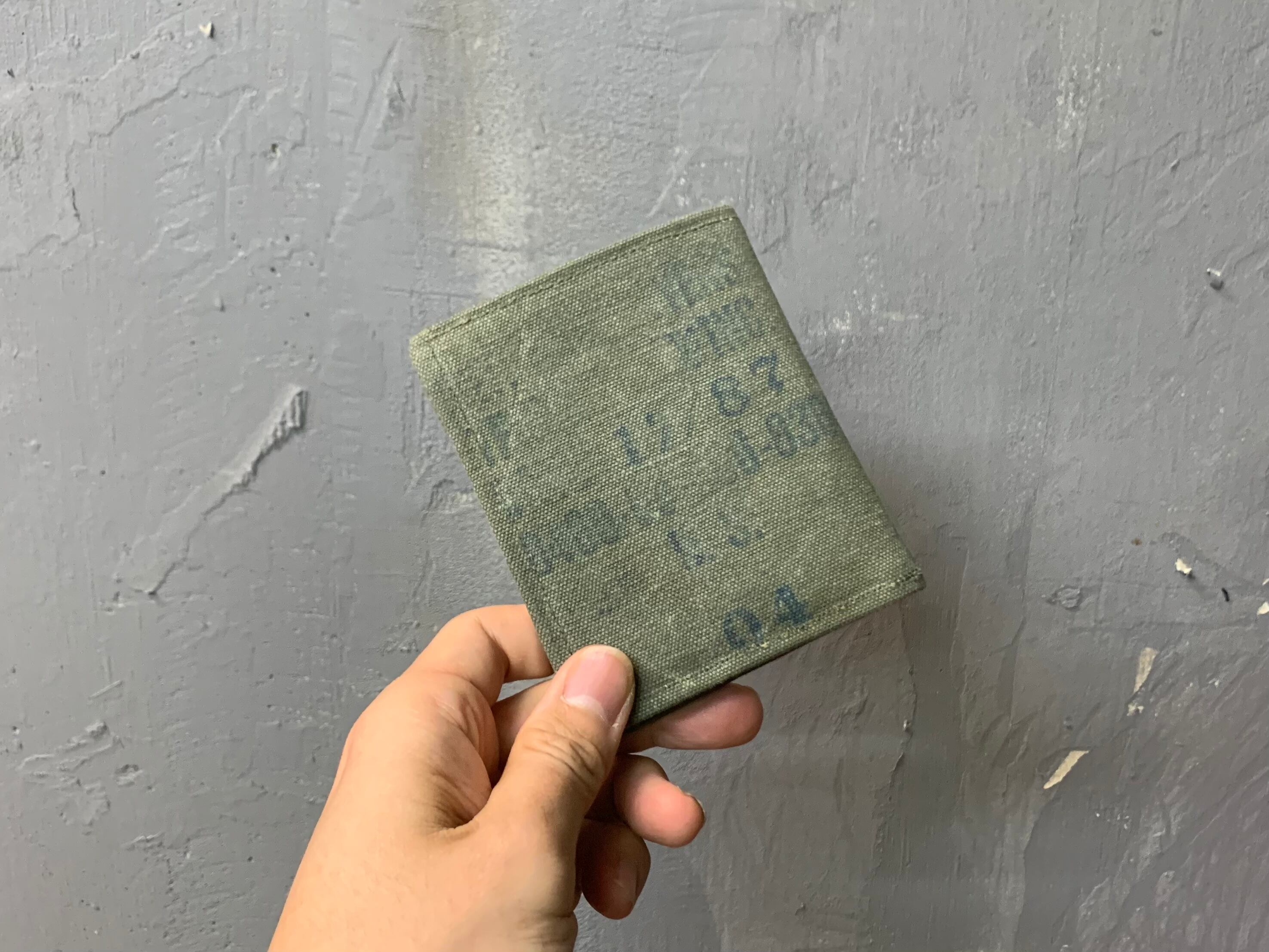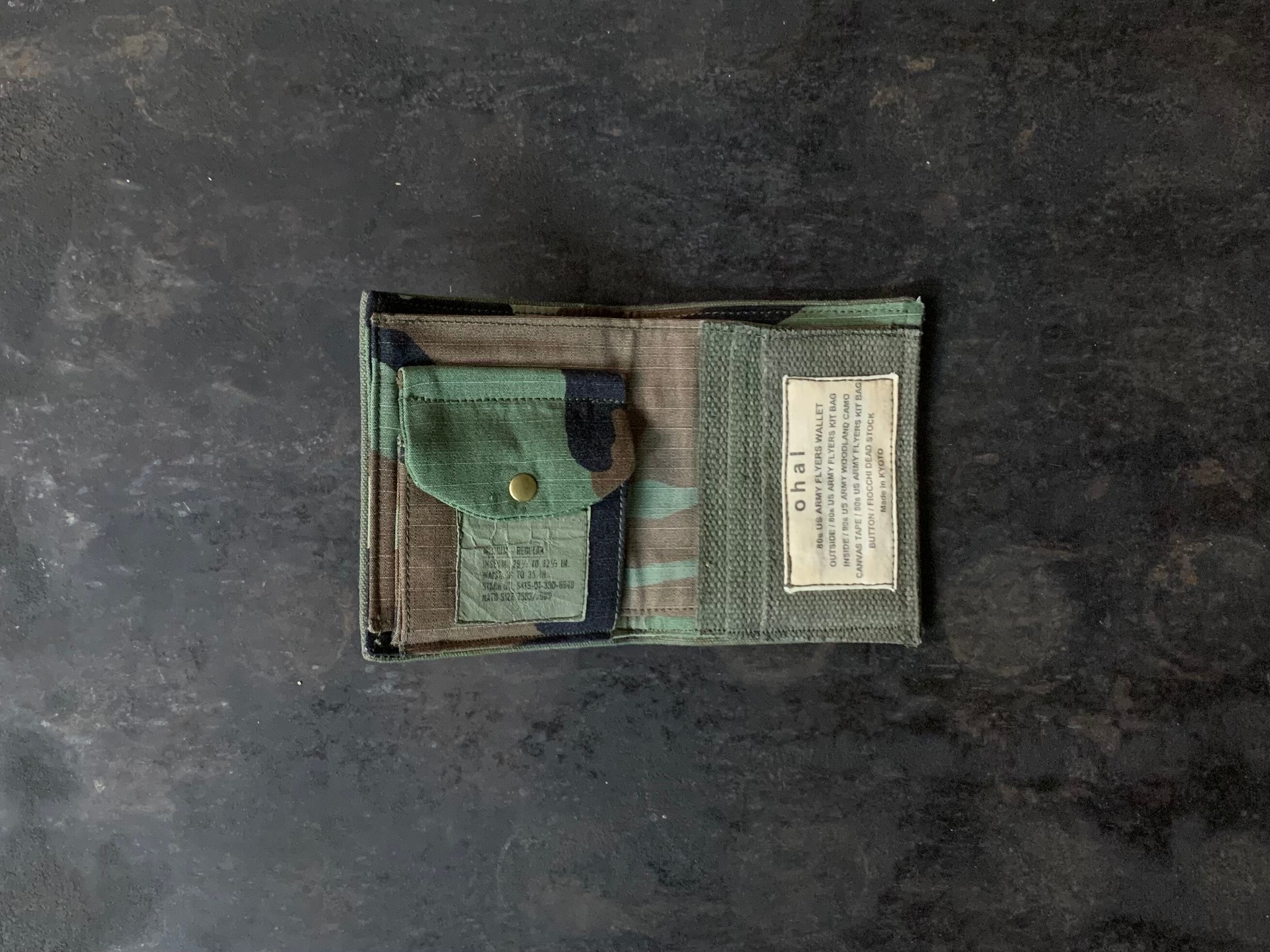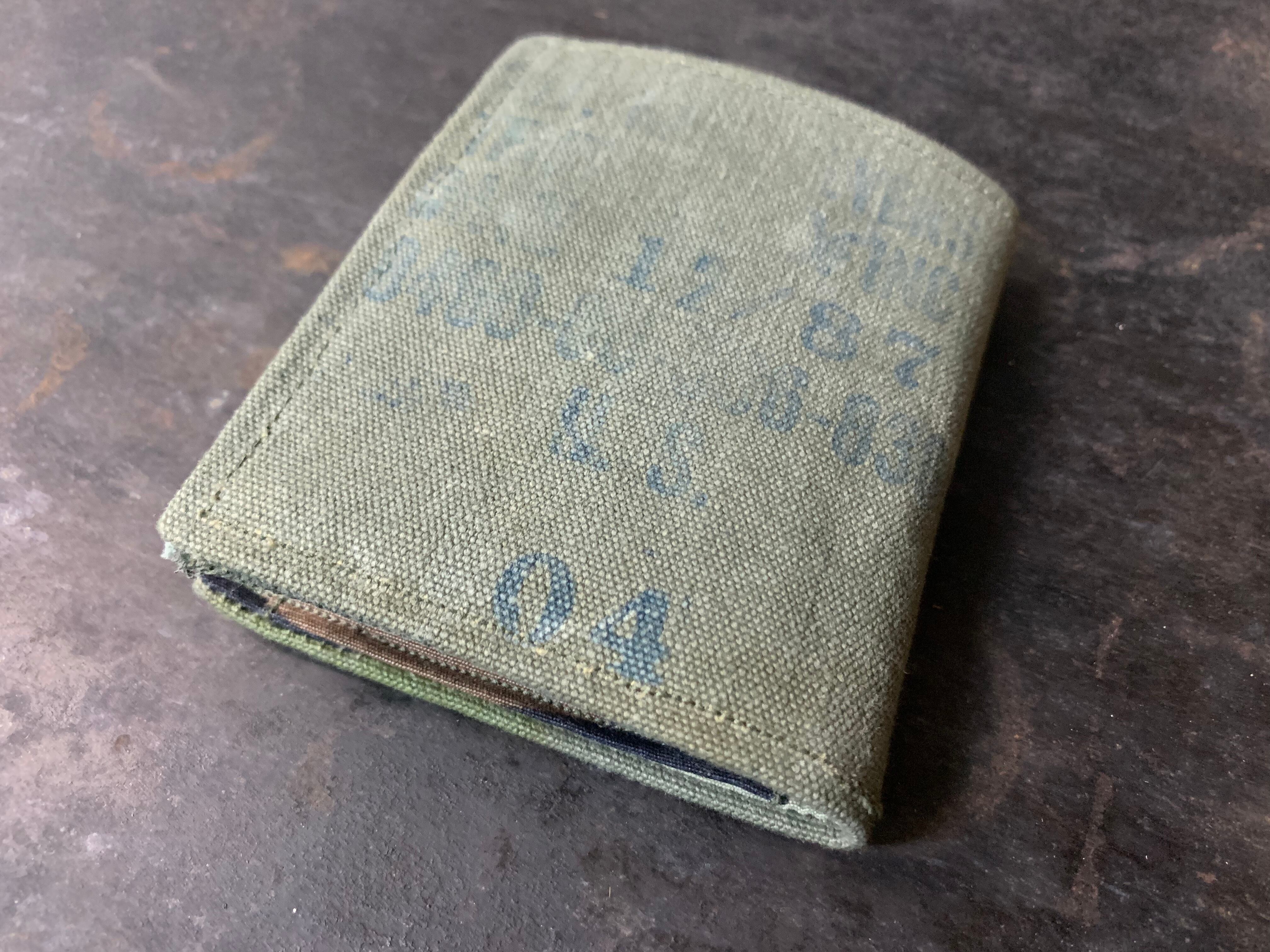 外側は80年代、アメリカ軍のパイロットに支給されるフライヤーズキットバッグの生地を使用。内側は90年代、米軍のファティーグパンツの生地です。コインポケットに、ファティーグパンツについていたタグをつけています。