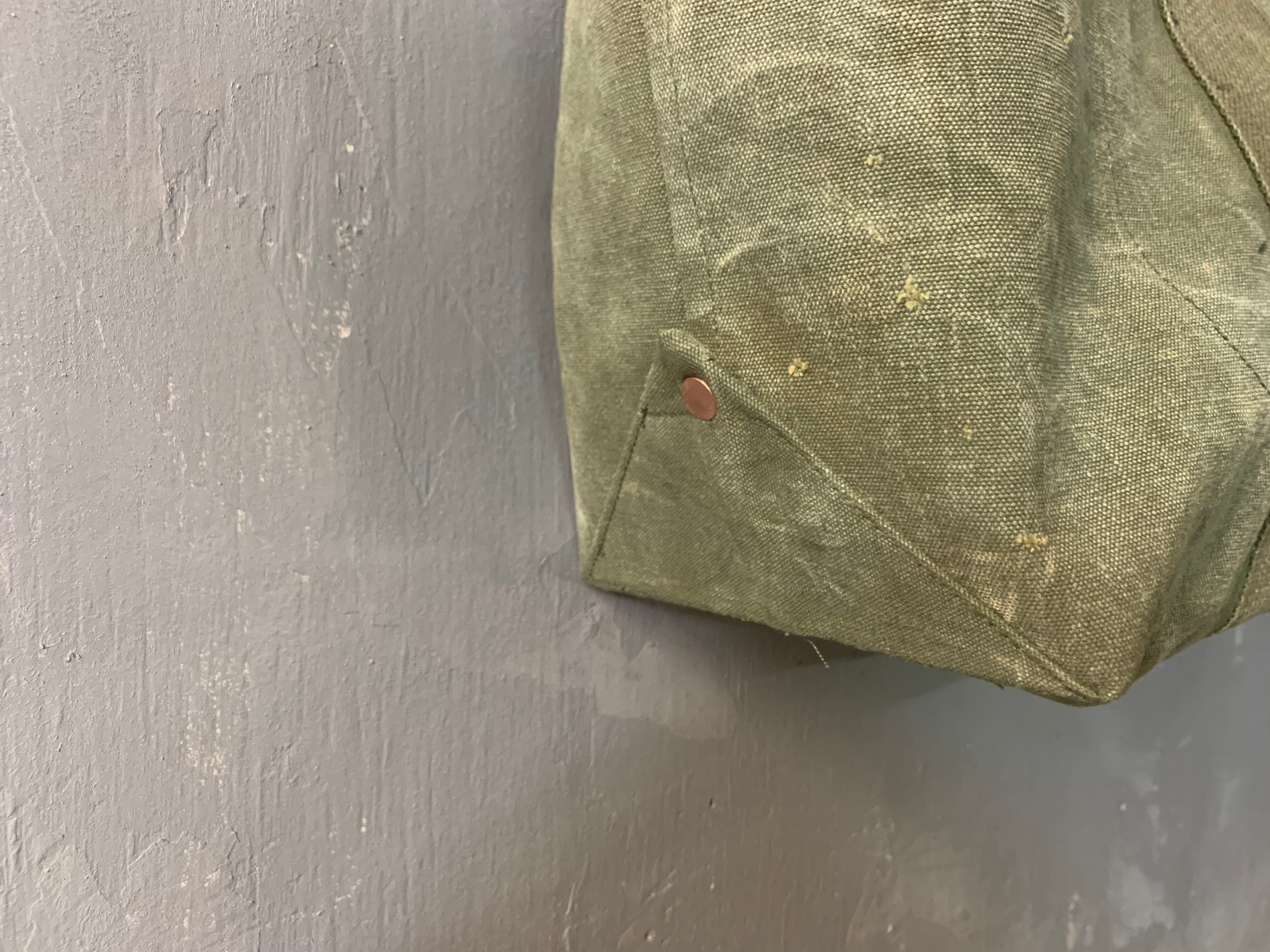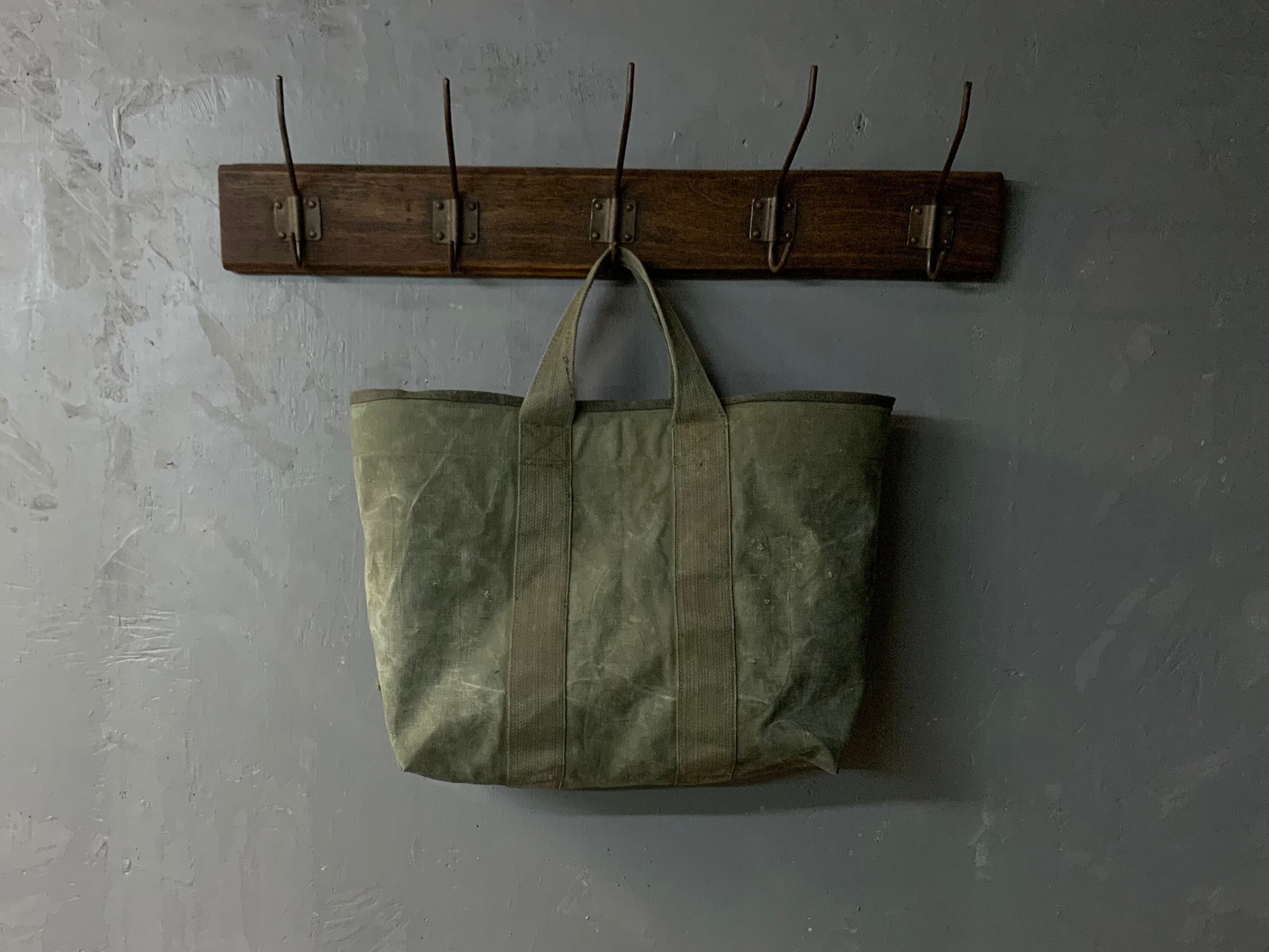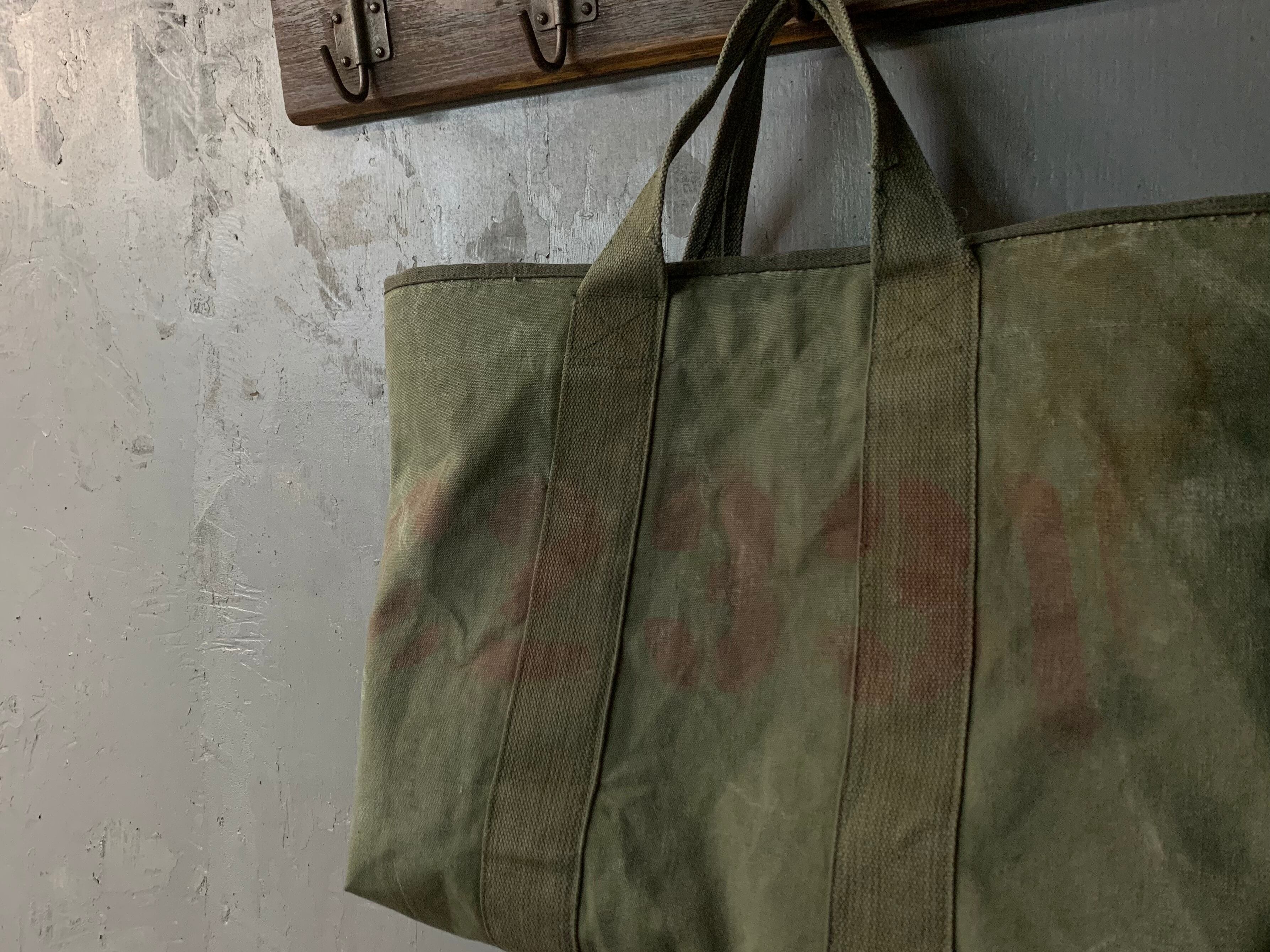 80年代の米軍、フライヤーズキットバッグを解体し、トートバッグを作成しました。開口部のパイピングテープもこのバッグに使われていた物を外し、付け直しております。開口部内側の補強用のキャンバステープは、50年代のアメリカ軍の物になります。