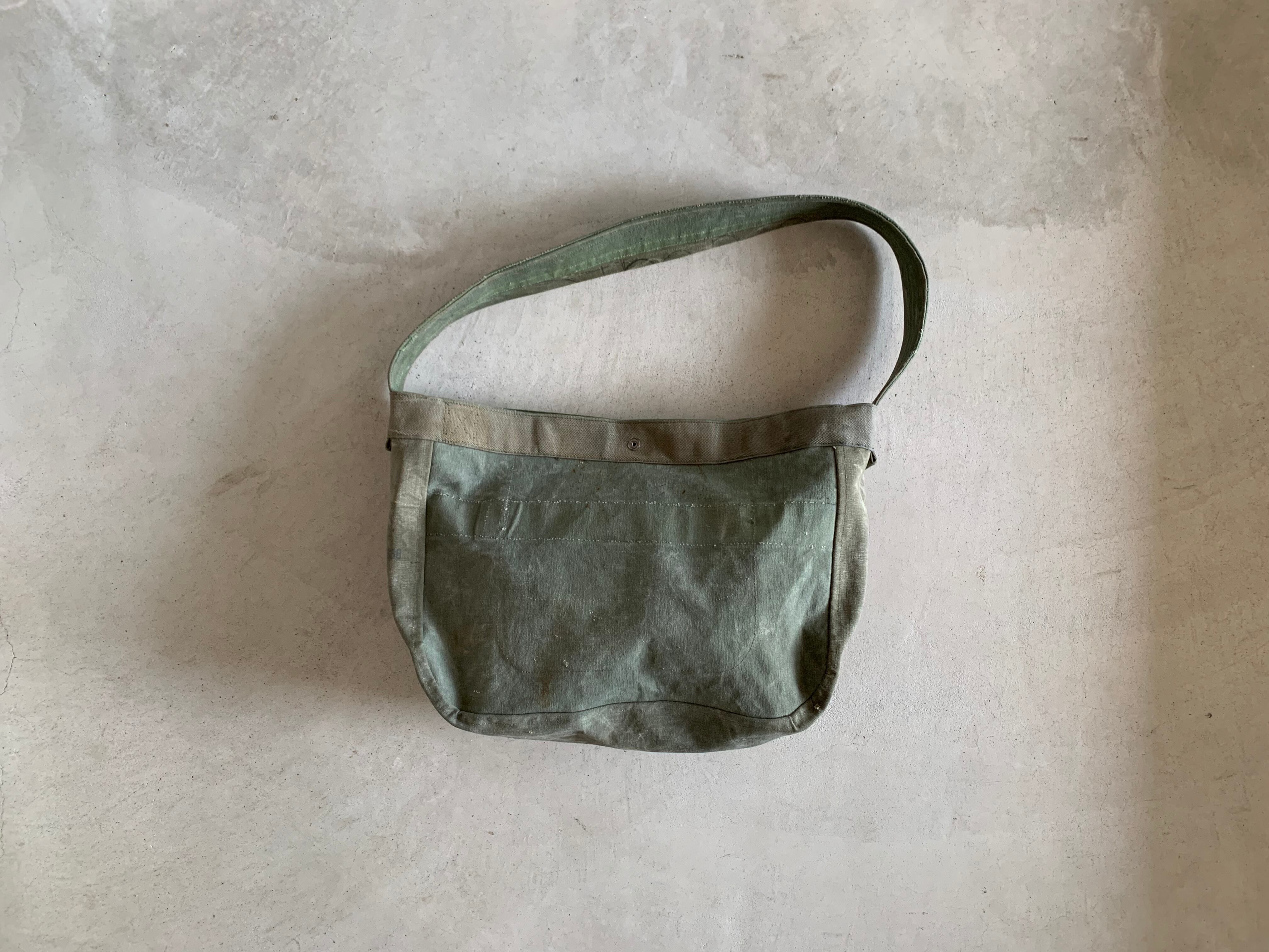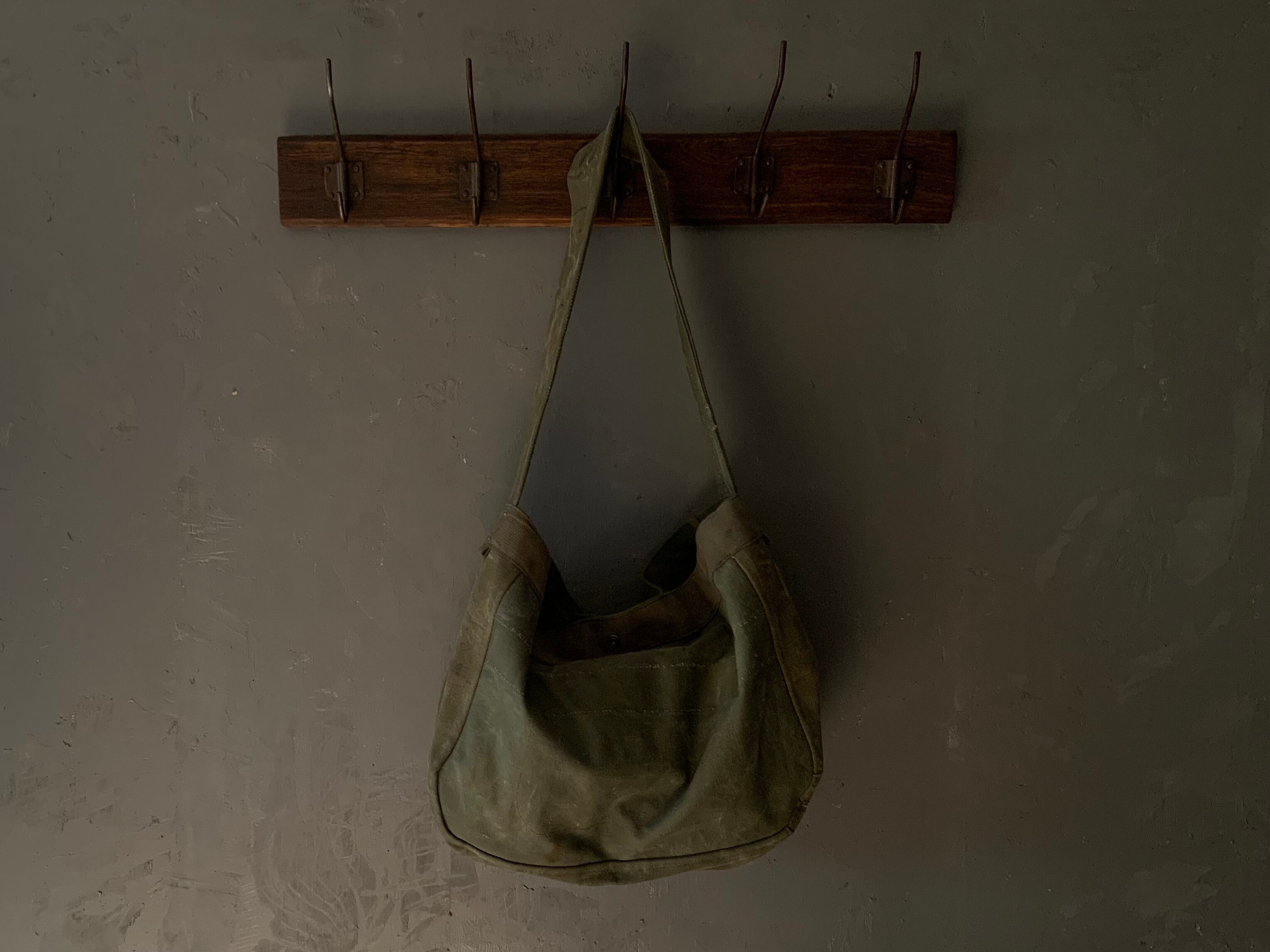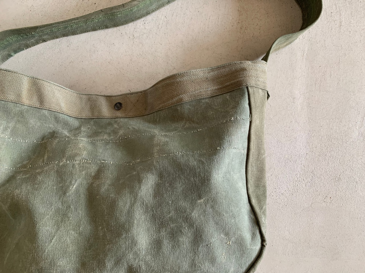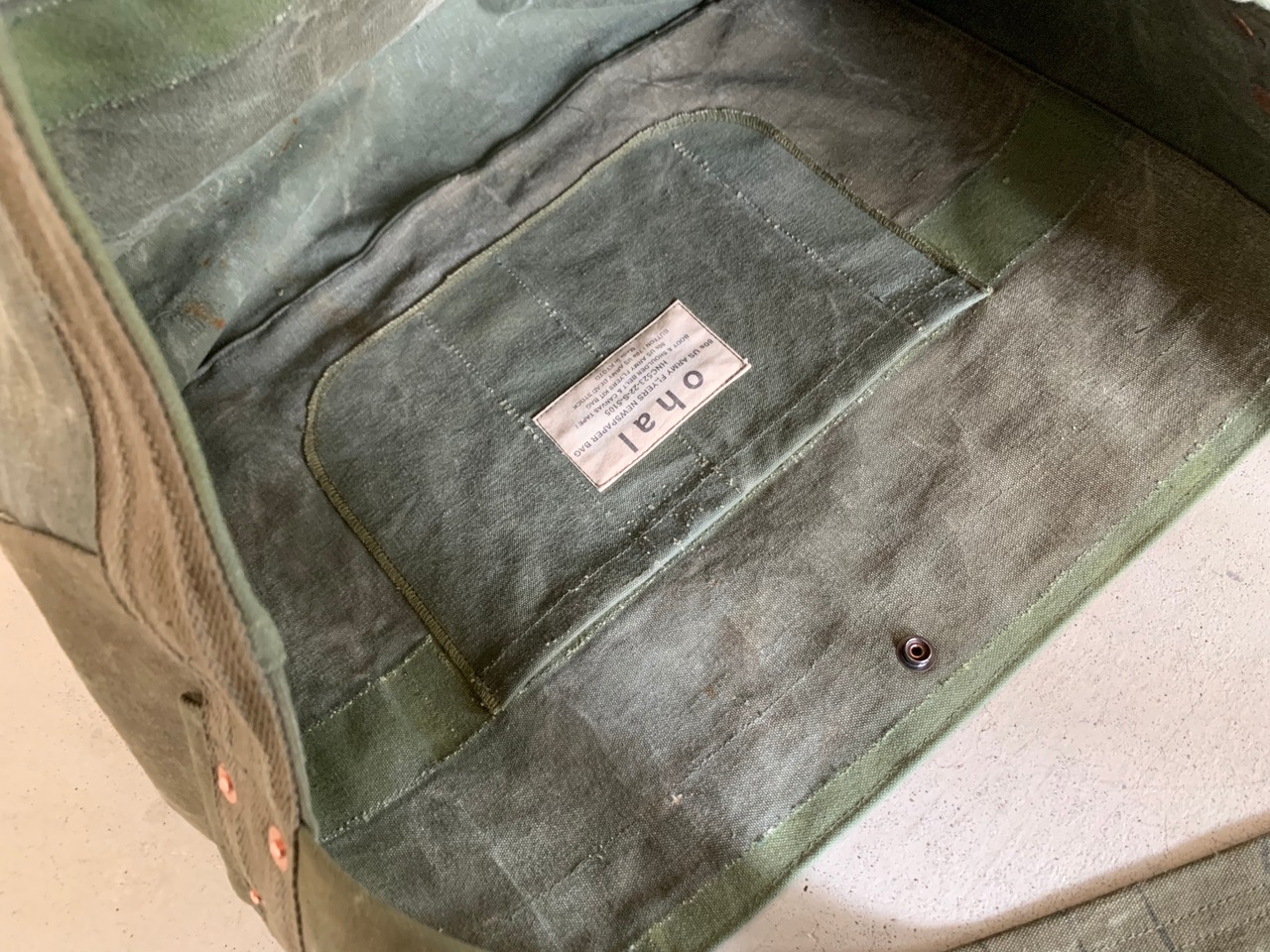ボディーの生地は80年代頃、アメリカ軍のフライヤーズキットバッグ。サイドに当時のステンシルが残っており80年代に納入されたことがわかります。素材はコットンキャンバスで使い古してグレーがかったカーキ色がヴィンテージの雰囲気を醸し出してくれます。開口部をぐるりと巻いて、補強しているキャンバステープも同じフライヤーズキットバッグから取り出したものです。