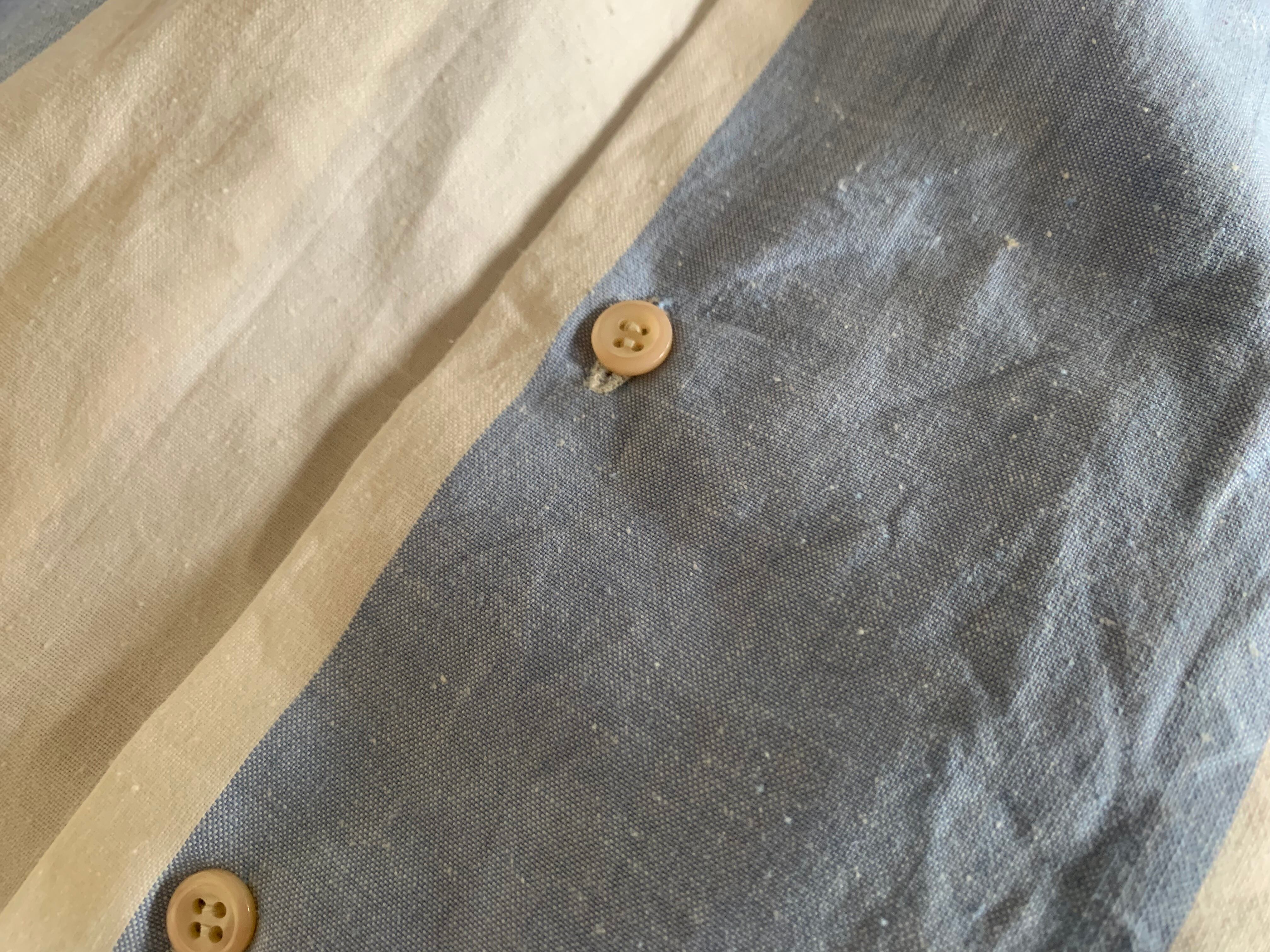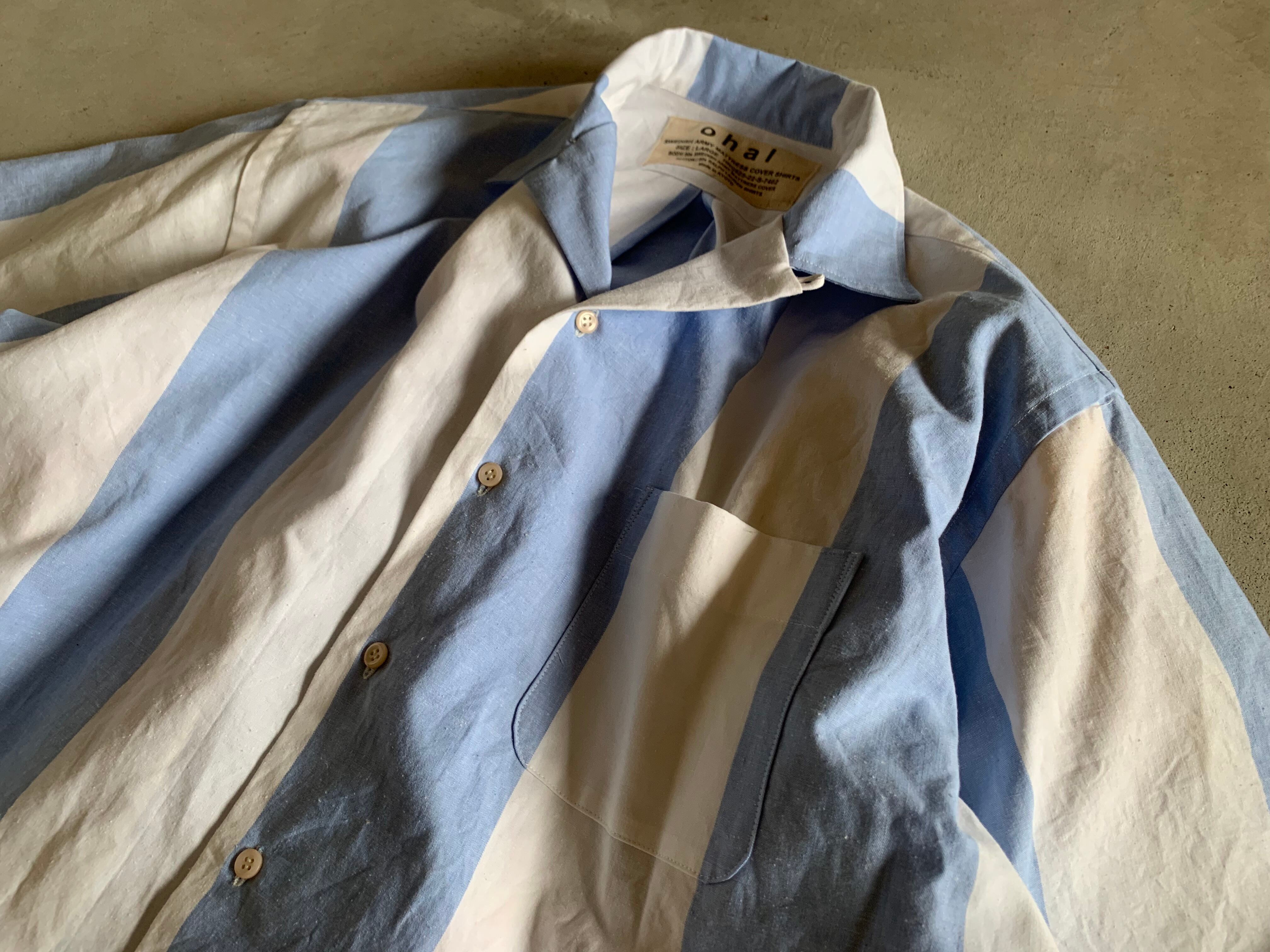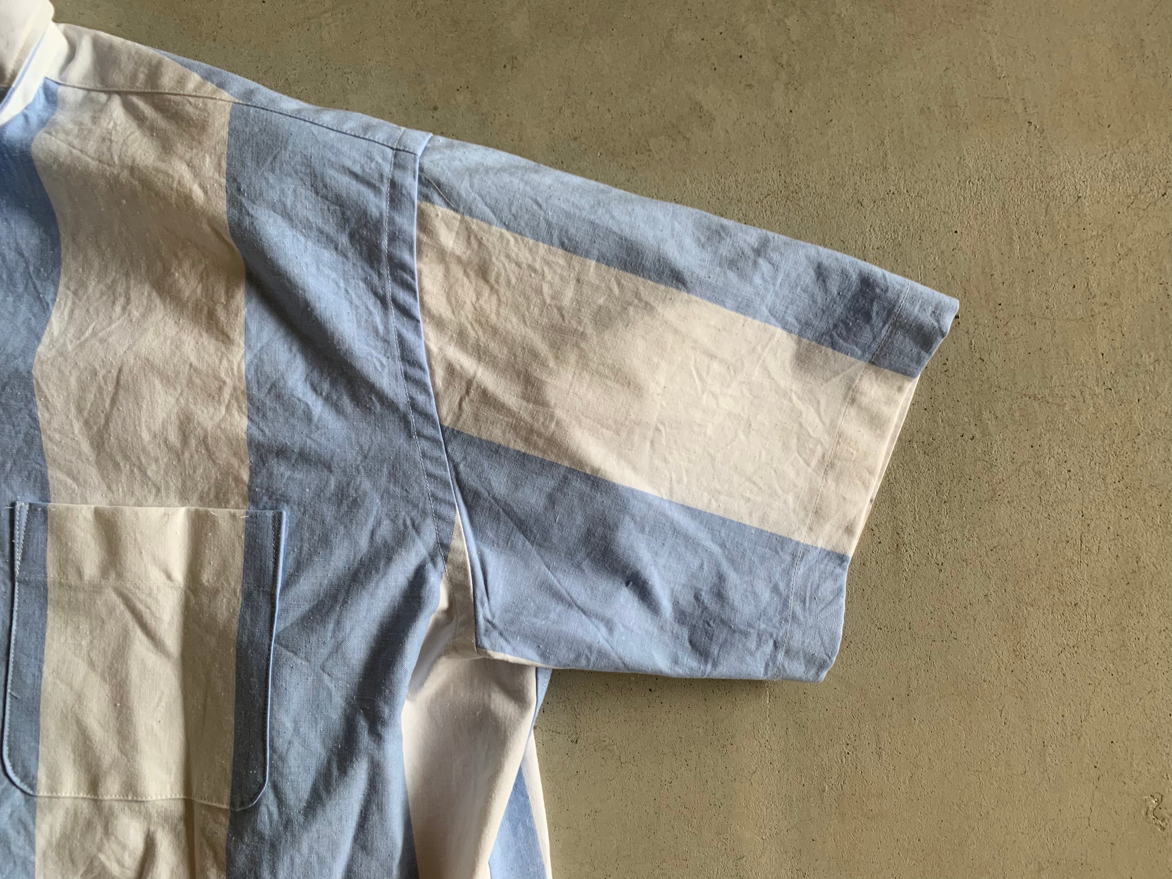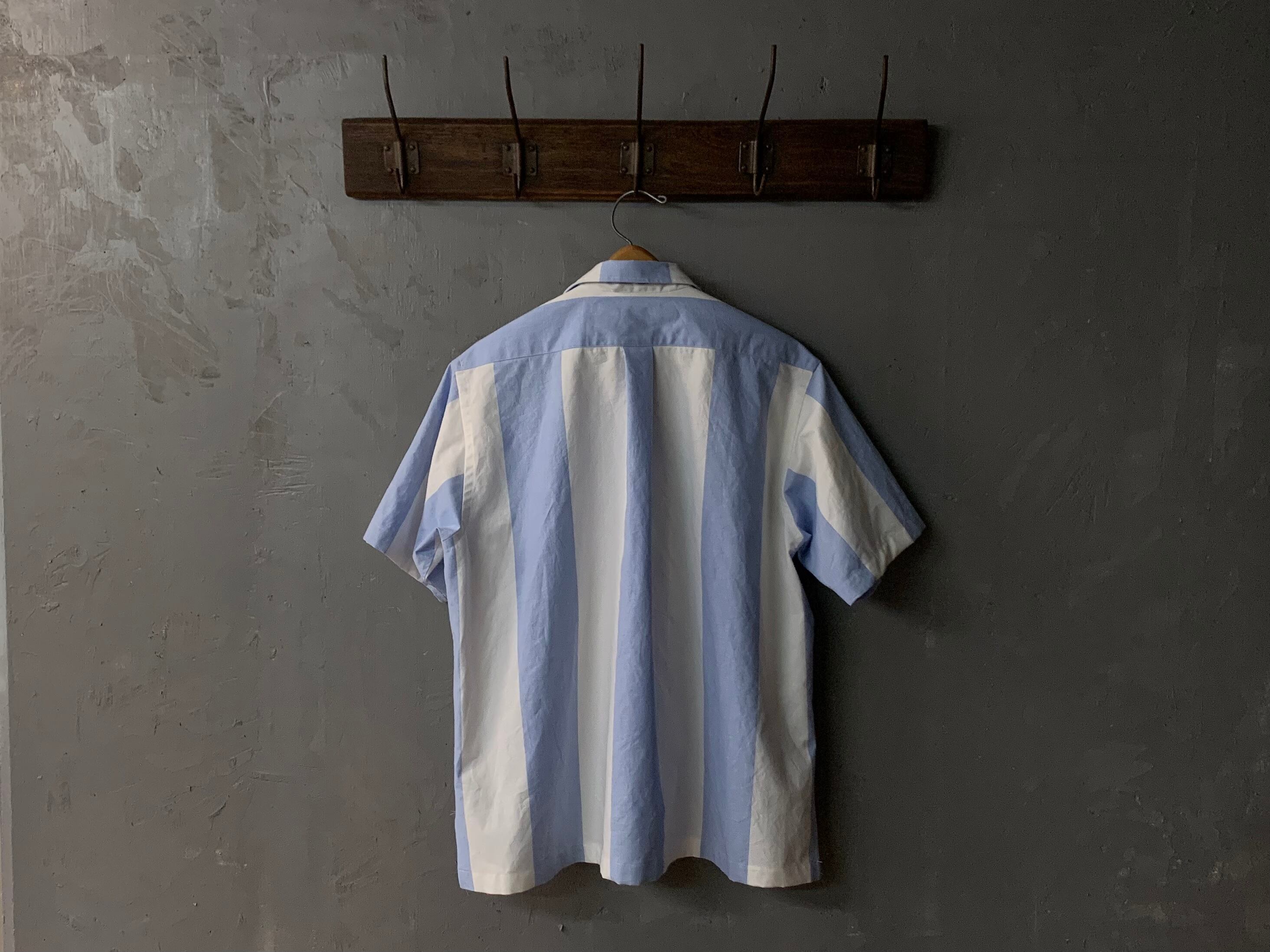 シャツにしては少し厚めのコットン生地で、色見はサックスブルー×ホワイトの極太のストライプです。