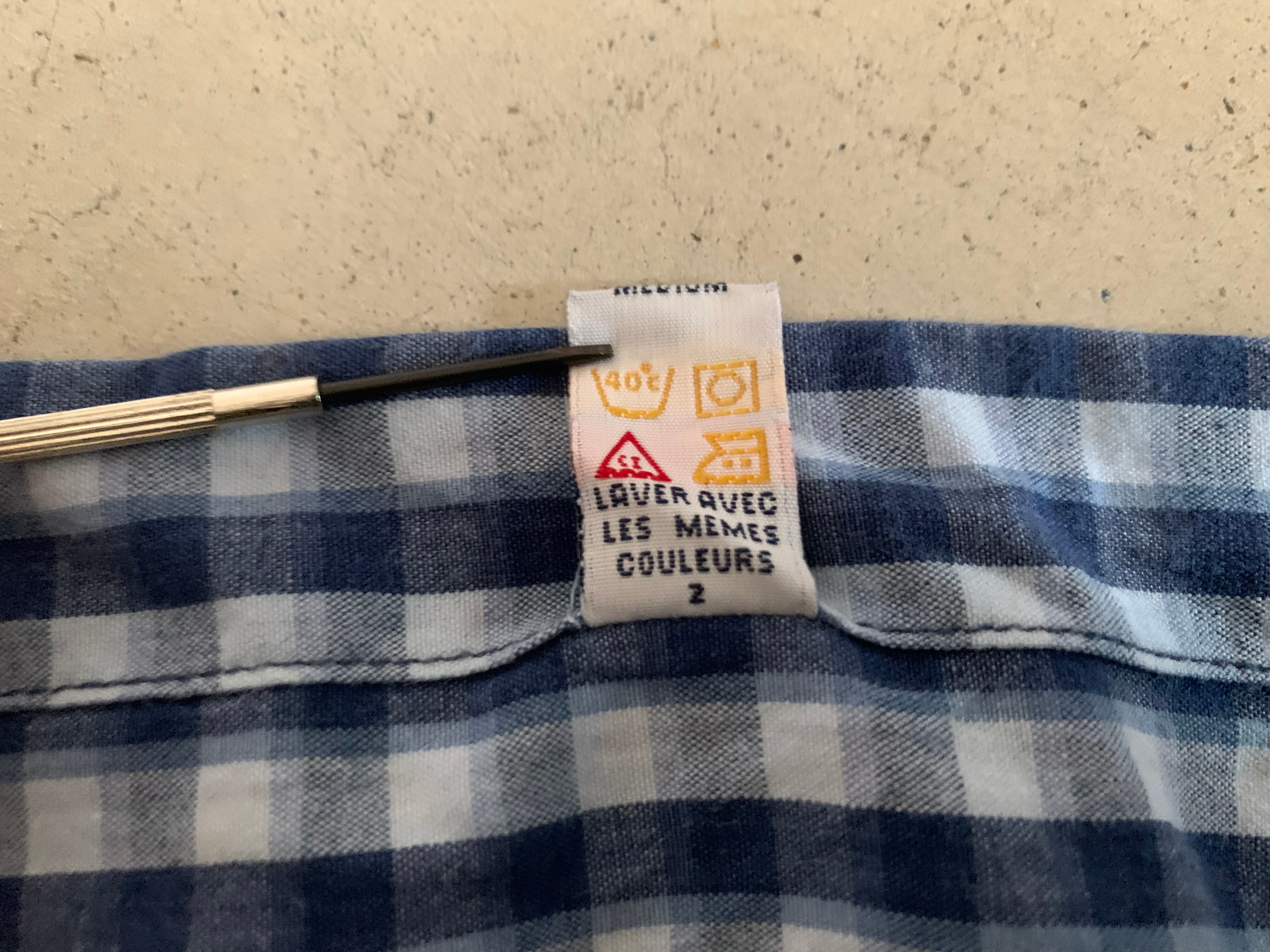 素材はコットン100%、色味はサックスブルー×ネイビー×ブルーの三色使いのとたも爽やかなチェック柄です。