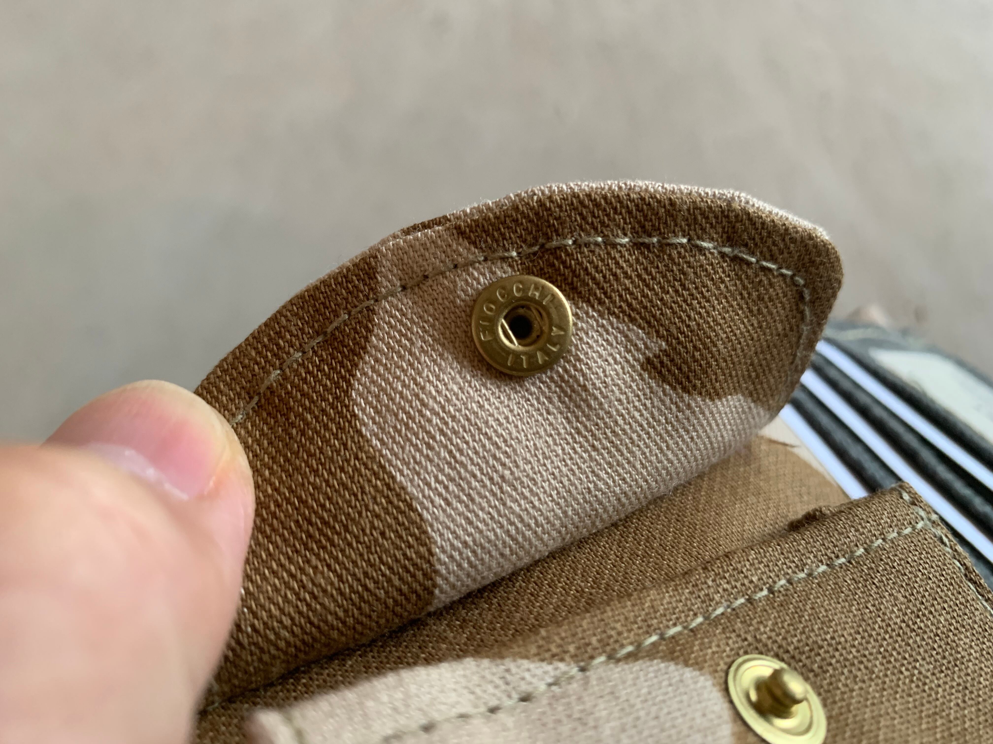コインポケットのスナップボタンはフィオッキ。イタリア系の高級ブランドが好んで使用していたボタンですが、今は生産されておらず、貴重なデッドストックの物を使用しております。