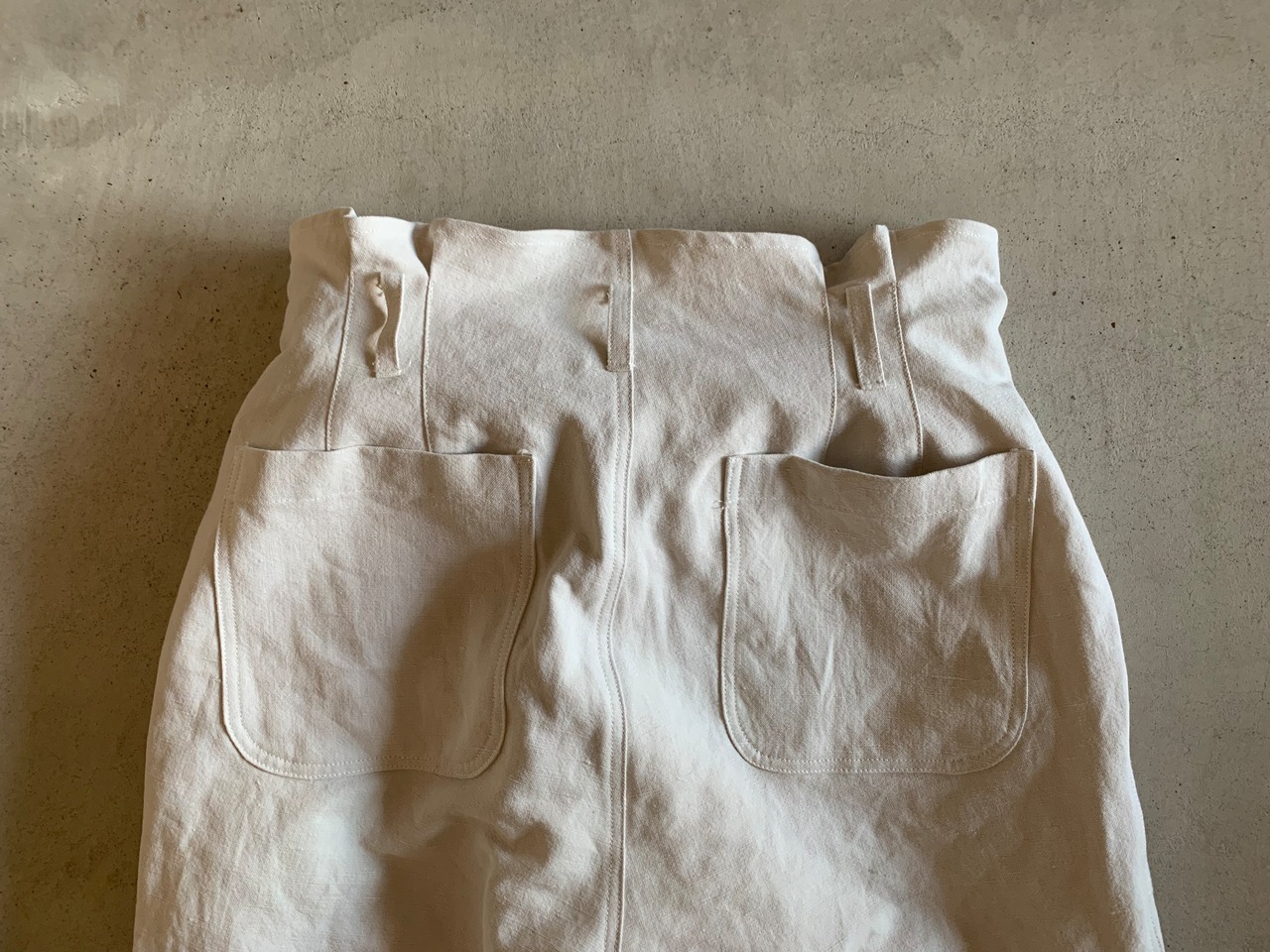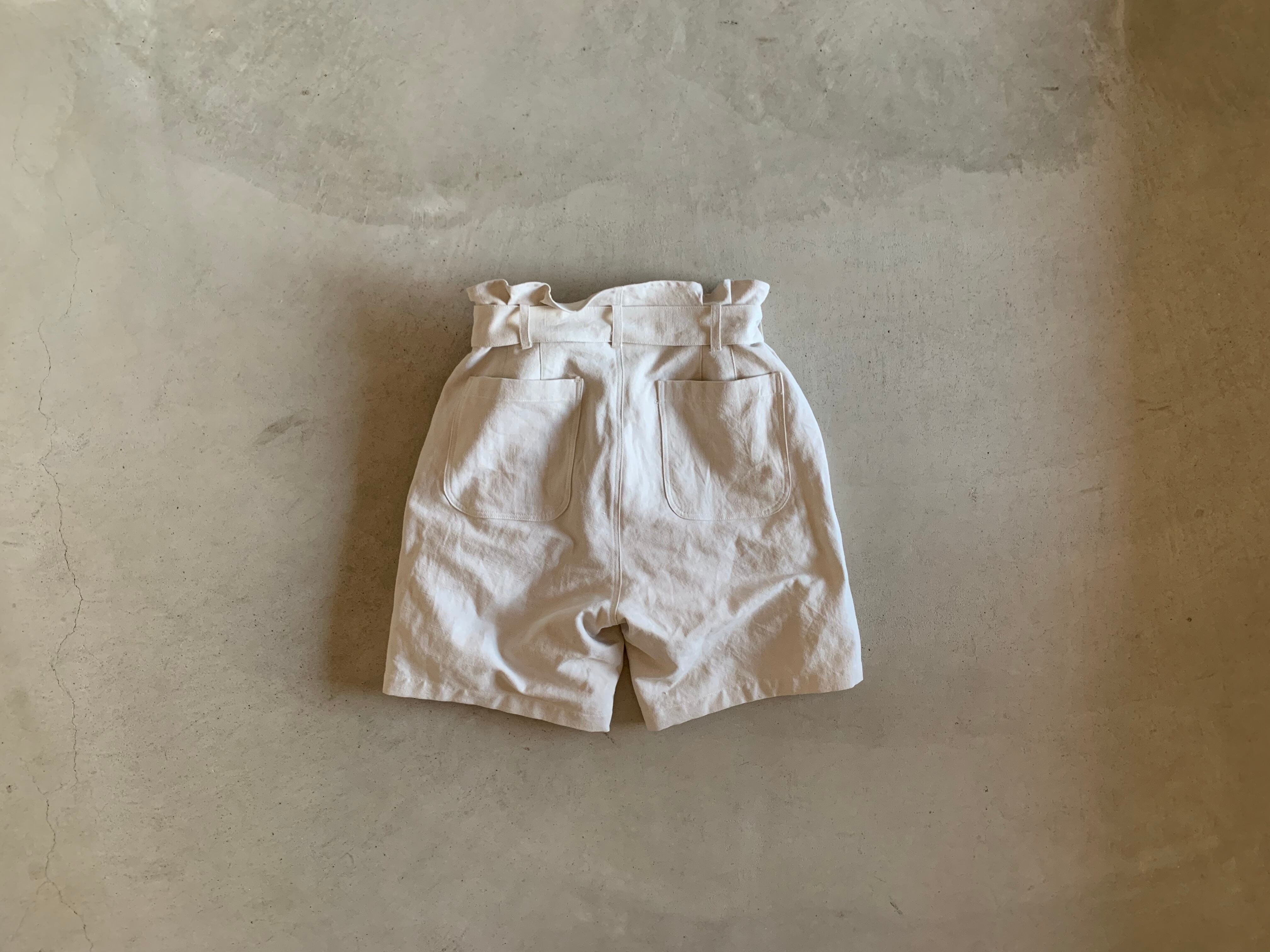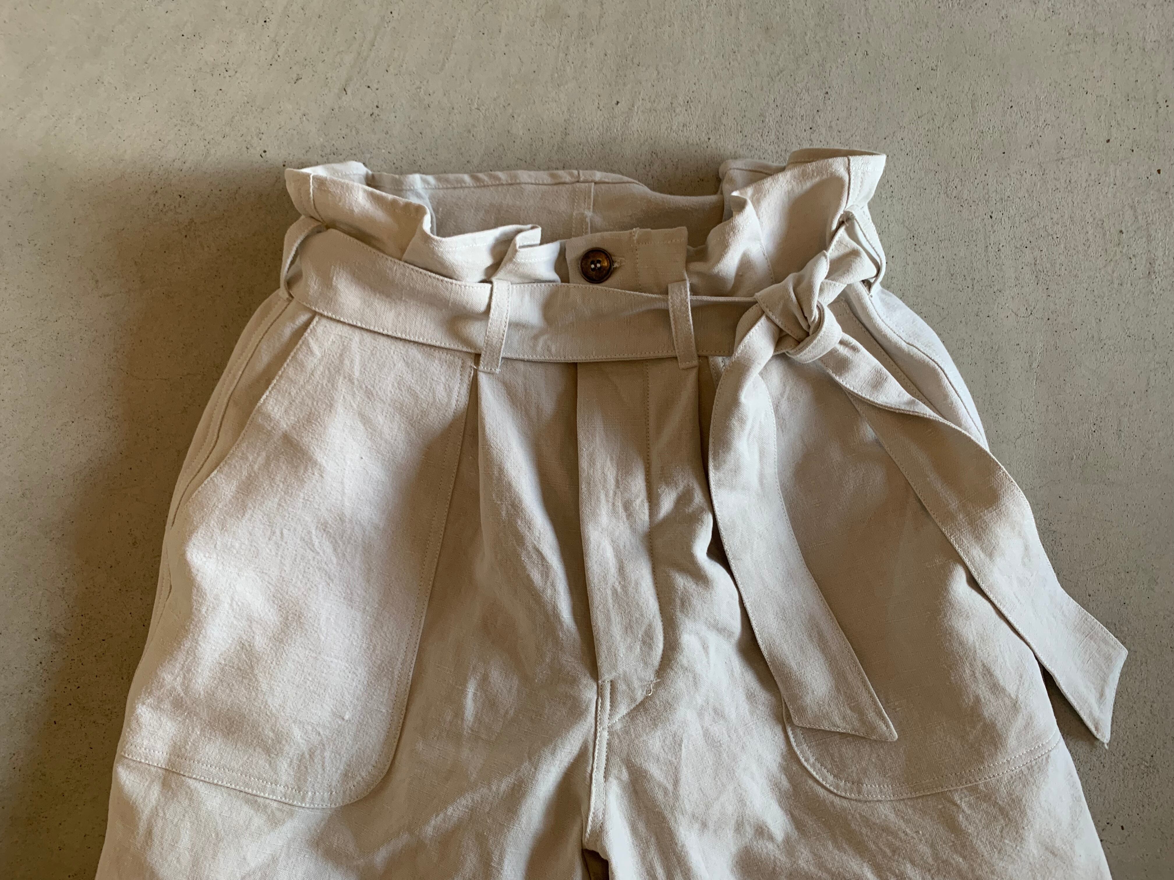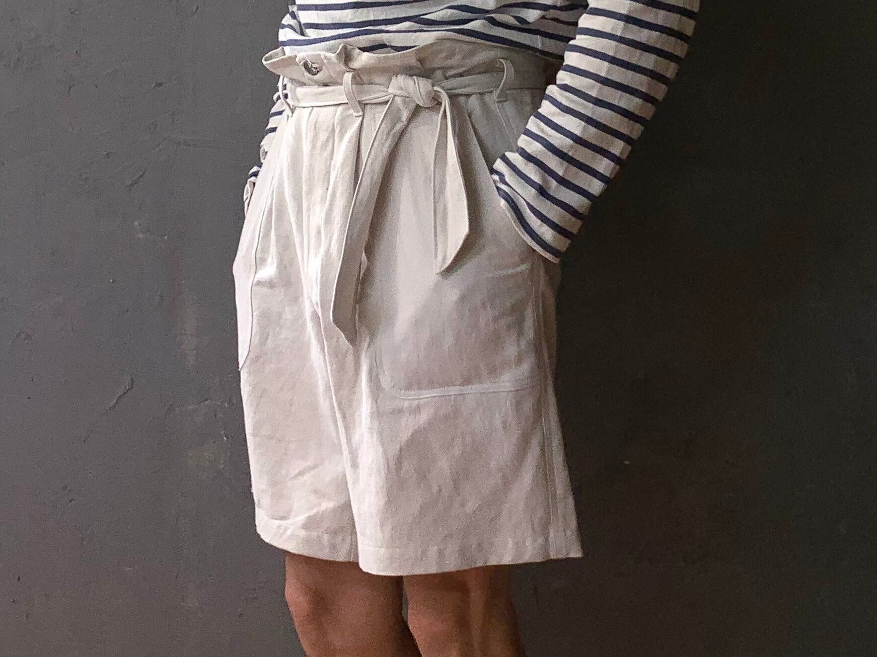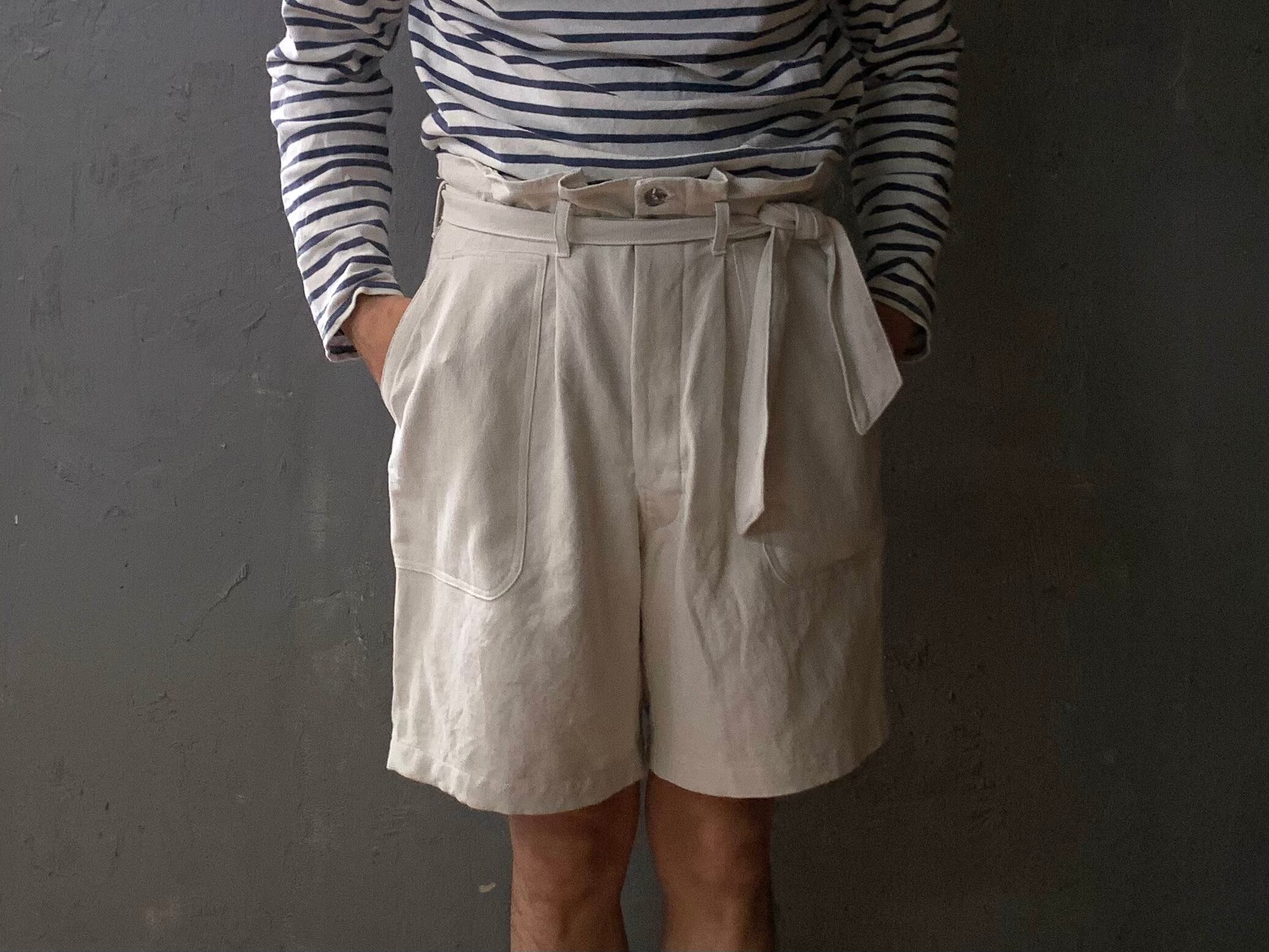 シルエットはイタリア軍のグルカショーツのサイズ感で作っており、履いた時にウエストがクシュッとギャザーができるようデザインしました。タックインをしてベルトでギュッとしめると独特な雰囲気がでます。
