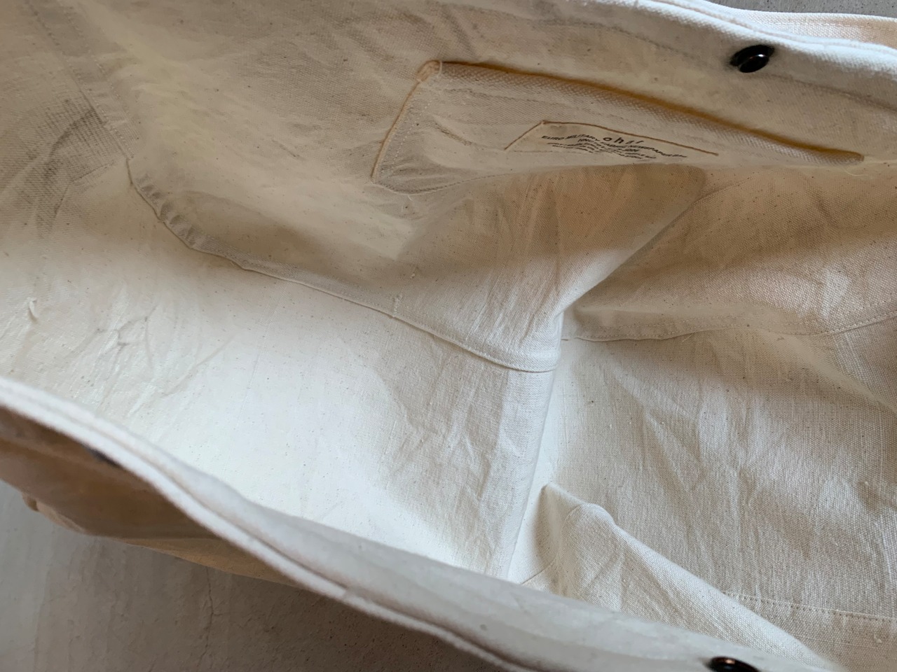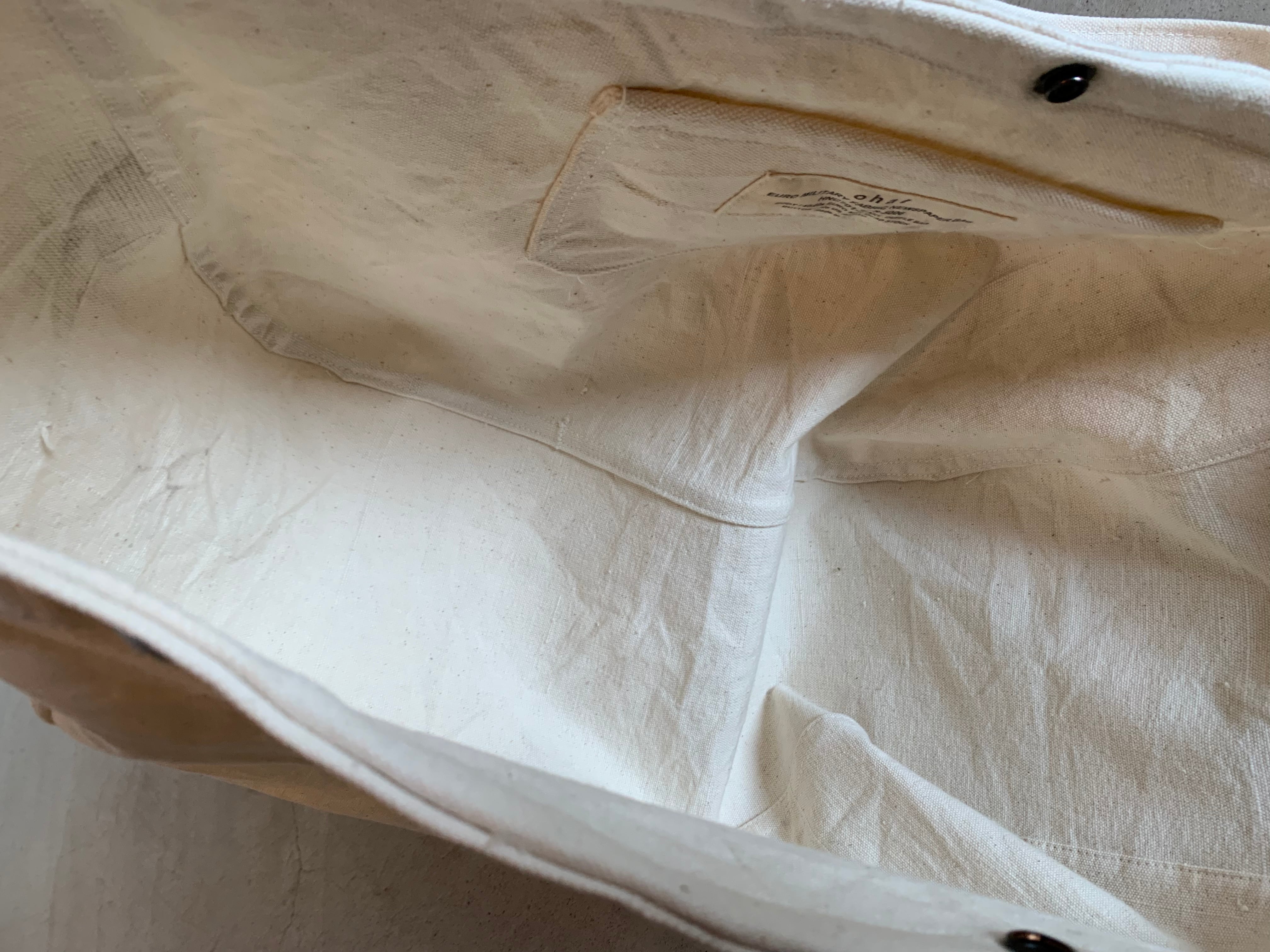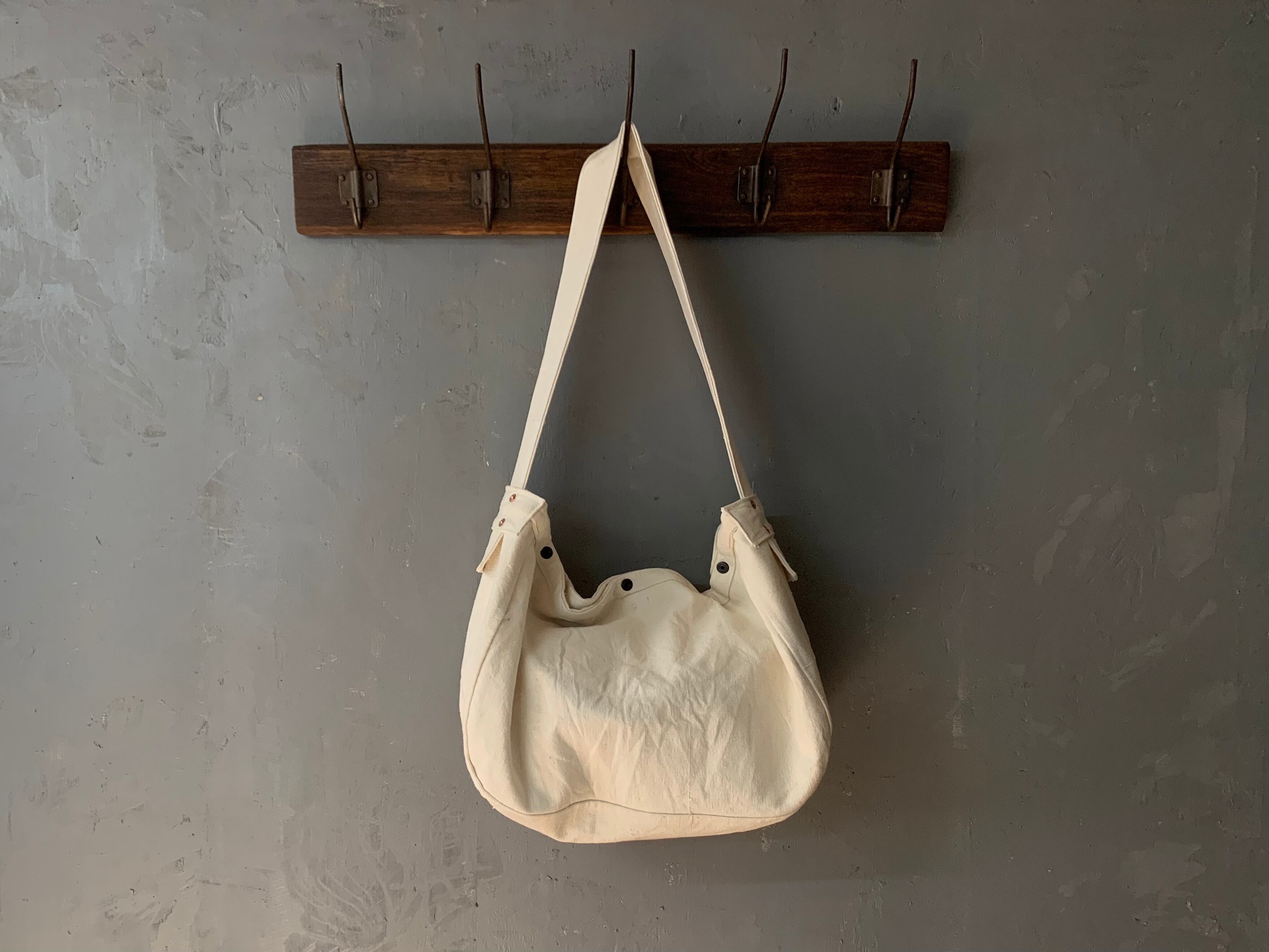 ユーロヴィンテージの倉庫にある箱の中から見つかった、どこの国のものかわからない、いい雰囲気の生成りのダッフルバッグ。使用されていた糸や資材からおおよそ40〜60年代頃ではないかと推測されます。
