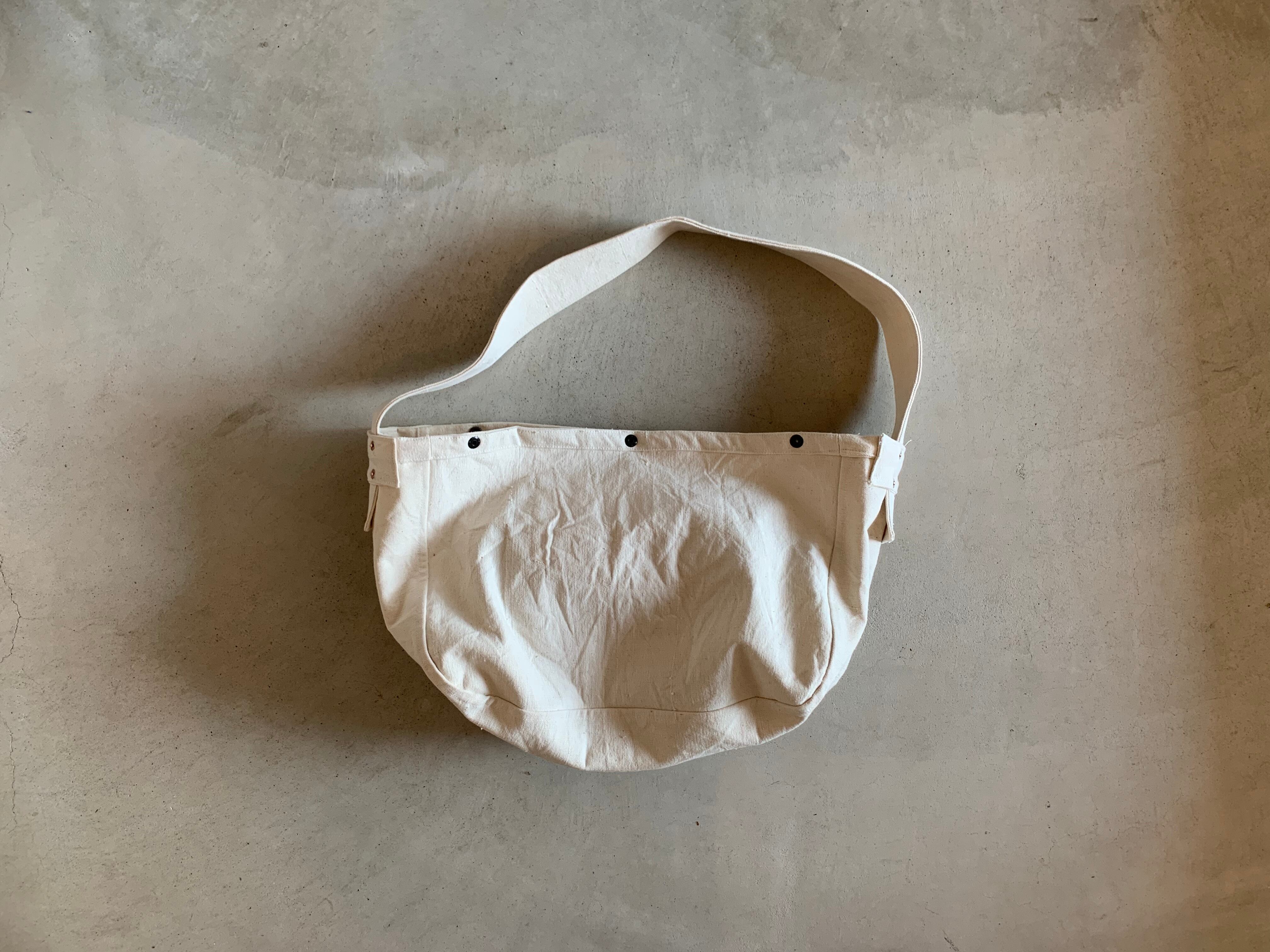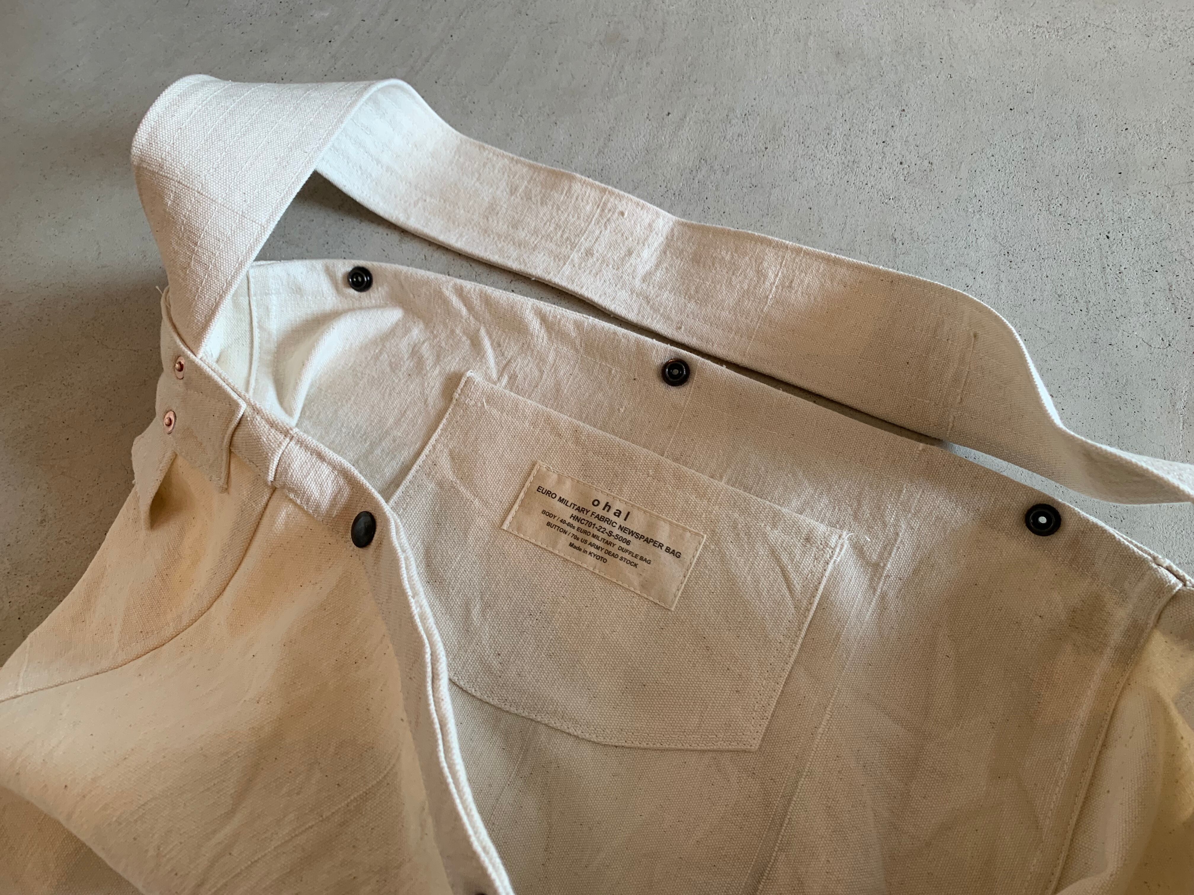 そのダッフルバッグを解体し、ニュースペーパーバッグを作製しました。ショルダーベルトもボディーと同じ素材で作っています。昔のニュースペーパーと同じように、太めのショルダーベルトにしてますので、重たい物を入れても肩への負荷が軽減されます。