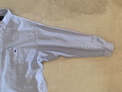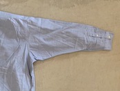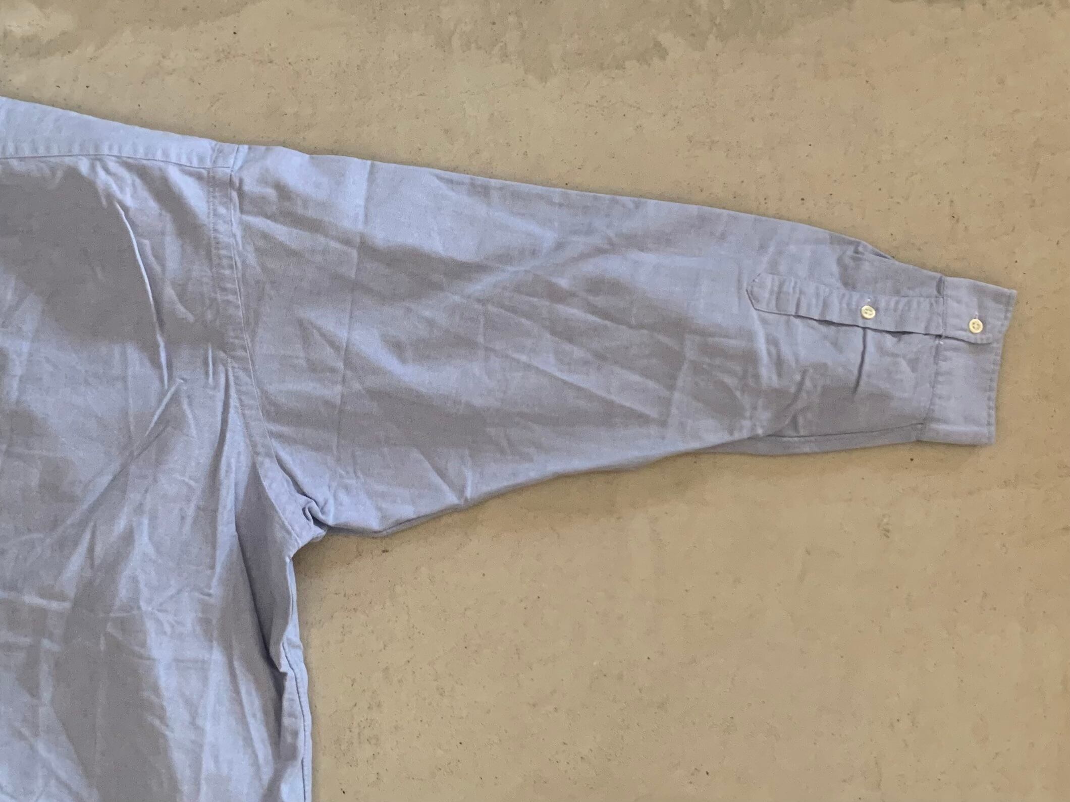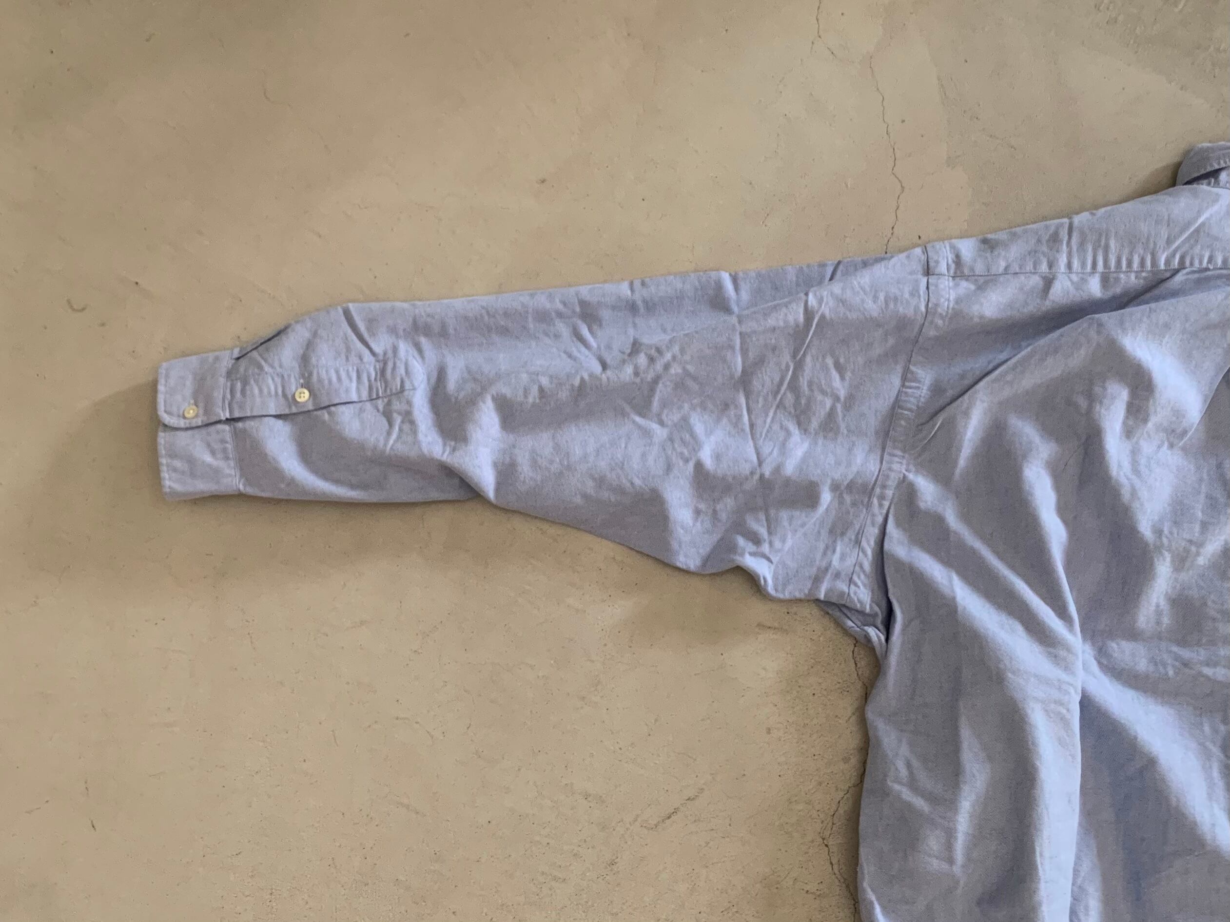 素材はコットン100%の爽やかなサックスブルーのオックスフォード。ビッグシャツの上にさらにXXLなのでかなり大きいです。