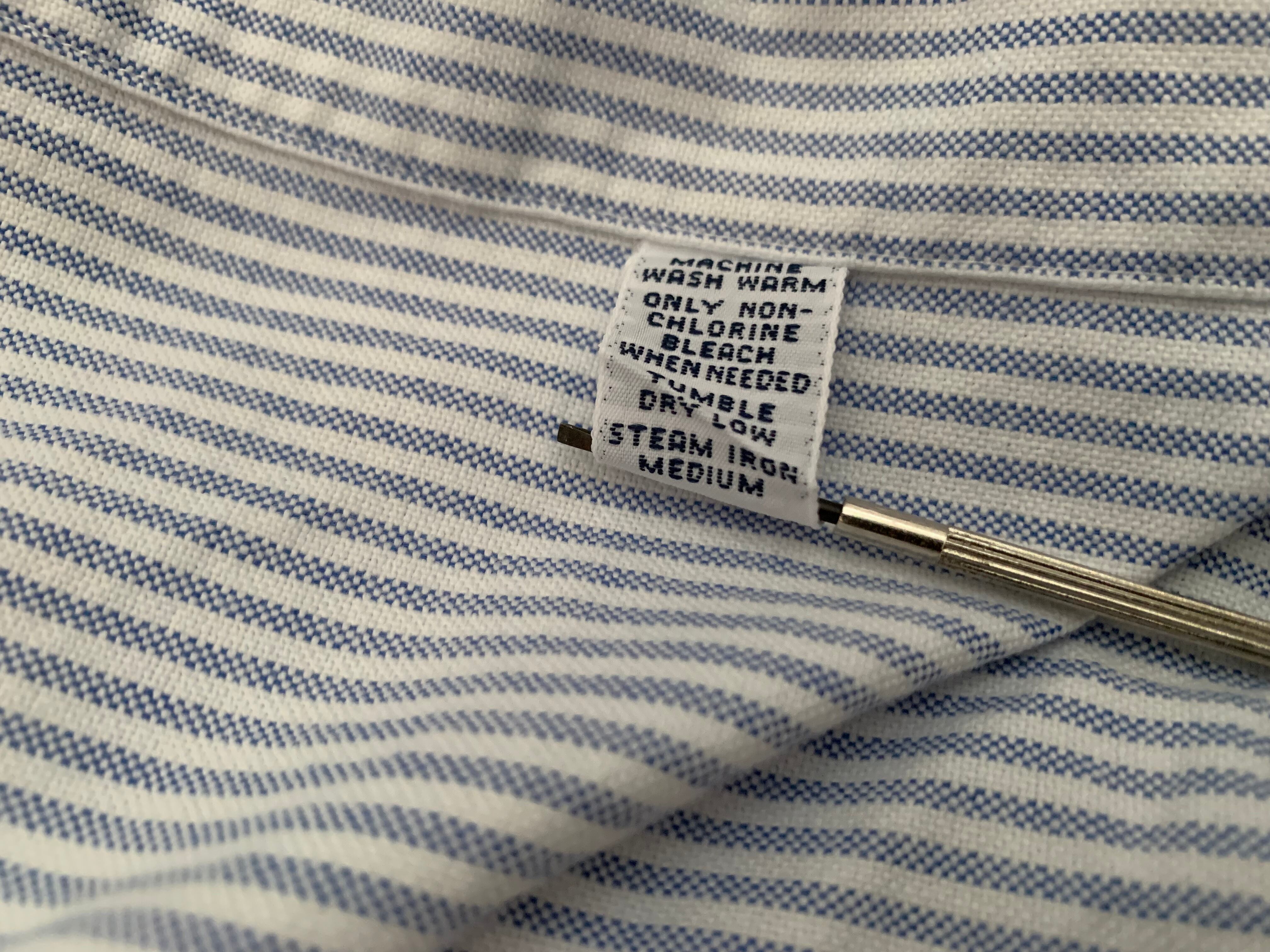 素材はコットン100%の爽やかな白とサックスブルーのストライプ柄のオックスフォード。