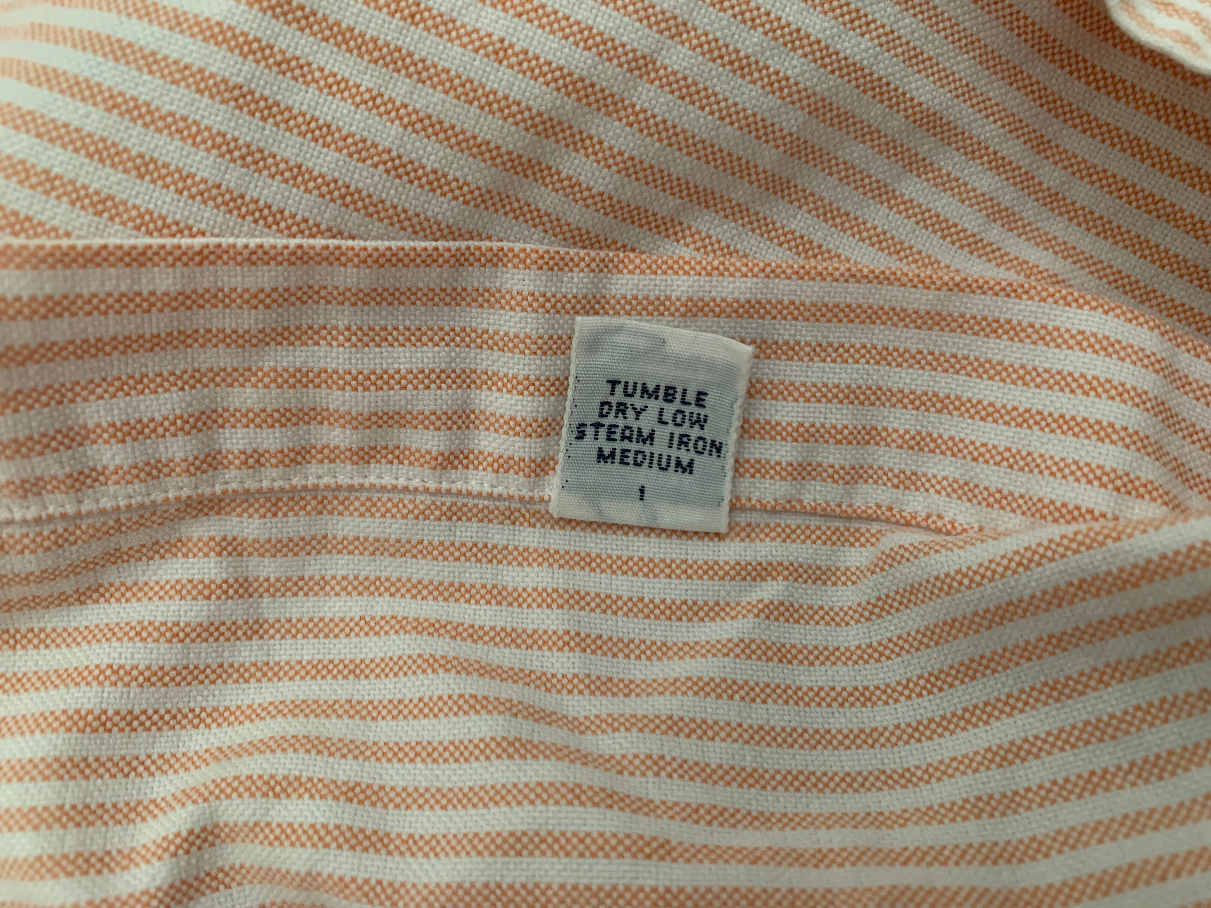 素材はコットン100%の白とサーモンピンクのストライプ柄のオックスフォード。