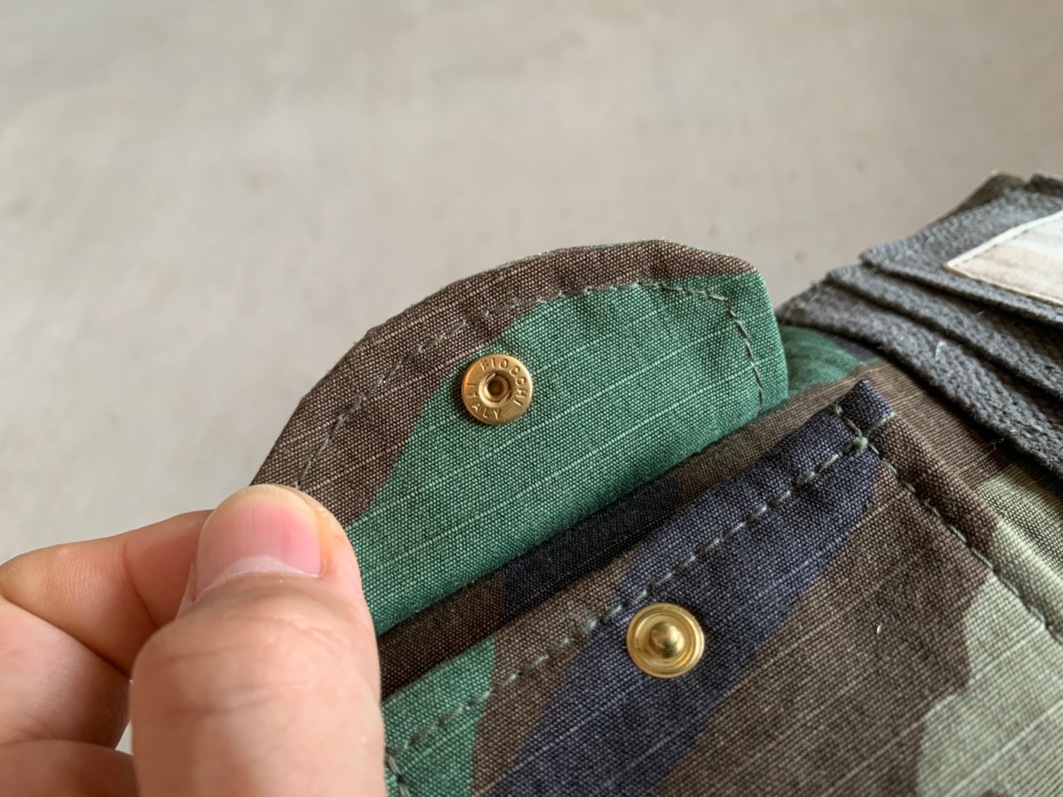 コインポケットのスナップボタンはフィオッキ。イタリア系の高級ブランドが好んで使用していたボタンですが、今は生産されておらず、貴重なデッドストックの物を使用しております。
