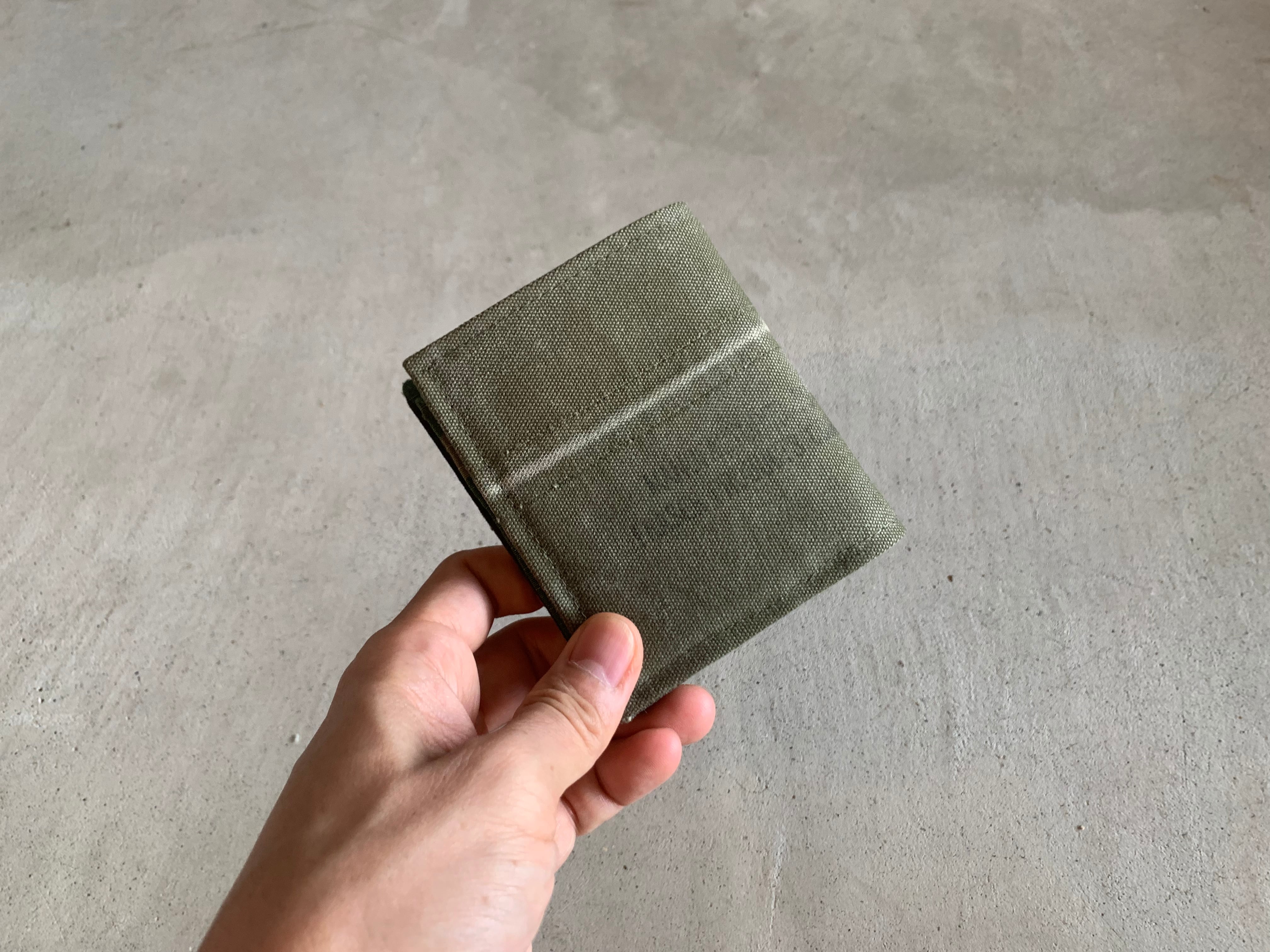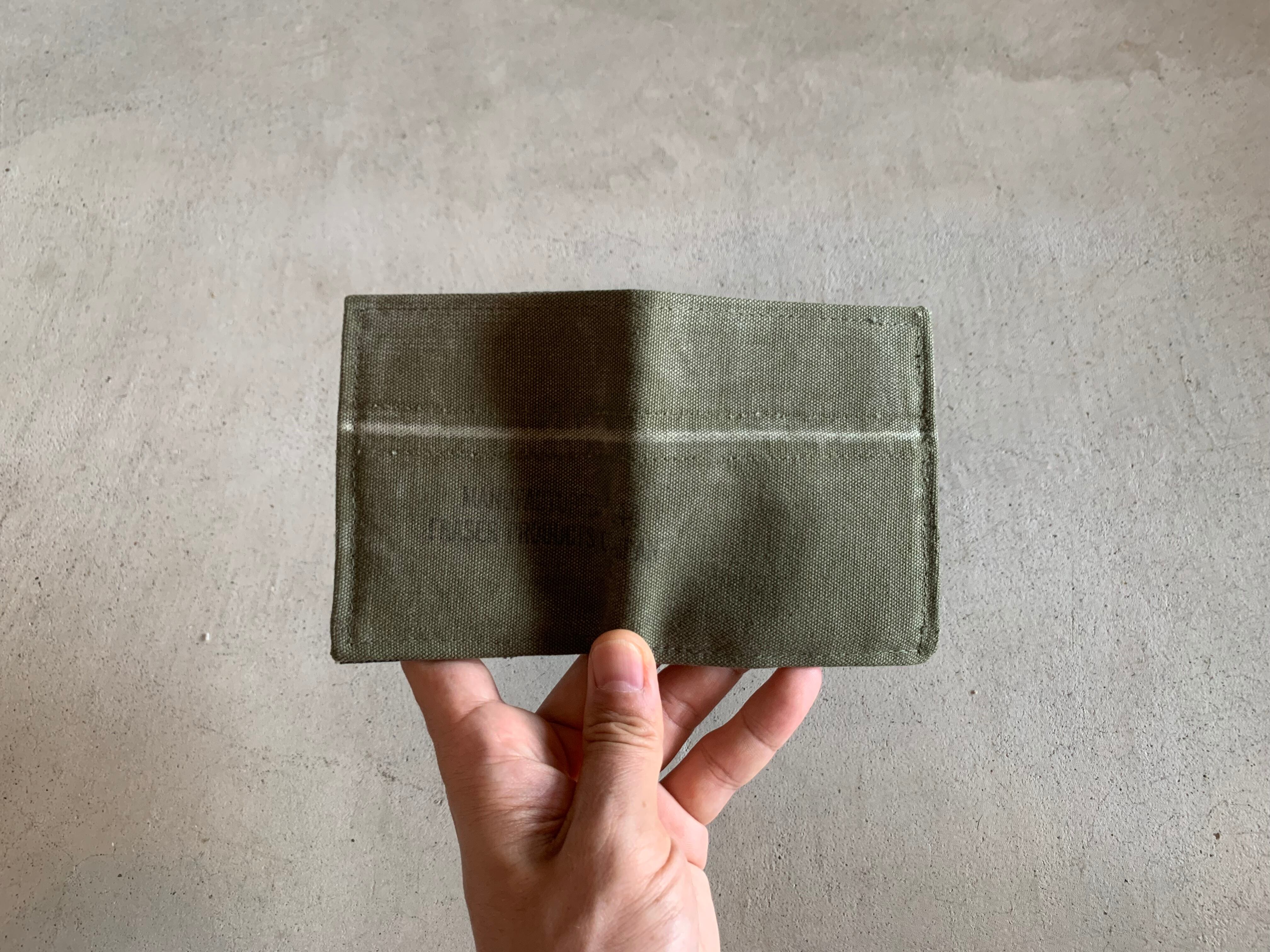 カード入れで使用しているキャンバステープは80年代、米軍にて使用されていたものです。運転免許証、クレジットカードなどが入るサイズです。
