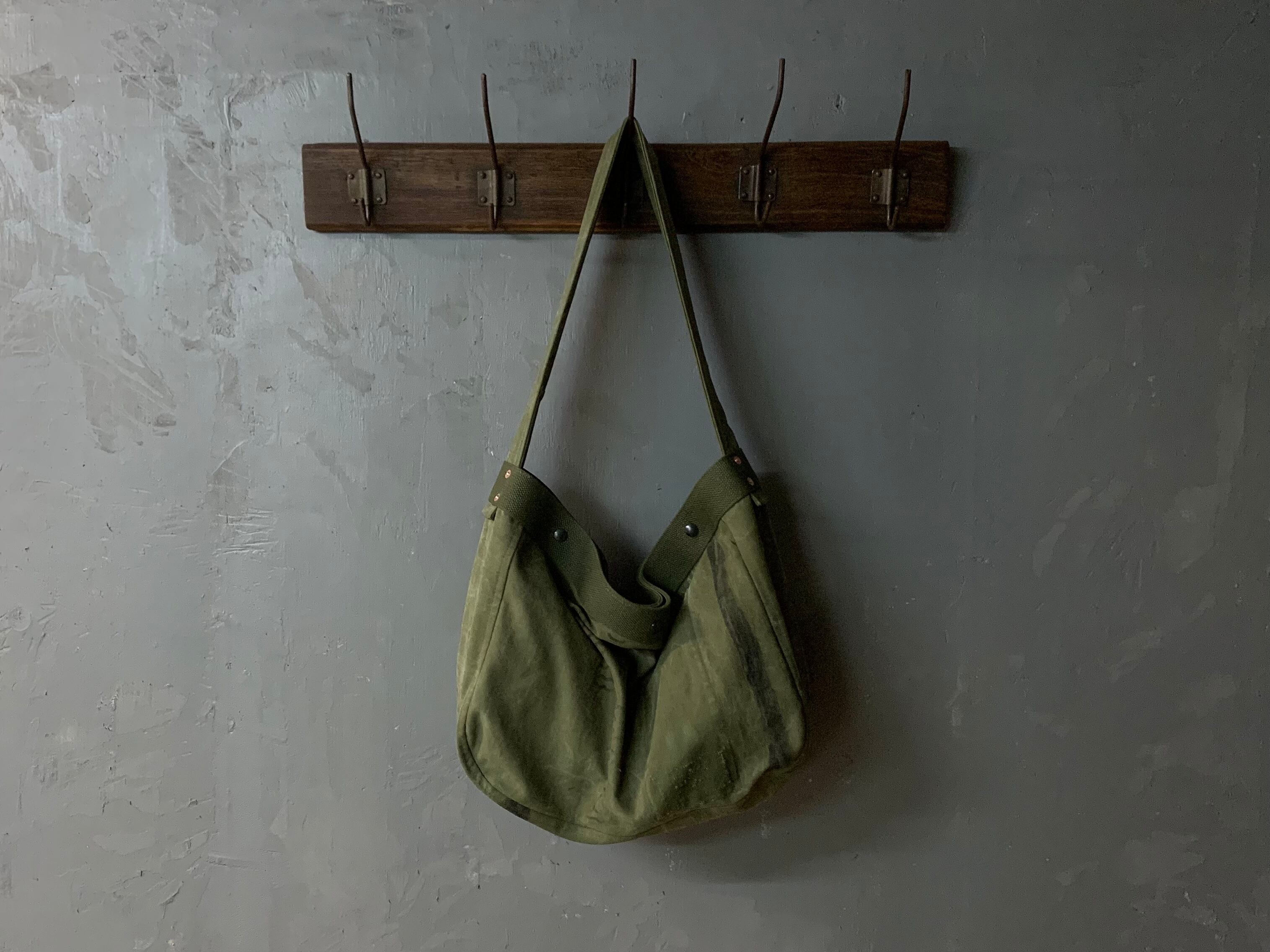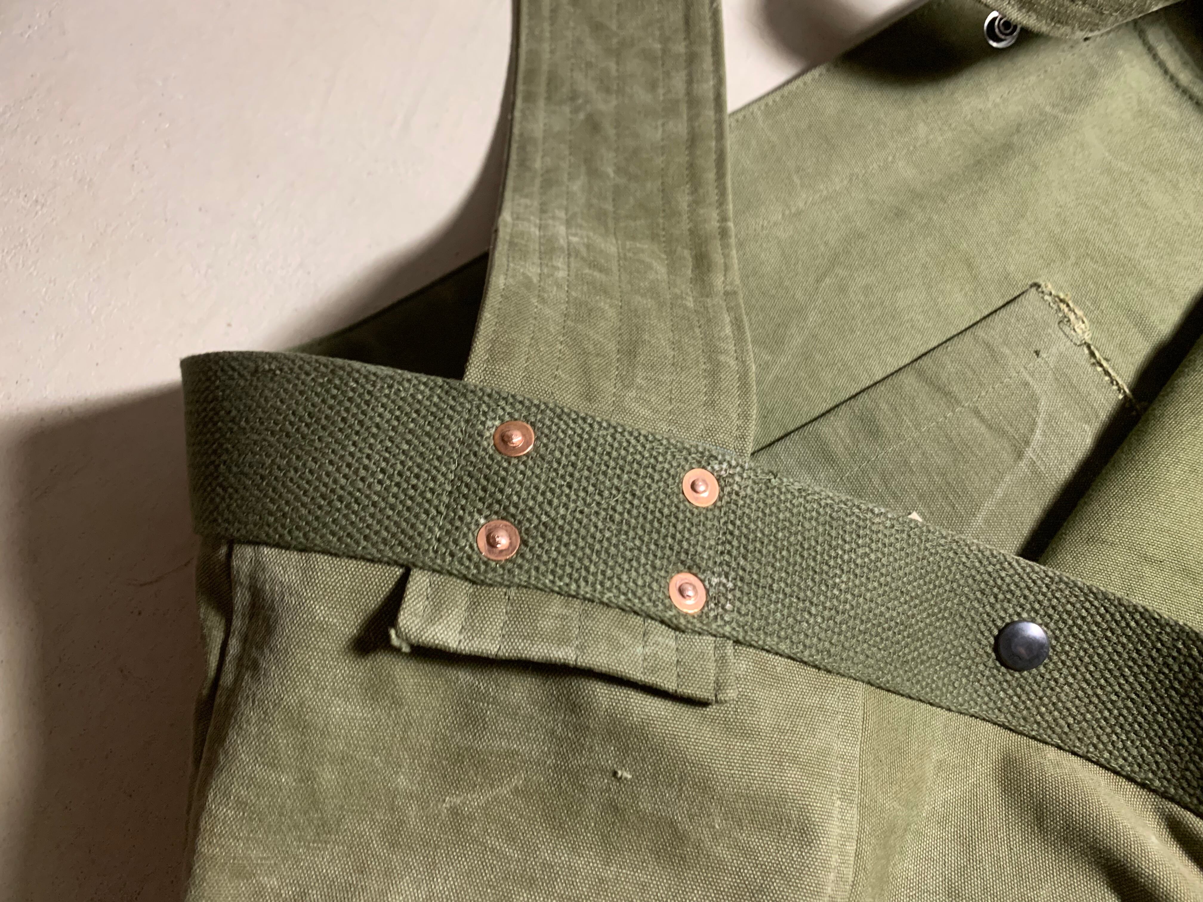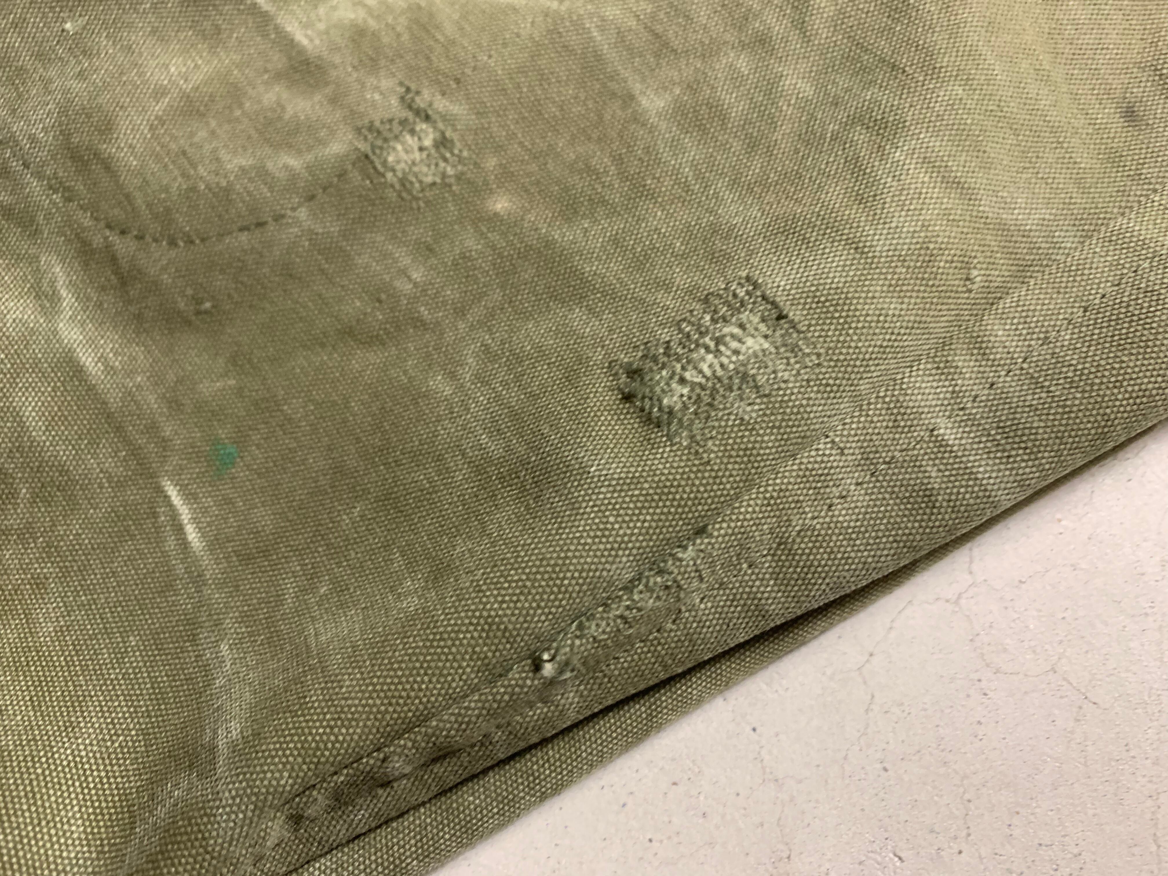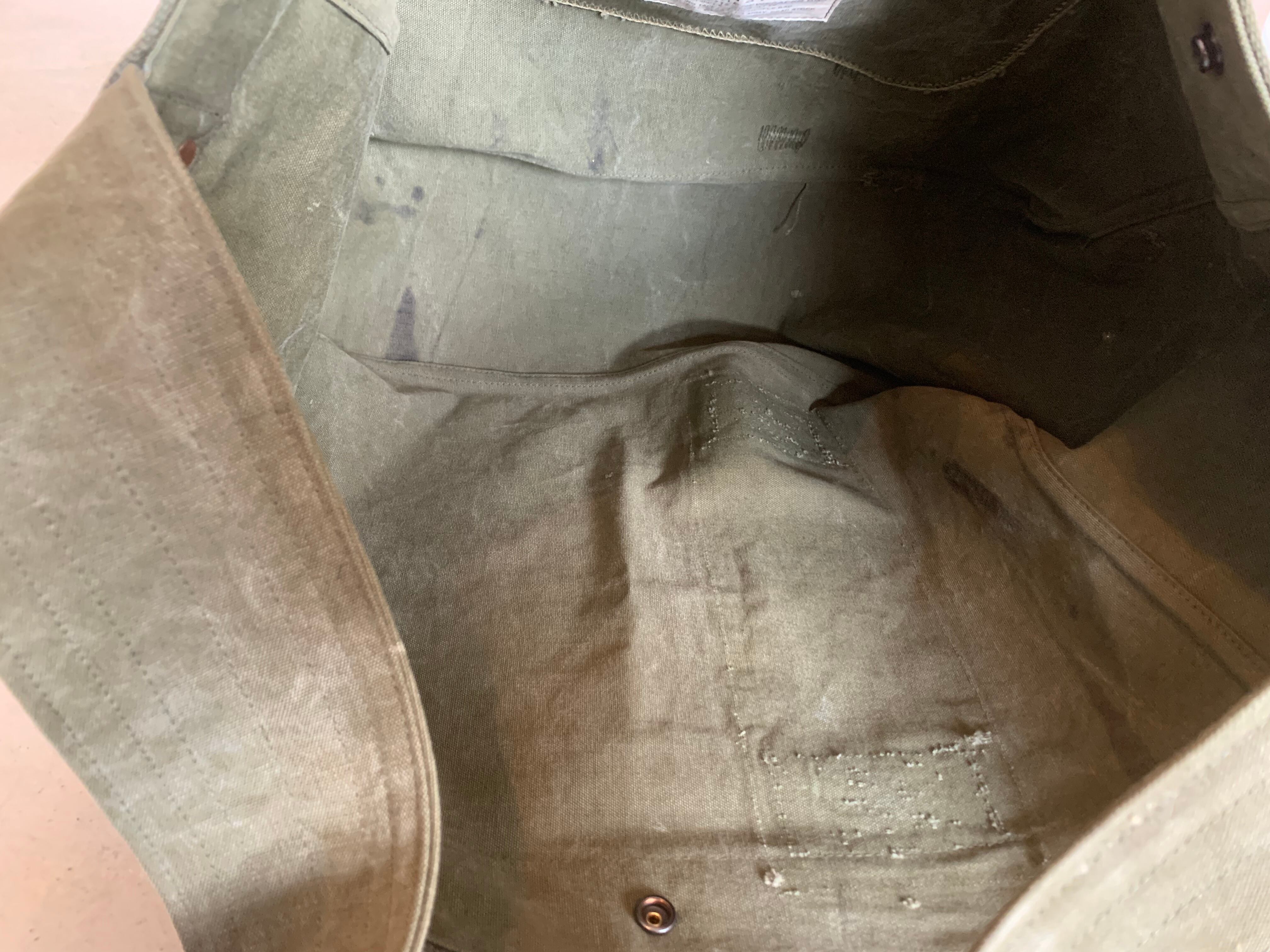 ボディーの生地は40年代頃、アメリカ軍のダッフルバッグ。フロントに良い雰囲気の当時のステンシルが残っているのと、マジックで黒く塗りつぶされたようなラインが書かれており、良い味が出ています。素材は頑丈なコットンキャンバスで使い古したカーキ色がヴィンテージの雰囲気を醸し出してくれます。全体的にダメージが多く、補修した箇所などもございますが、そういった物も含めてデザインとしております。なので、ハードに使っても多少の汚れなんかは気にもなりません。細かな汚れなども味として捉えて、経年変化を楽しんでもらえればと思います。