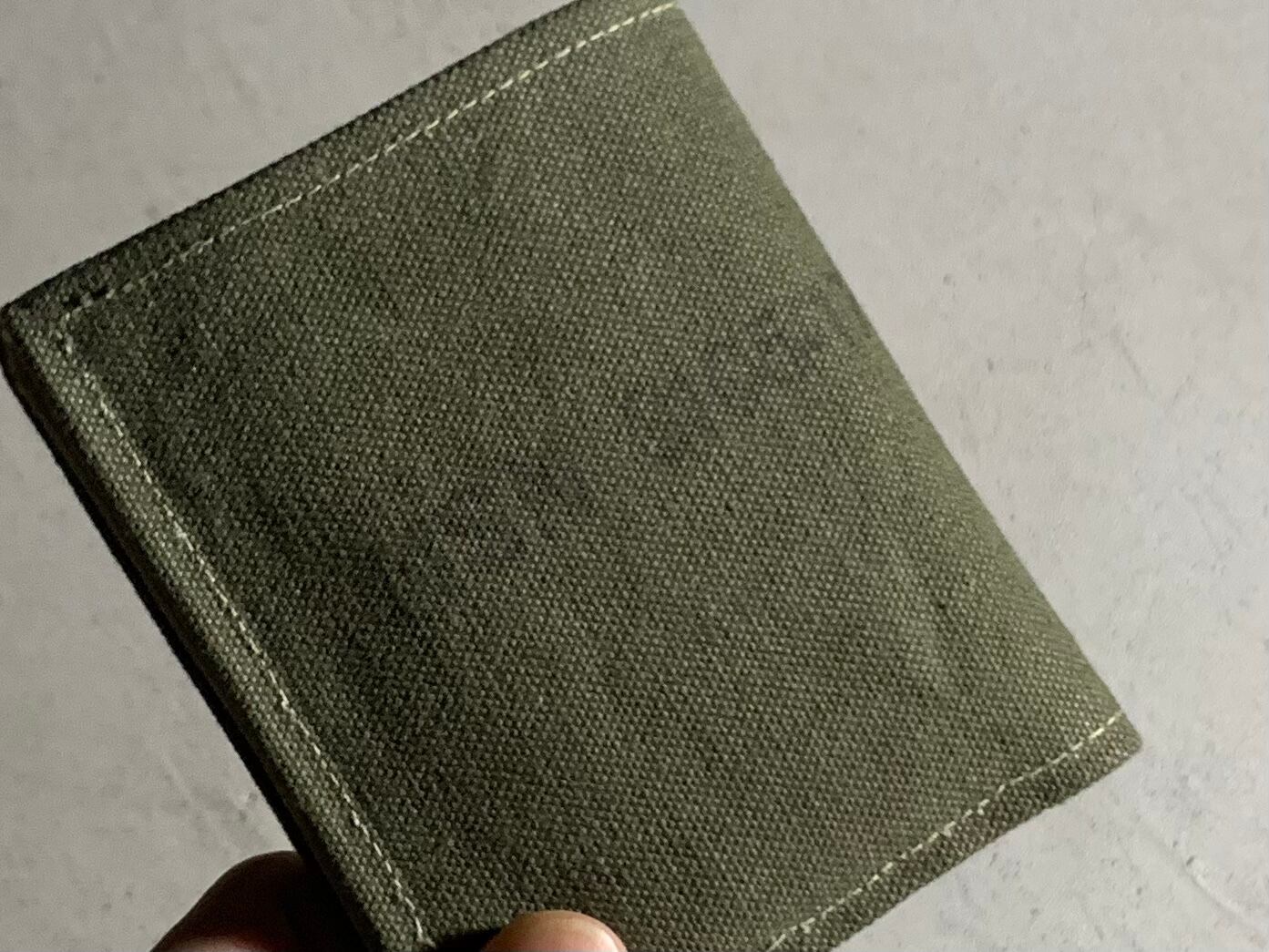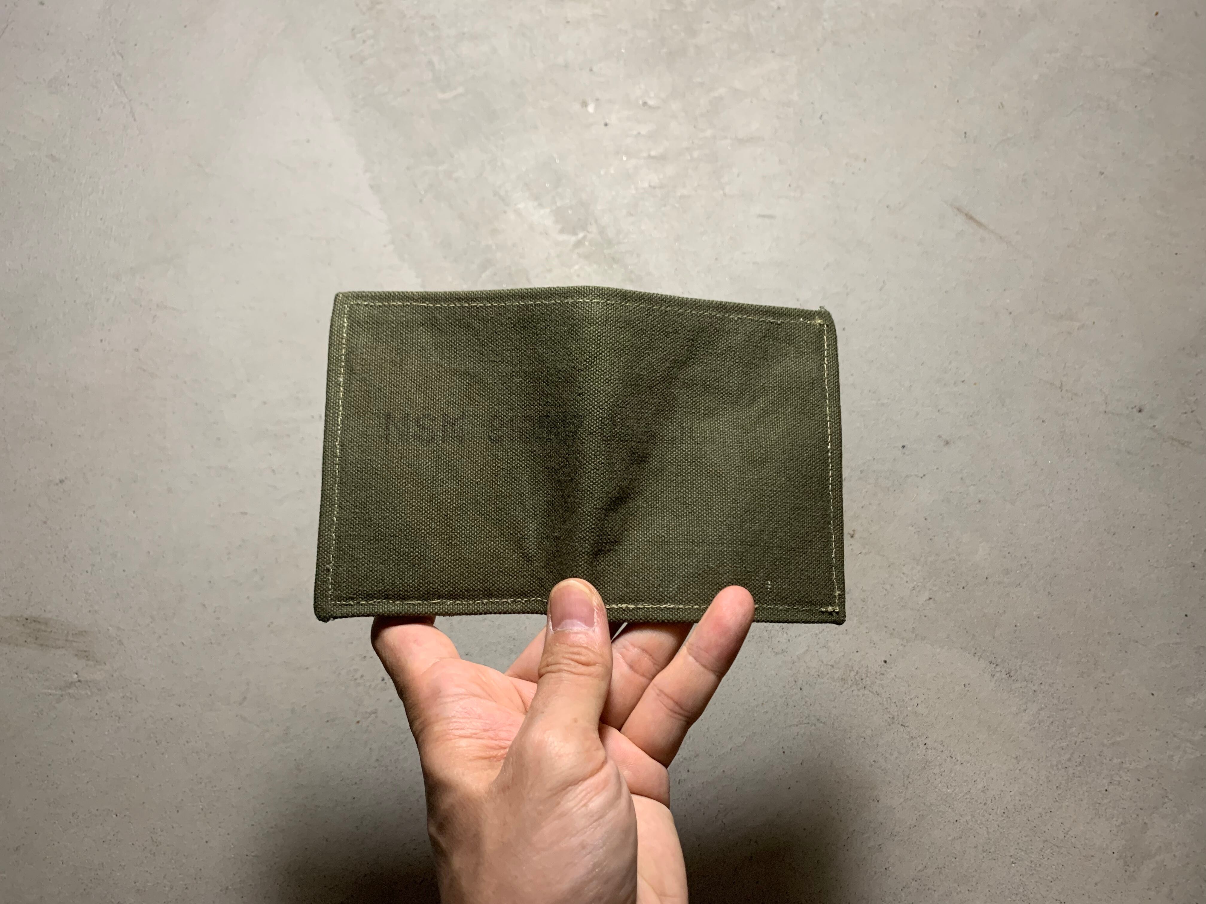 カード入れで使用しているキャンバステープは80年代、米軍にて使用されていたものです。運転免許証、クレジットカードなどのプラスチックのカードが1枚ずつ入るサイズです。あまり入れすぎると取り出しにくかったり破れたりする恐れもありますので、カードの入れ過ぎには注意してください。