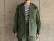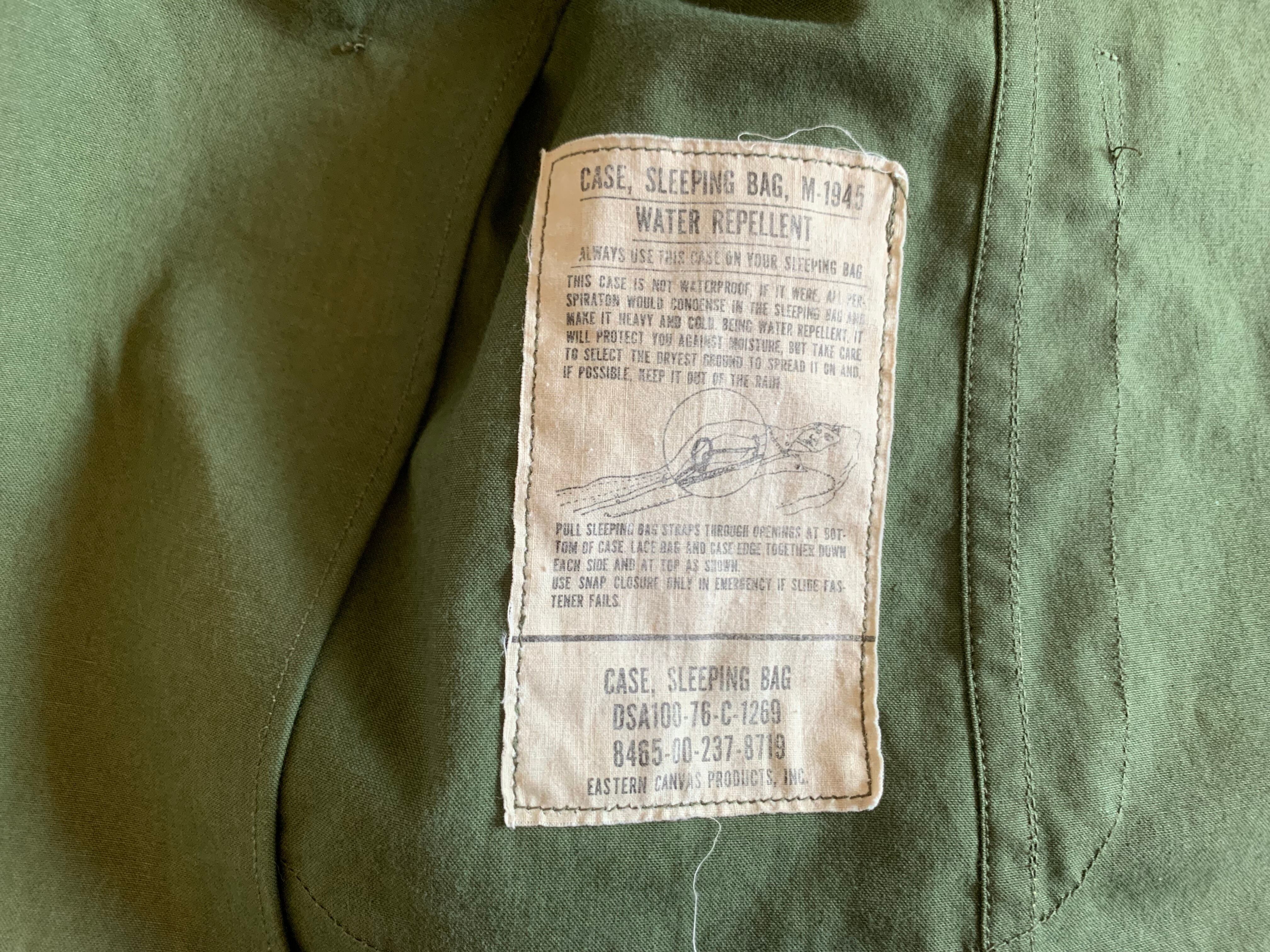 ボディーは、70年代アメリカ軍のスリーピングバッグケースの生地。コットン100%で通気性の良い素材感。一年通して使える生地かと思います。糸はヴィンテージの雰囲気を損なわないように、30番手の綿糸で縫っております。胸にはUSのステンシルがうっすらと入っていた箇所を切り取り胸ポケットとして取り付けました。
