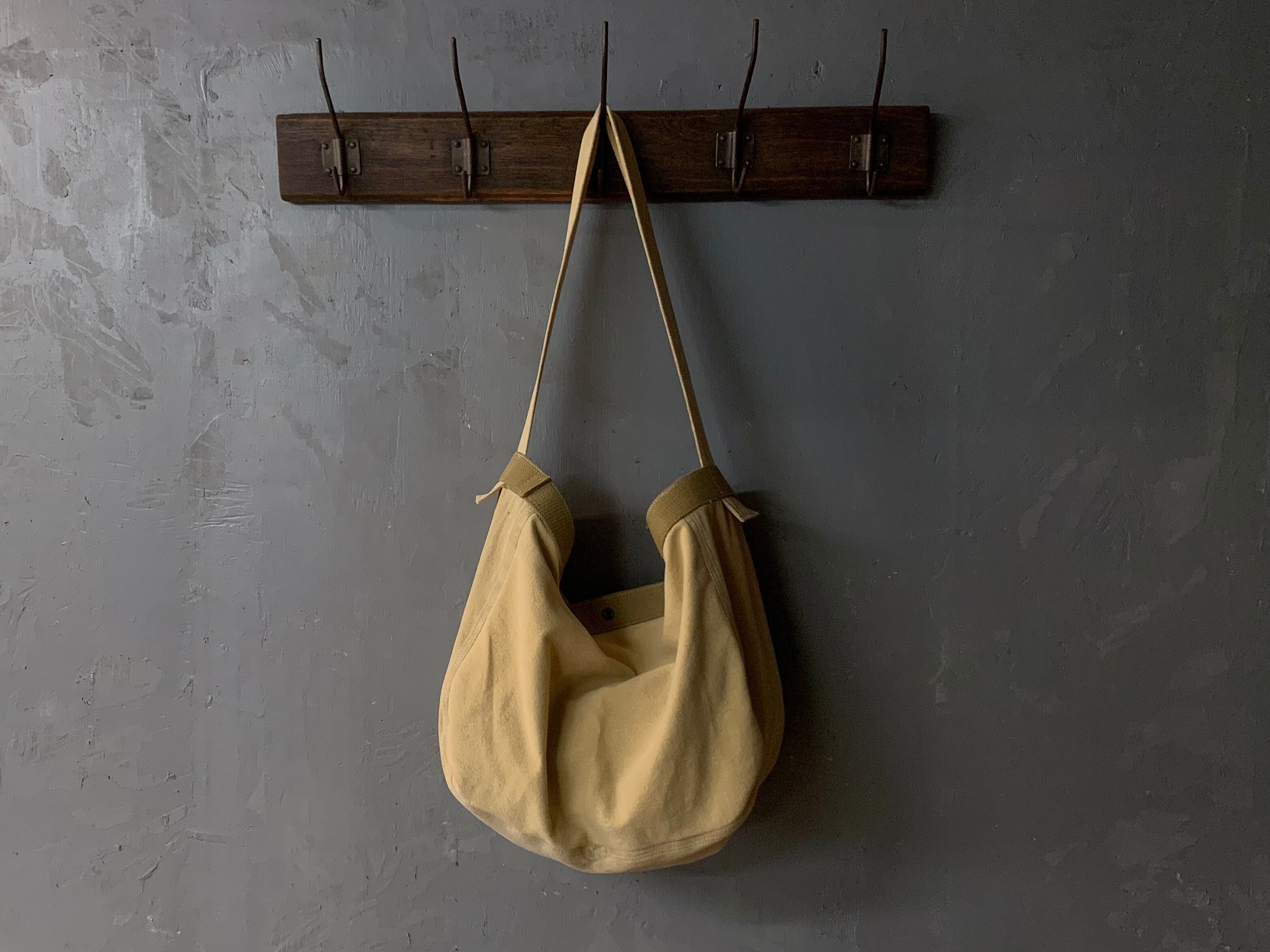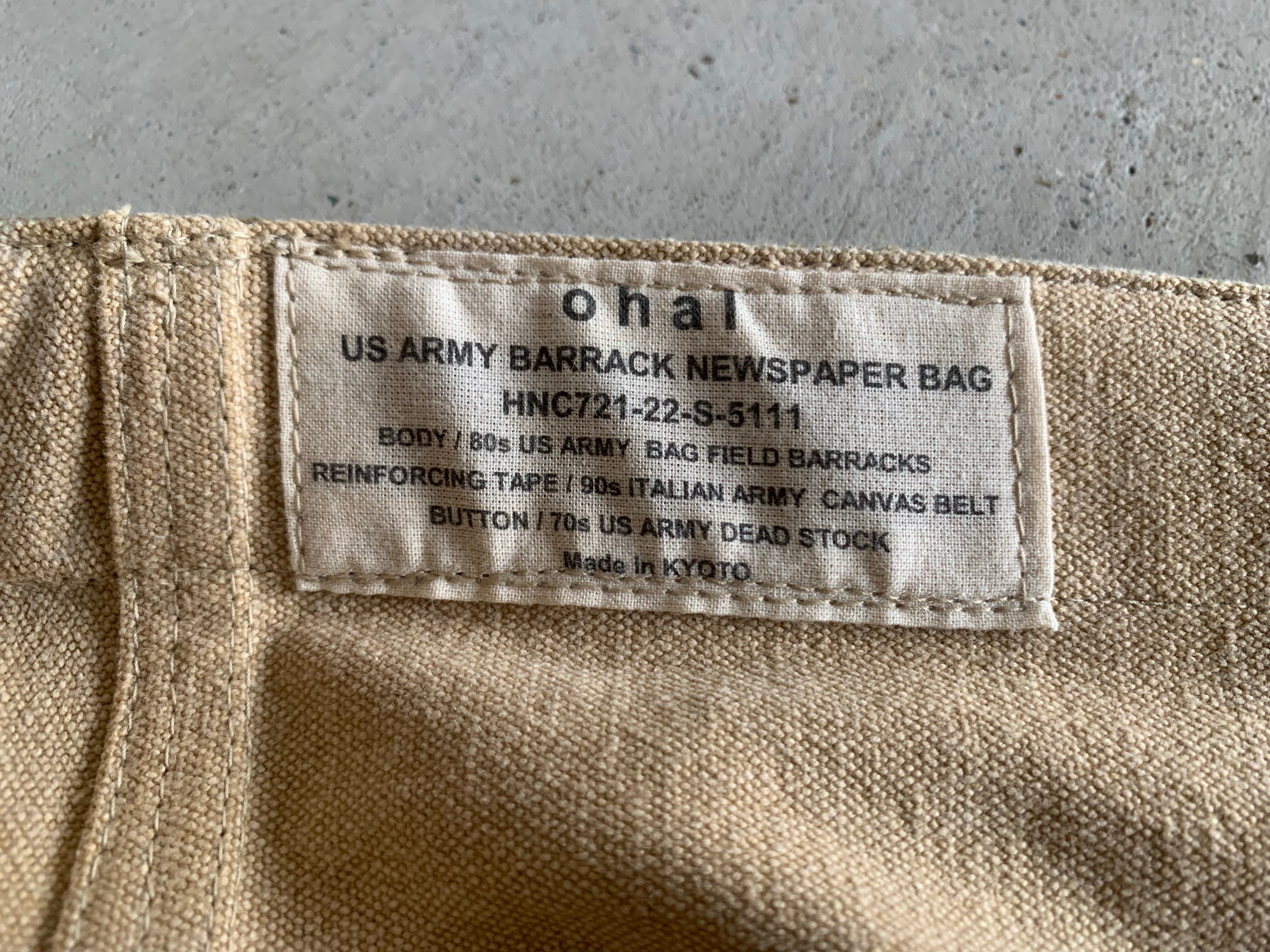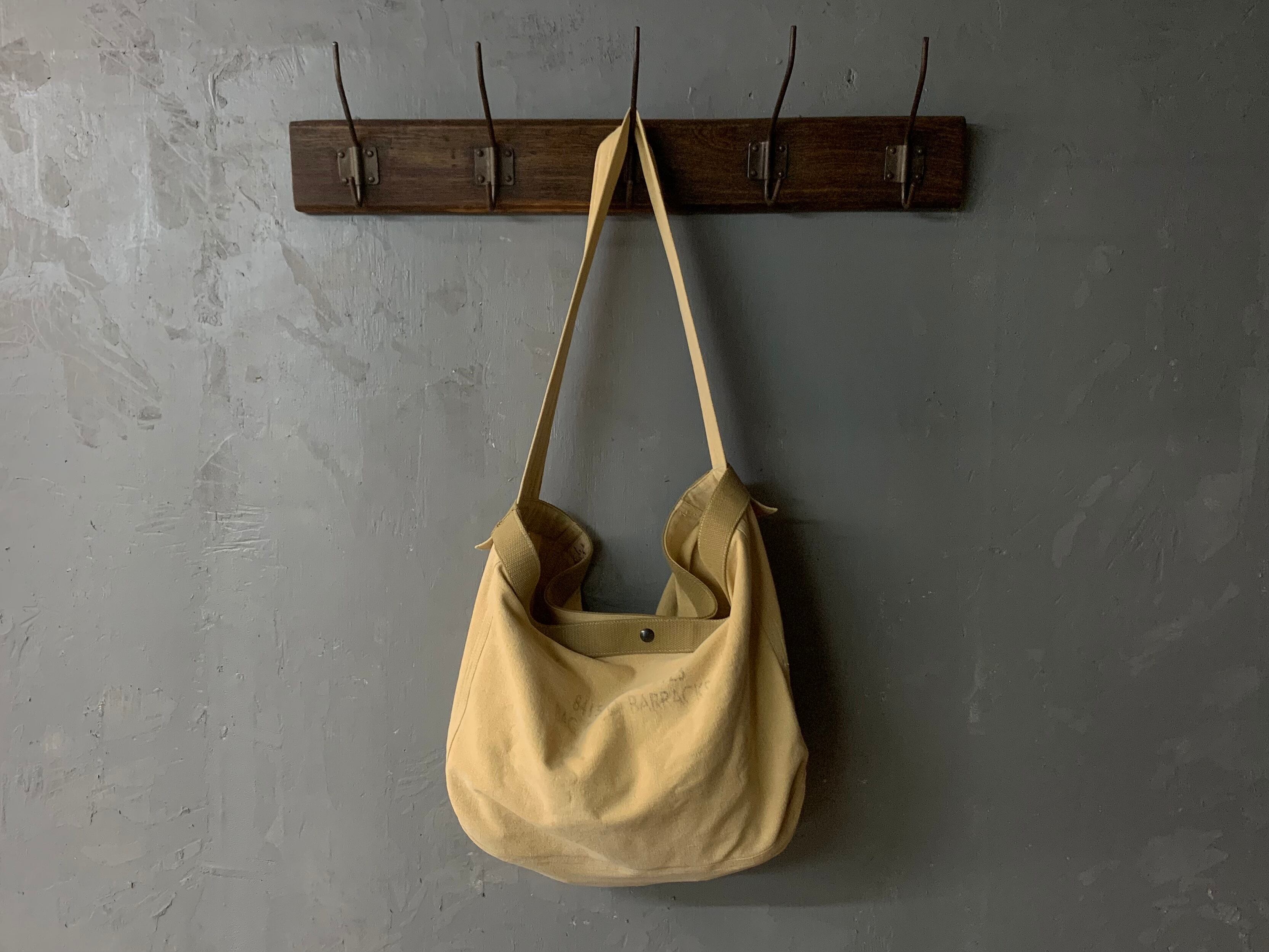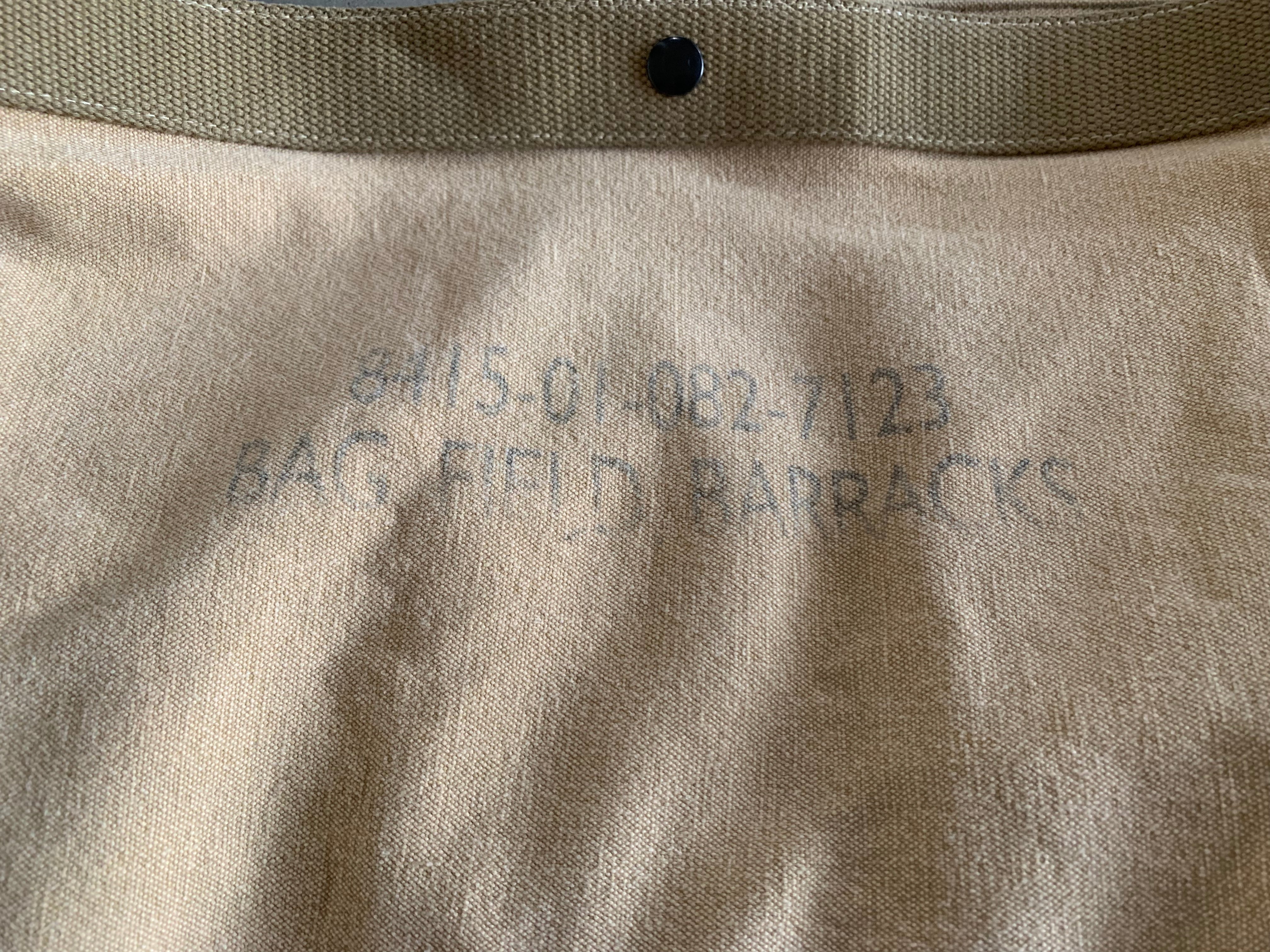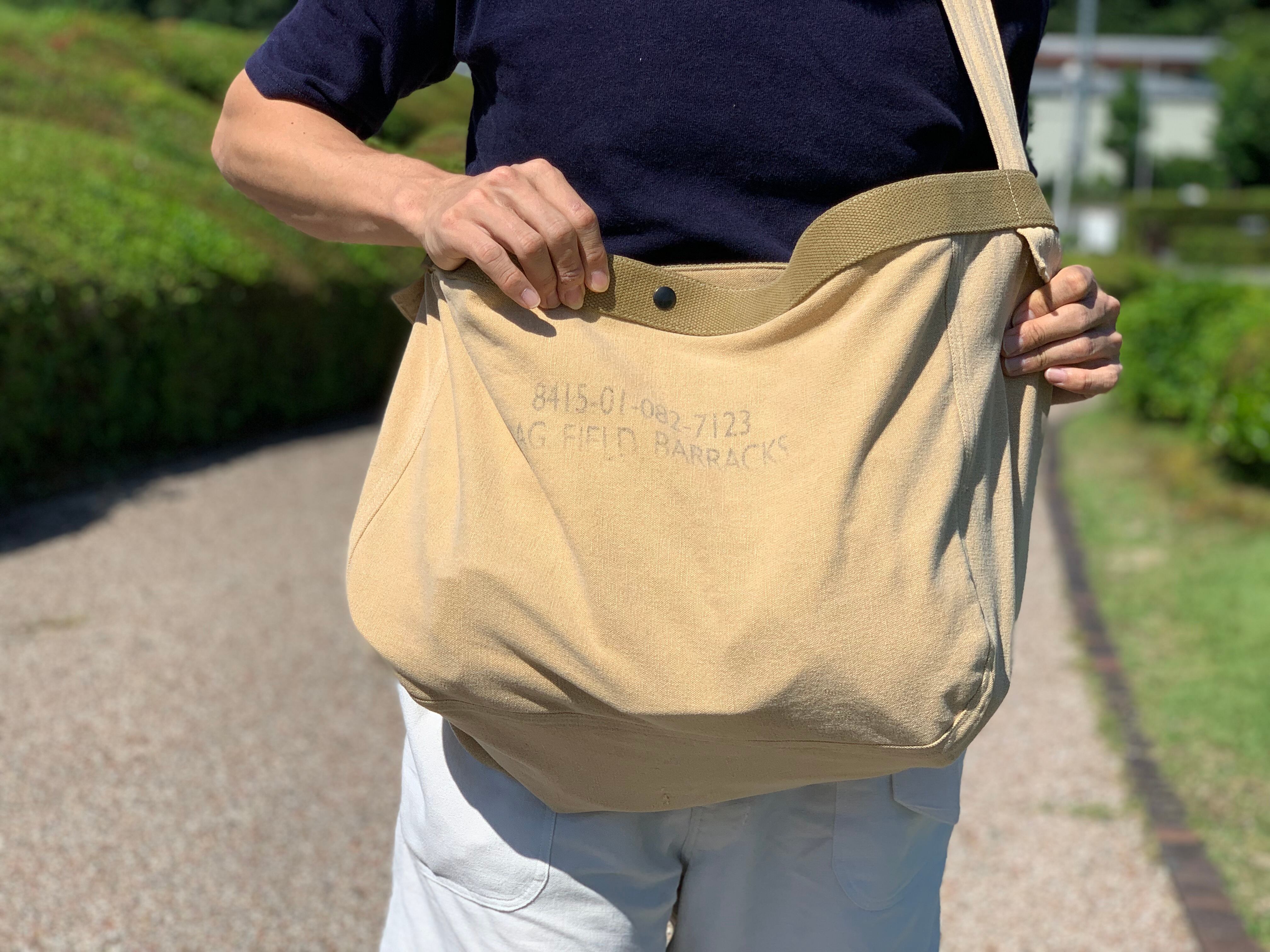 ボディーの生地は80年代頃、アメリカ軍のバラックバッグ。フロントに良い雰囲気の当時のステンシルが残っています。素材はおそらくコットン素材で、使いこまれたベージュがヴィンテージの雰囲気を醸し出してくれます。