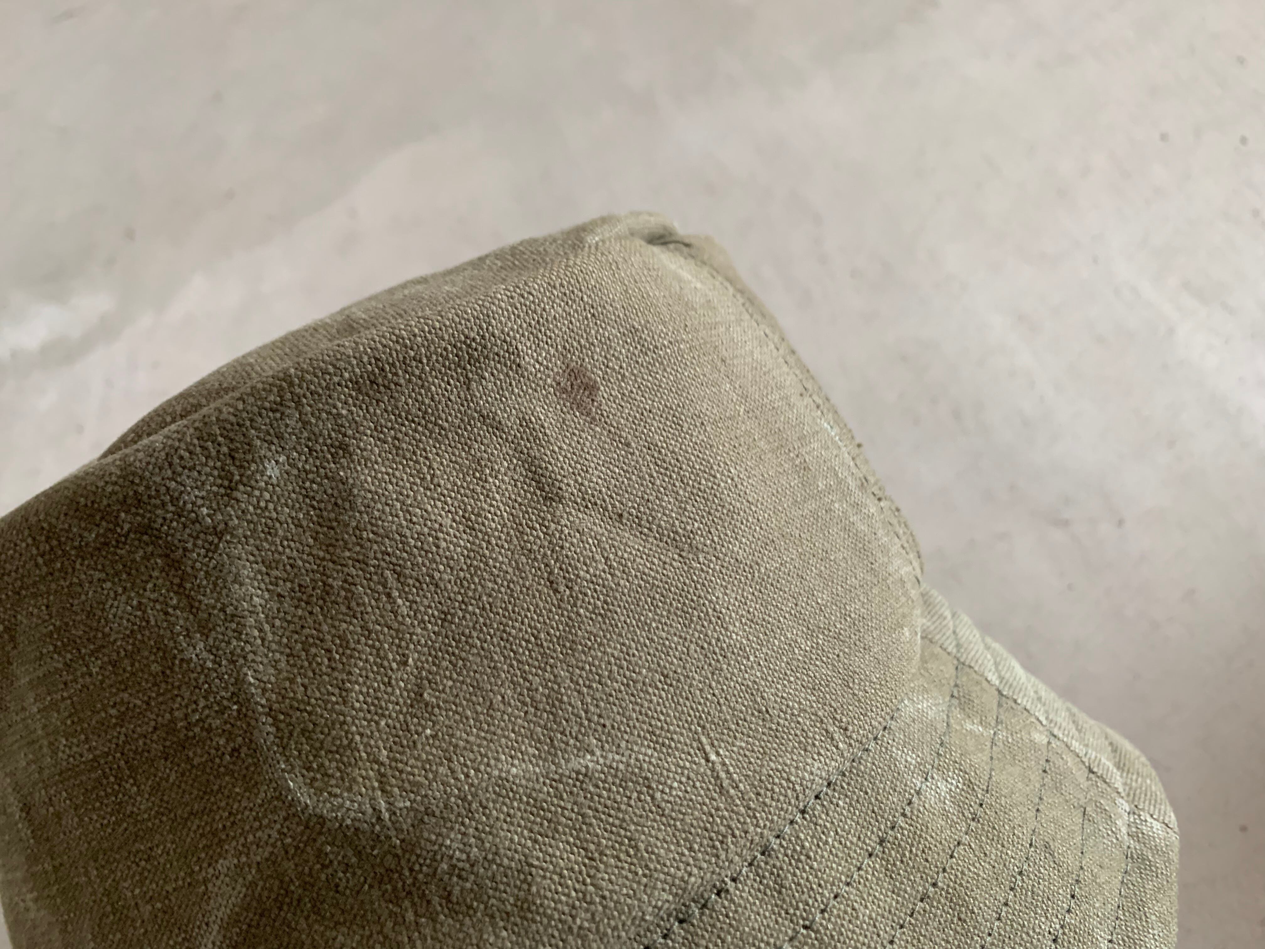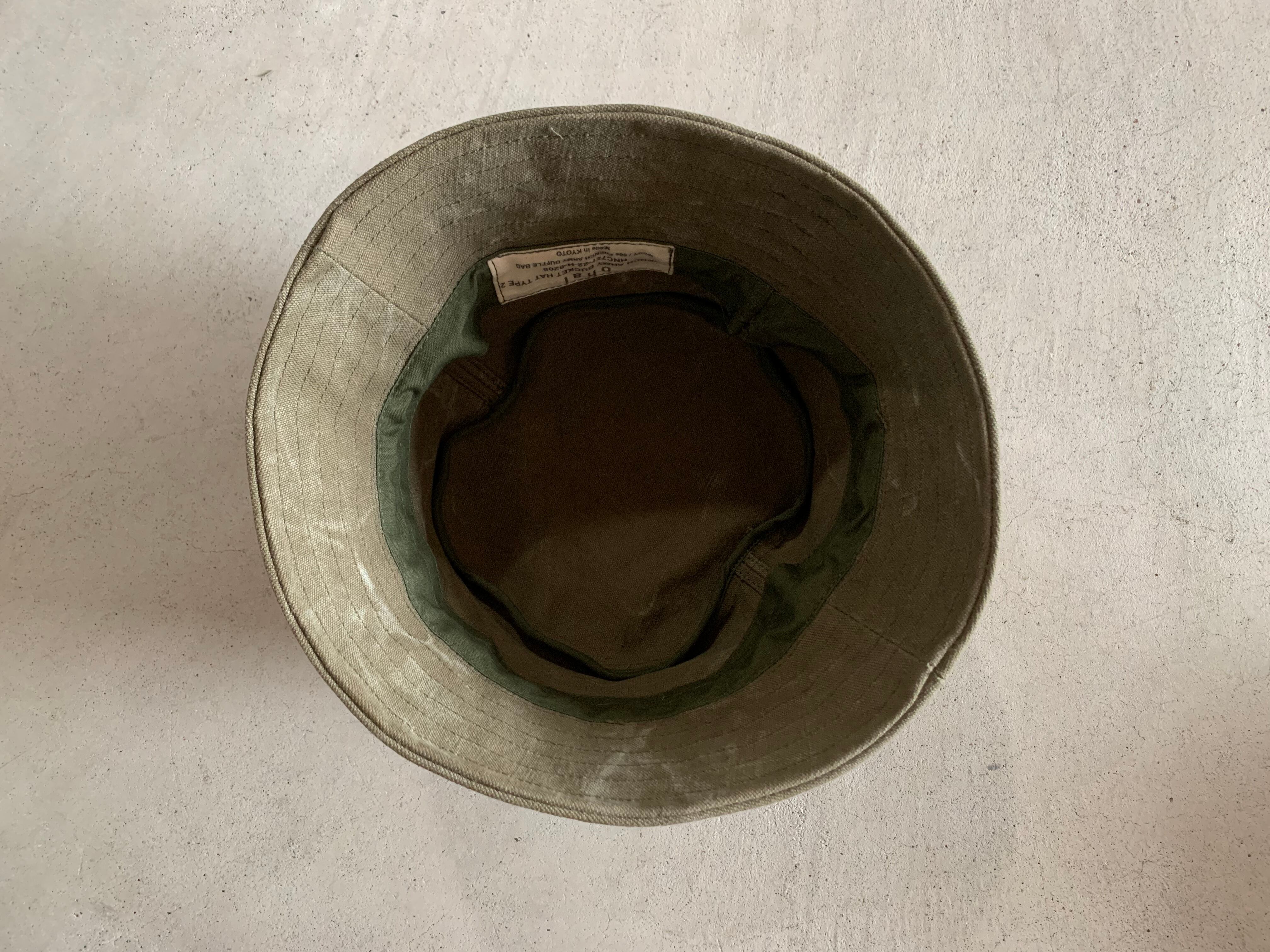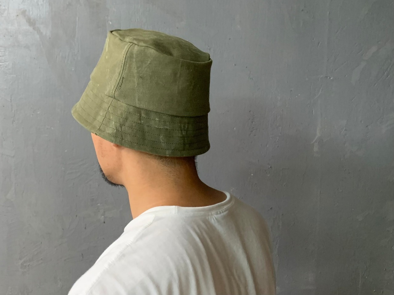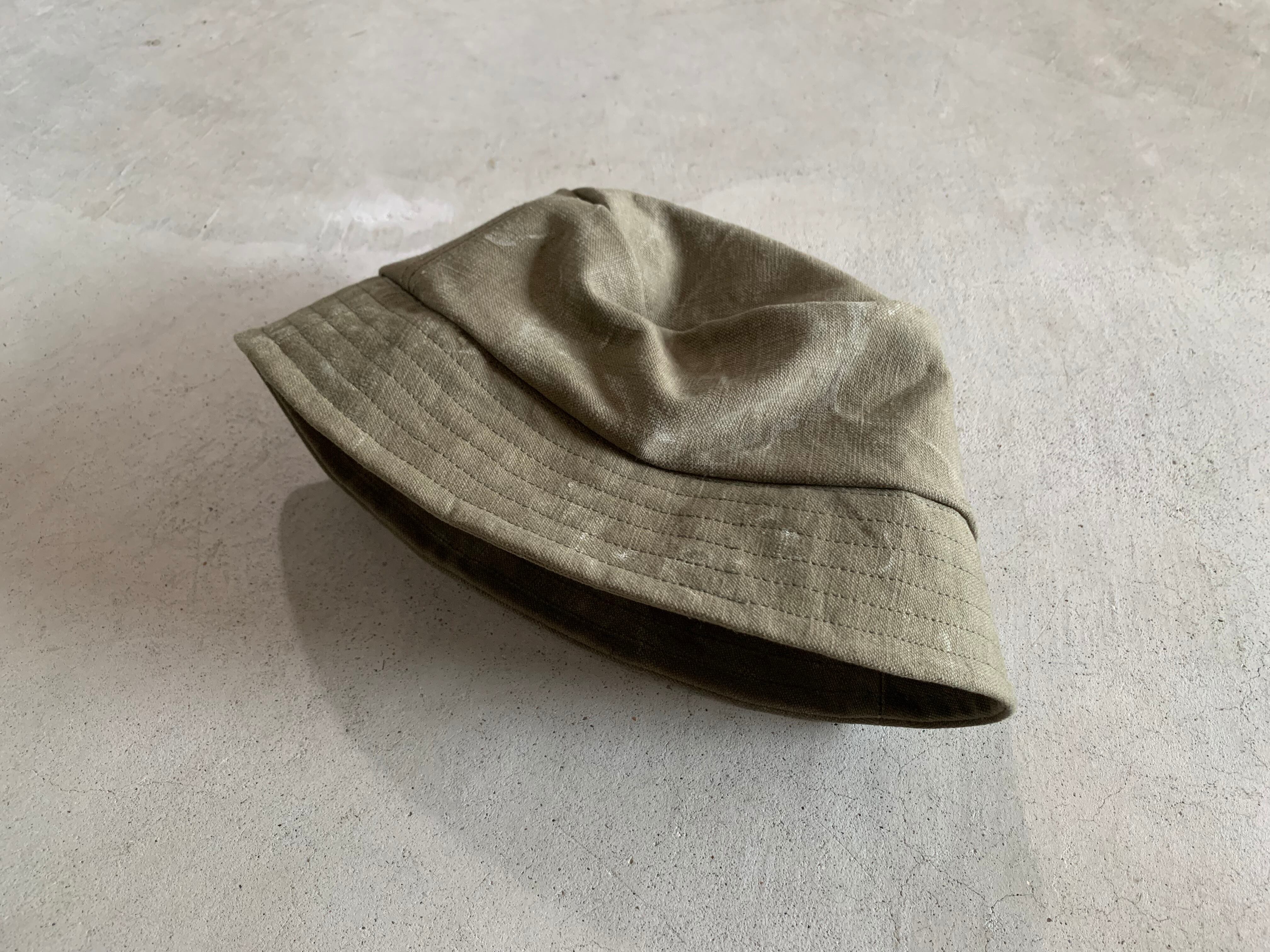 フランス軍で使用されていたダッフルバッグの生地でバケットハットを作成しました。素材は、ヴィンテージの雰囲気が漂う頑丈なコットンキャンバスです。