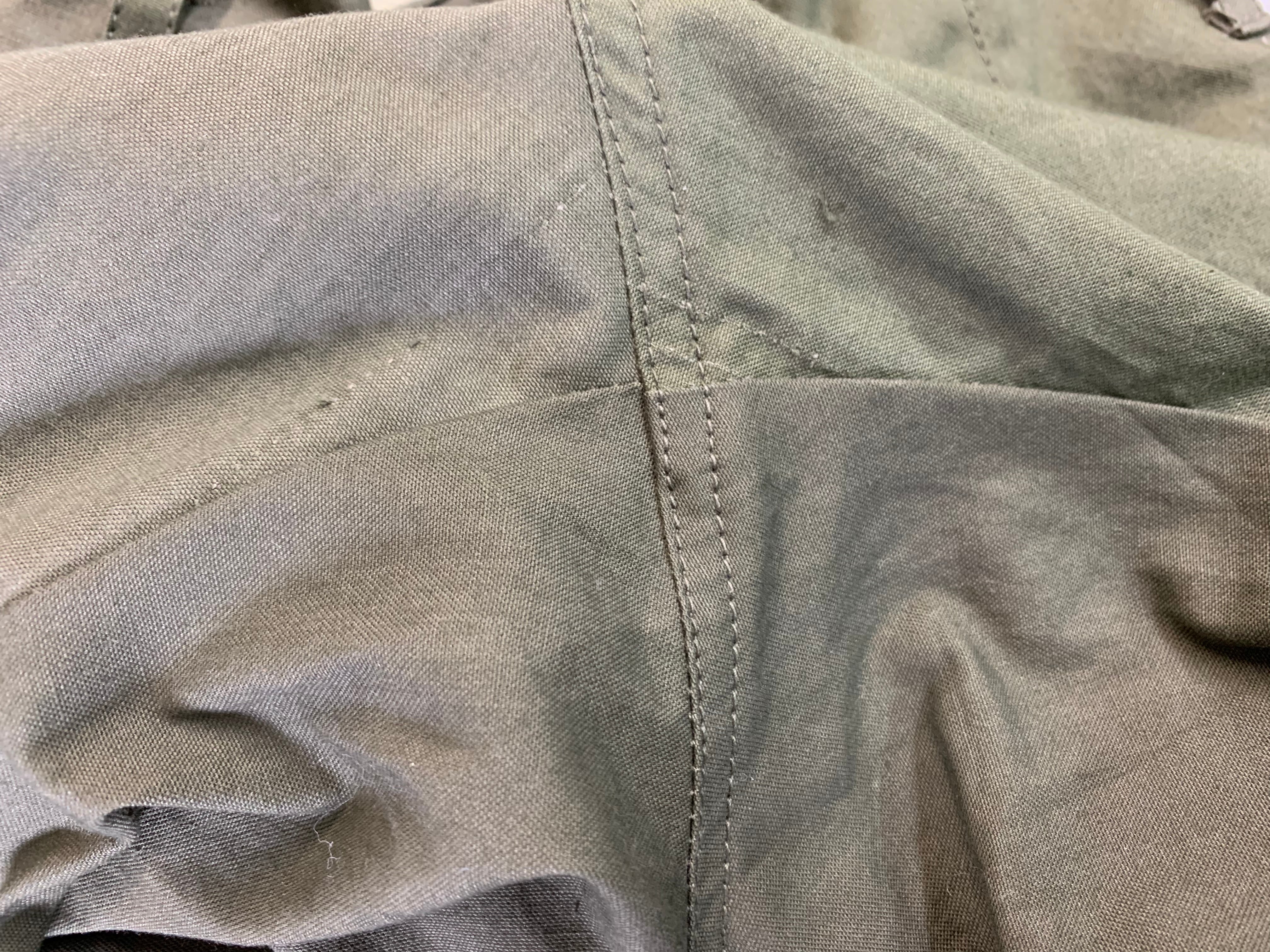 ボディーの生地は70年代、アメリカ軍のスリーピングバッグケース。ボタンは80年代、アメリカ軍のもの。糸は30番手の太めの綿糸で縫っているので、ミリタリー らしい武骨な雰囲気を醸し出しいます。