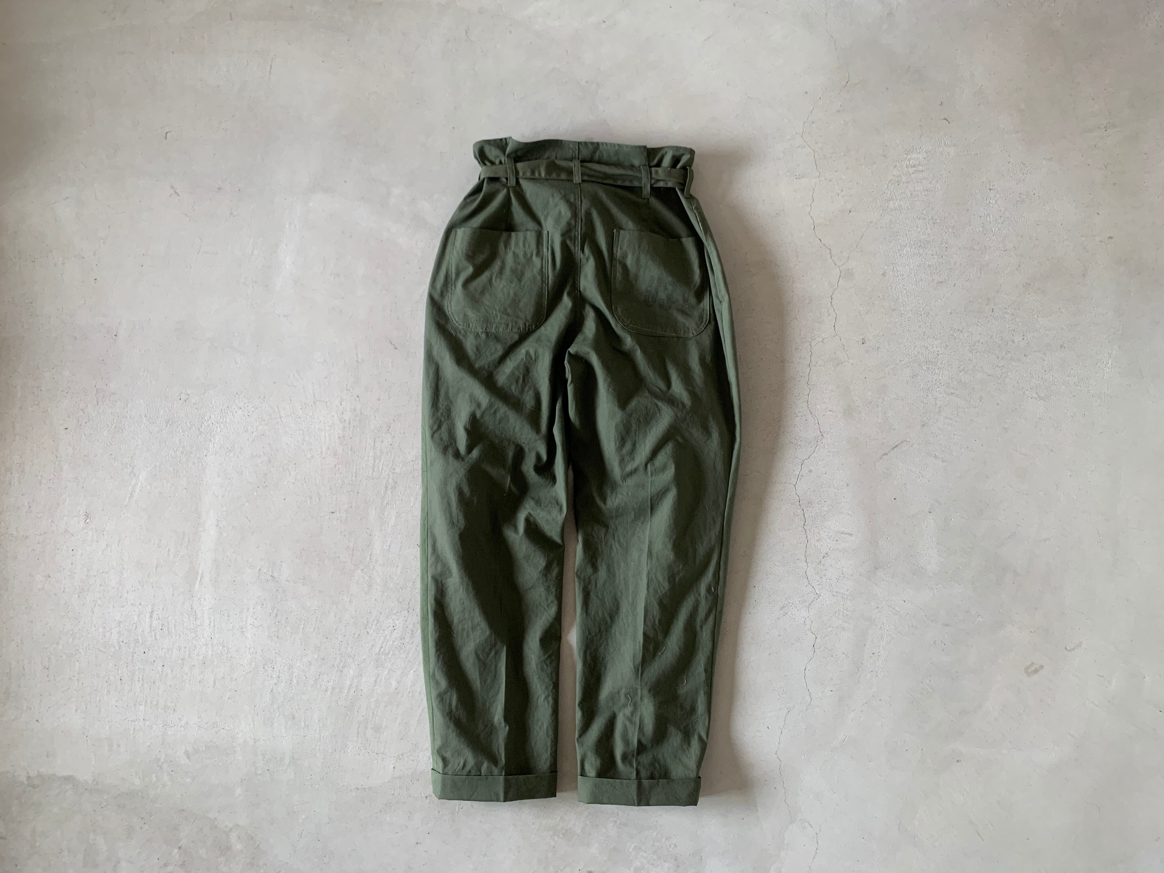 シルエットはセンタープレスが入ったキレイなシルエットです。履いた時にウエストがクシュッとギャザーができるようデザインしております。タックインをしてベルトでギュッとしめると独特な雰囲気が出ます。
