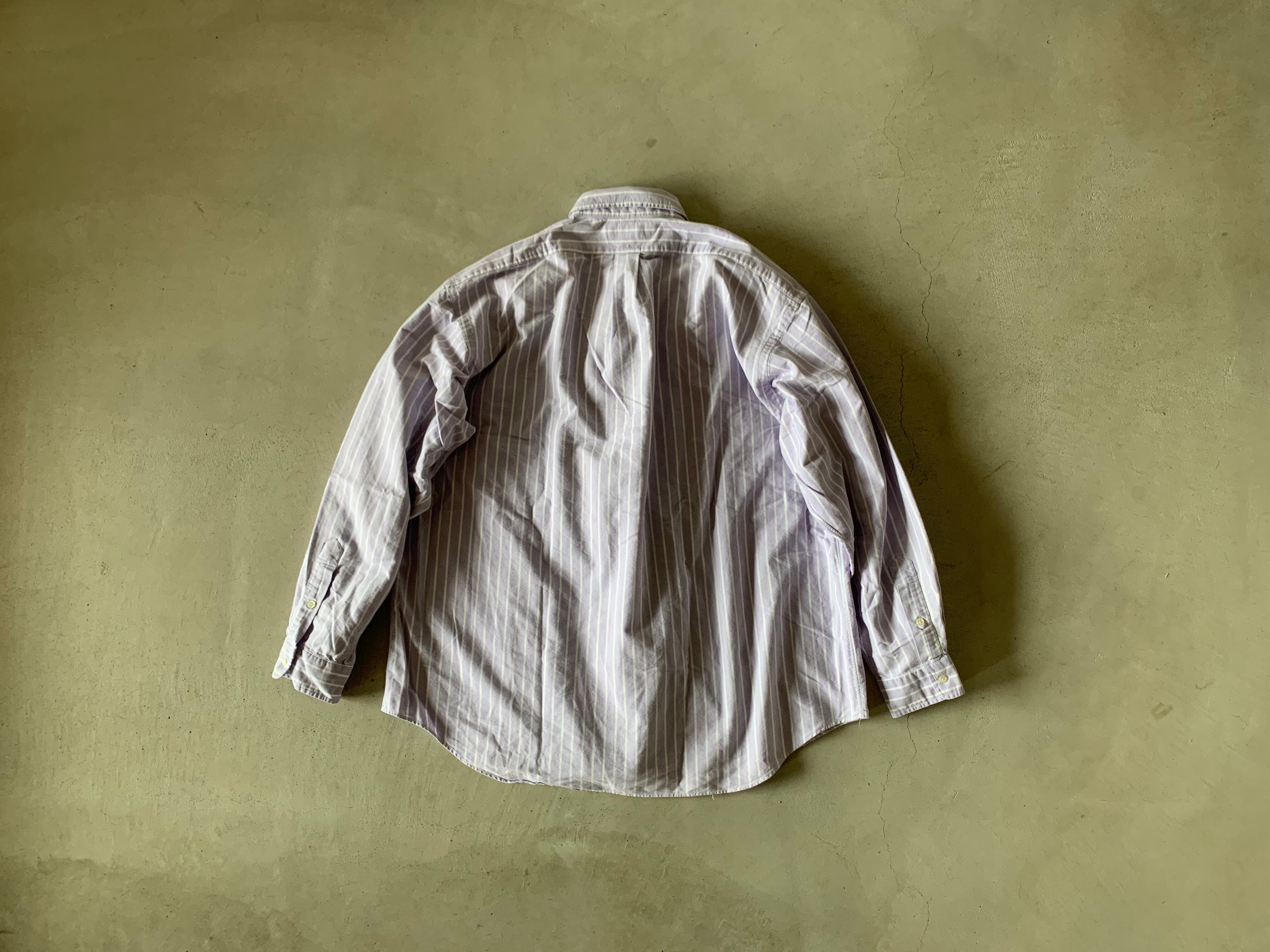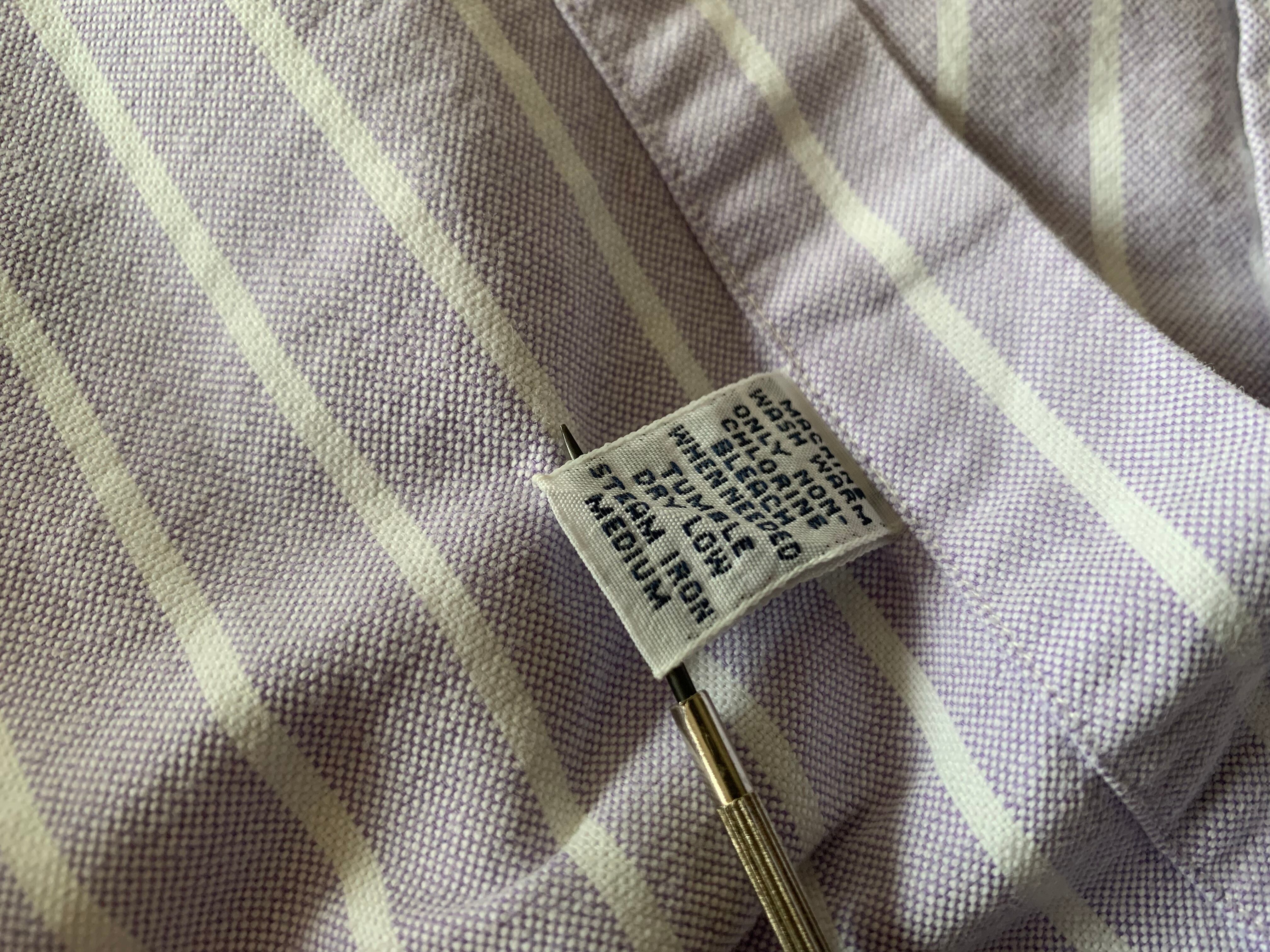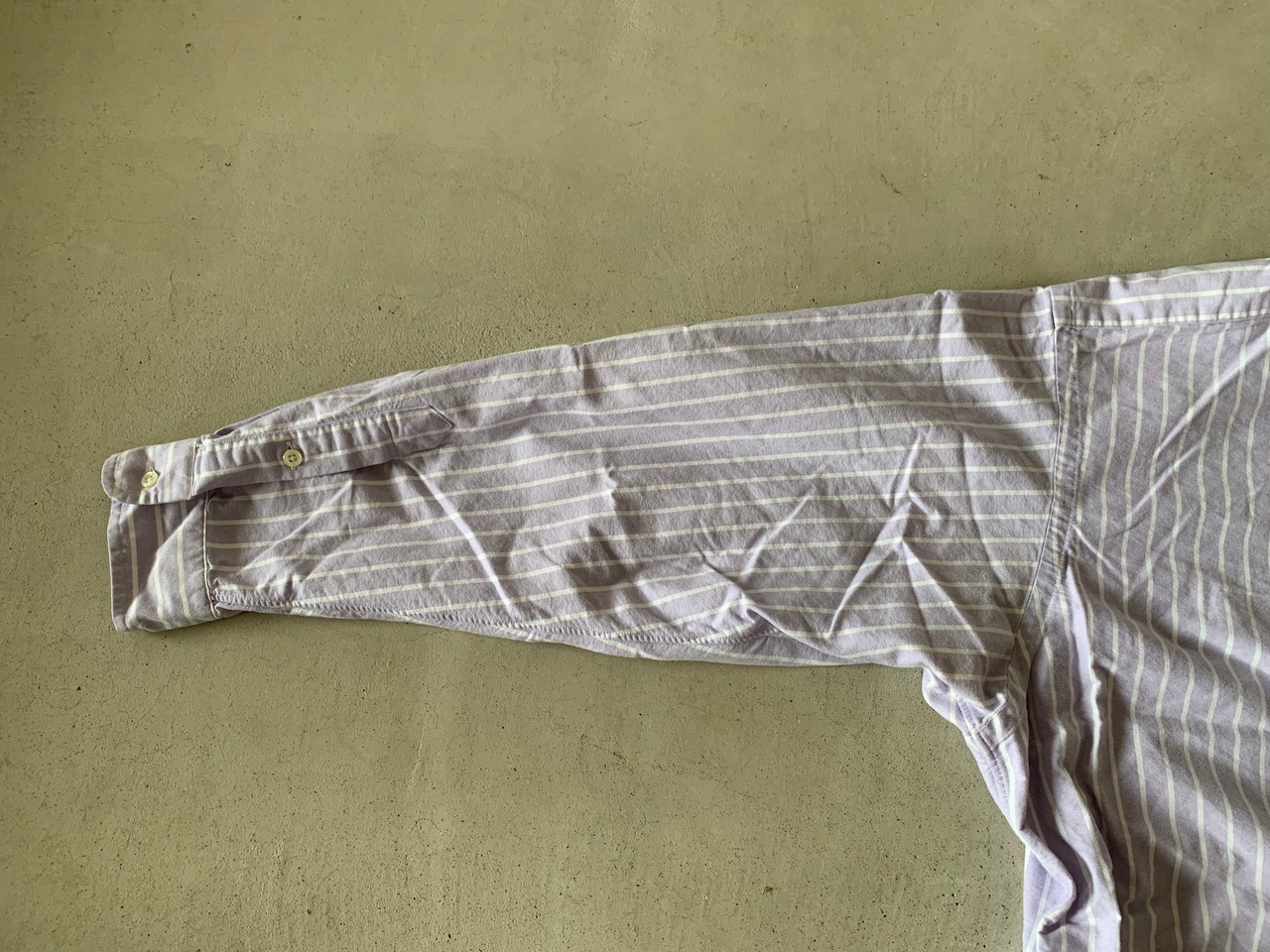 素材はコットン100%のオックスフォード生地で、ラベンダー×ホワイトのストライプ。