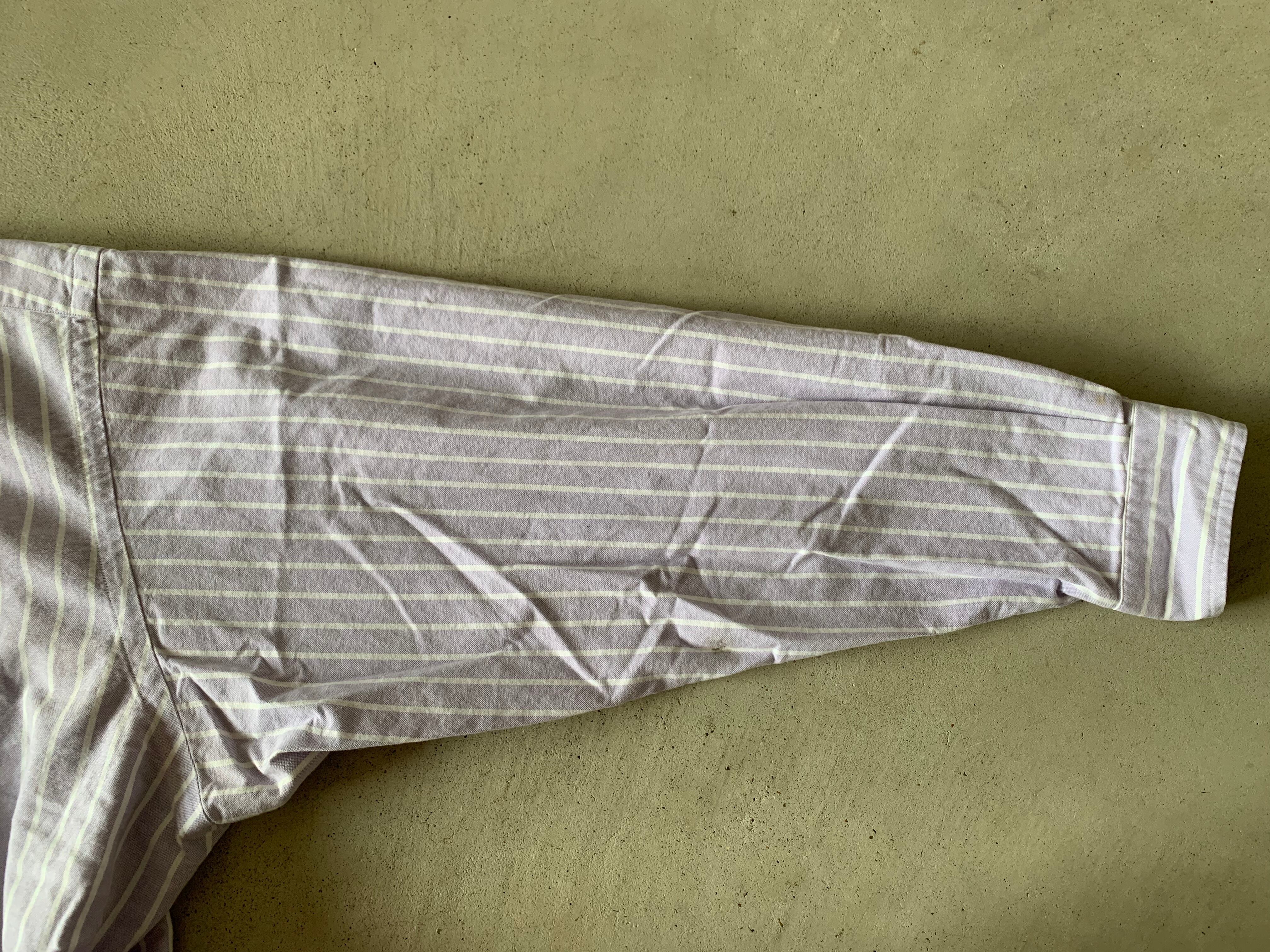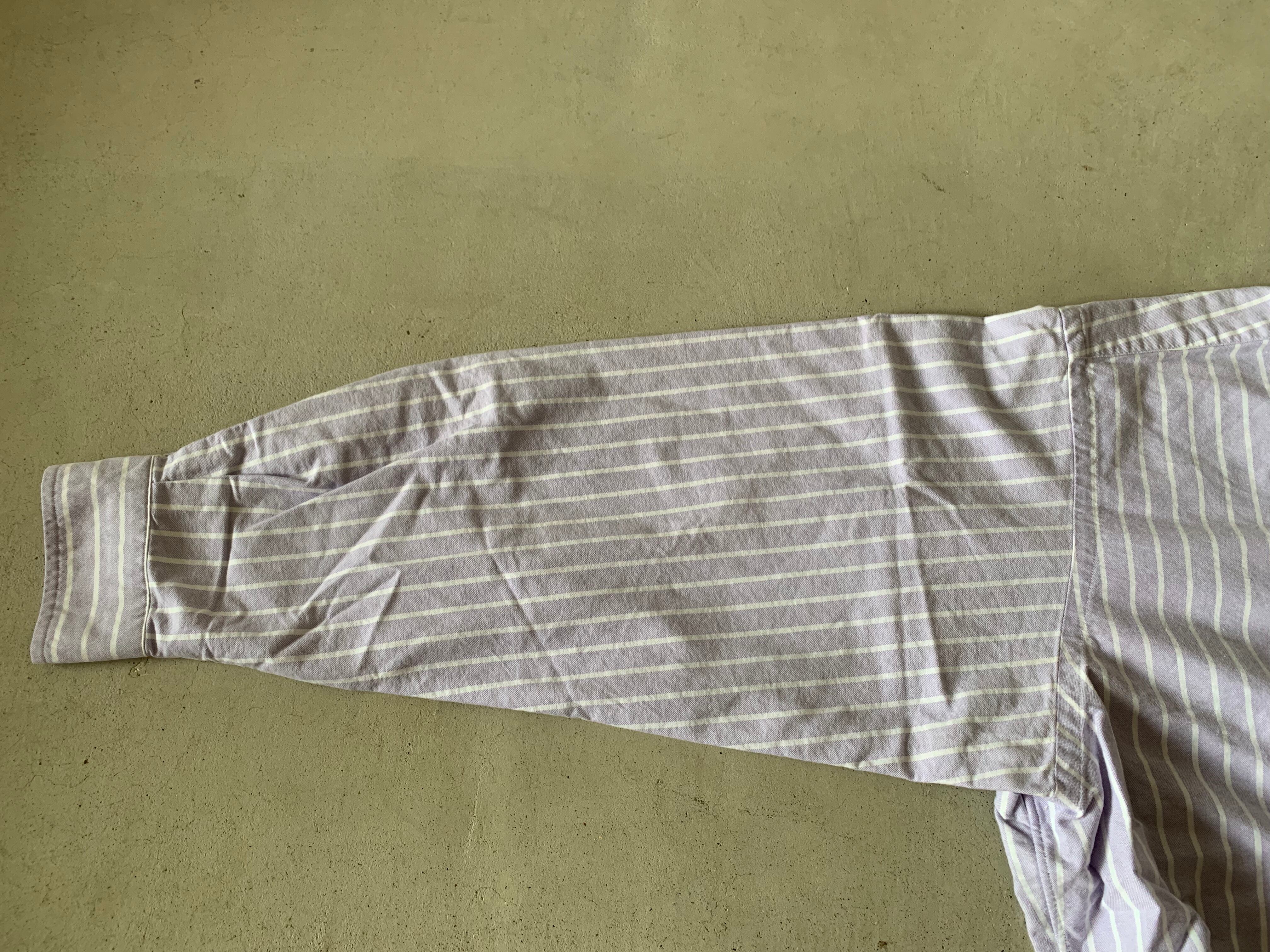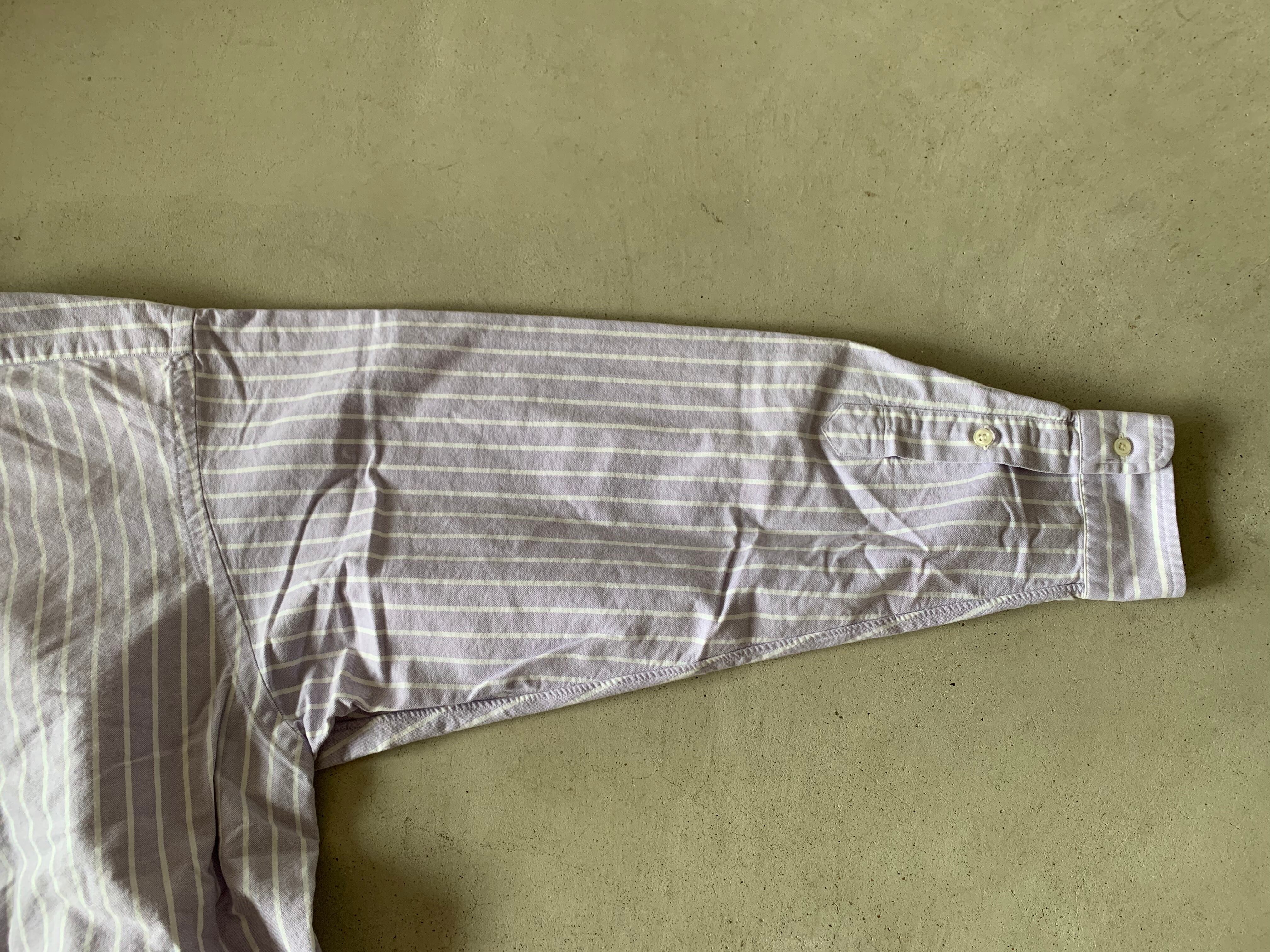 素材はコットン100%のオックスフォード生地で、ラベンダー×ホワイトのストライプ。