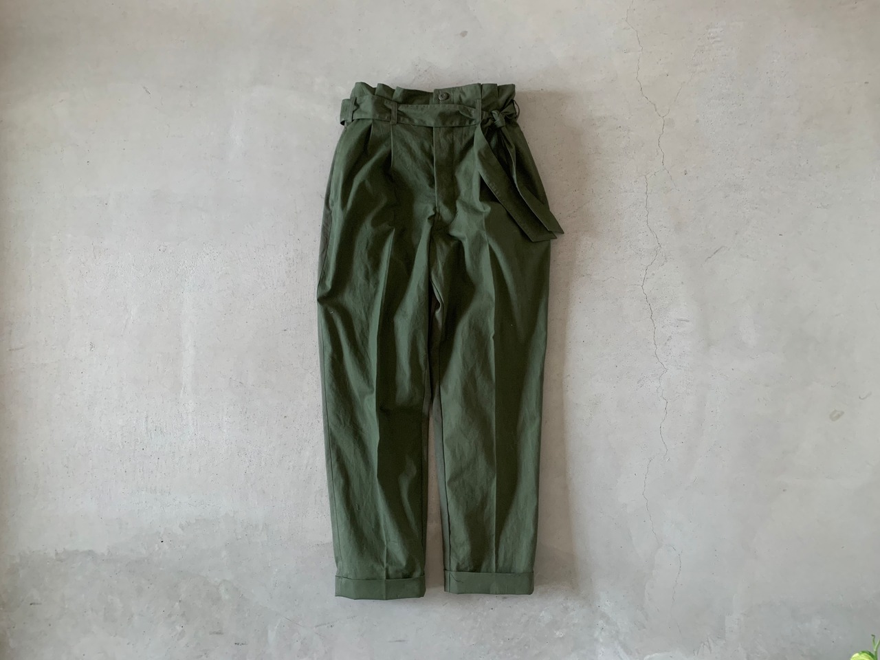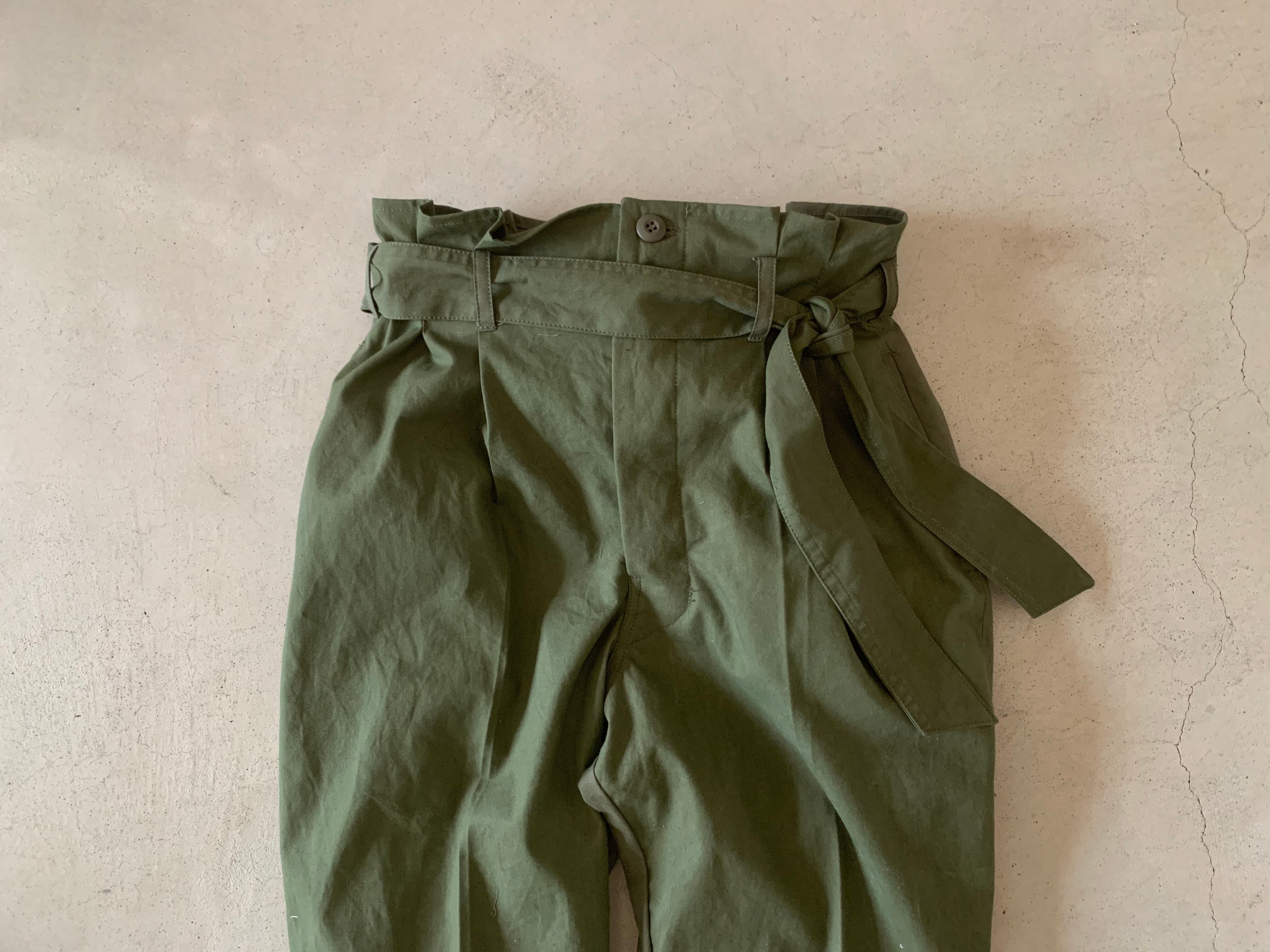 シルエットはセンタープレスが入ったキレイなシルエットです。履いた時にウエストがクシュッとギャザーができるようデザインしております。タックインをしてベルトでギュッとしめると独特な雰囲気が出ます。