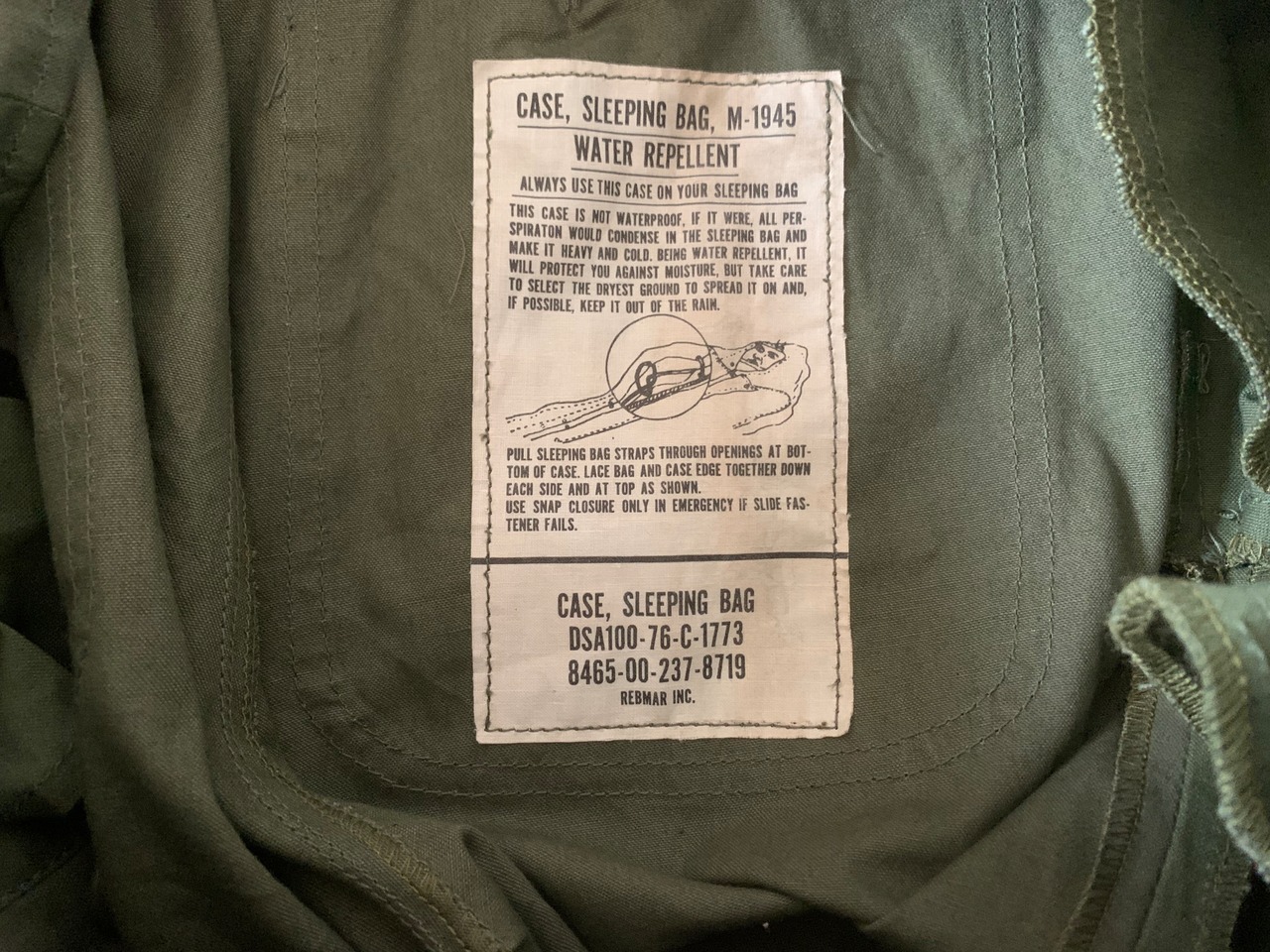内側にはスリーピングバッグケースについていたタグをつけています。76年に軍に納入されたことがわかります。
