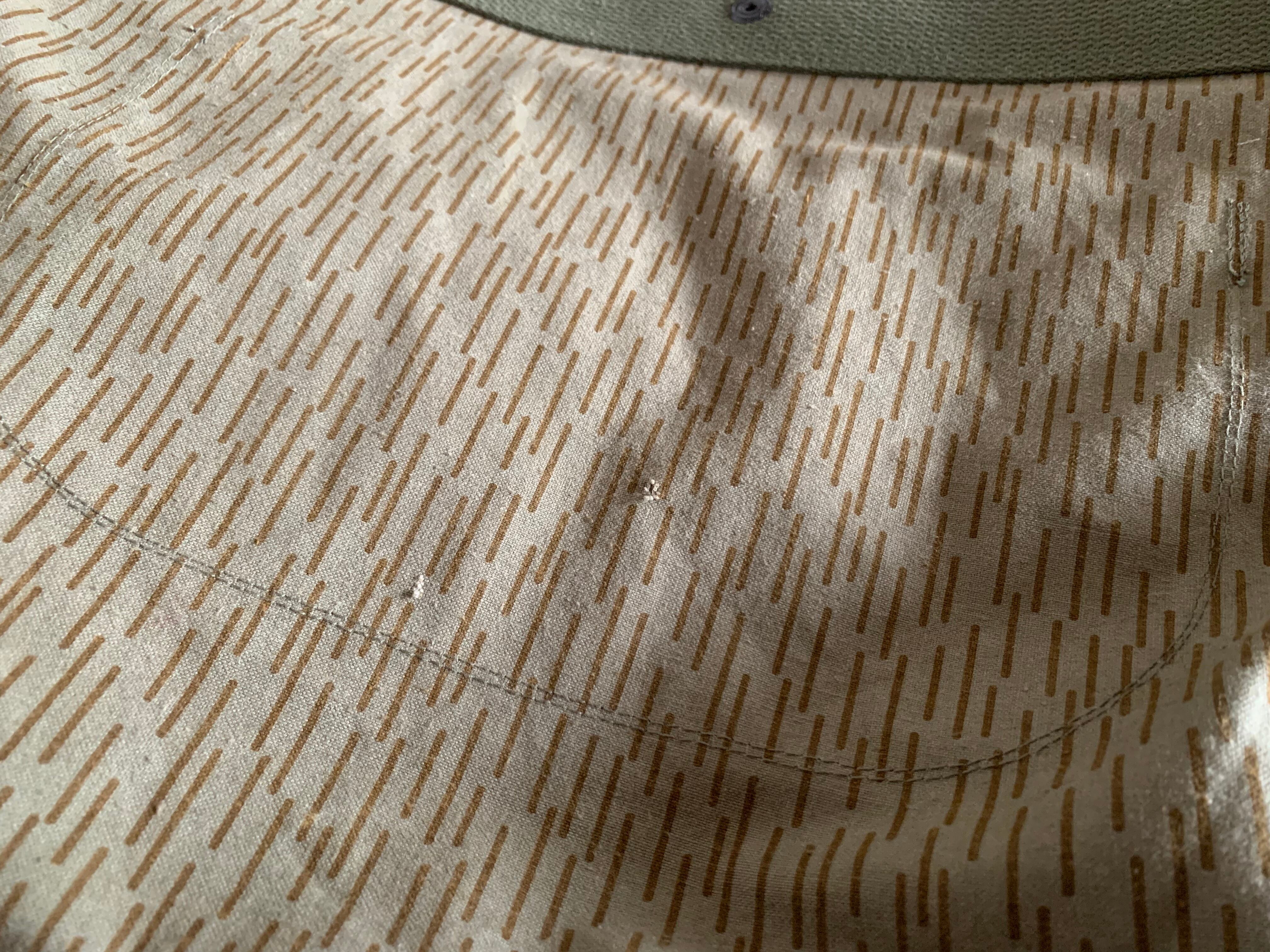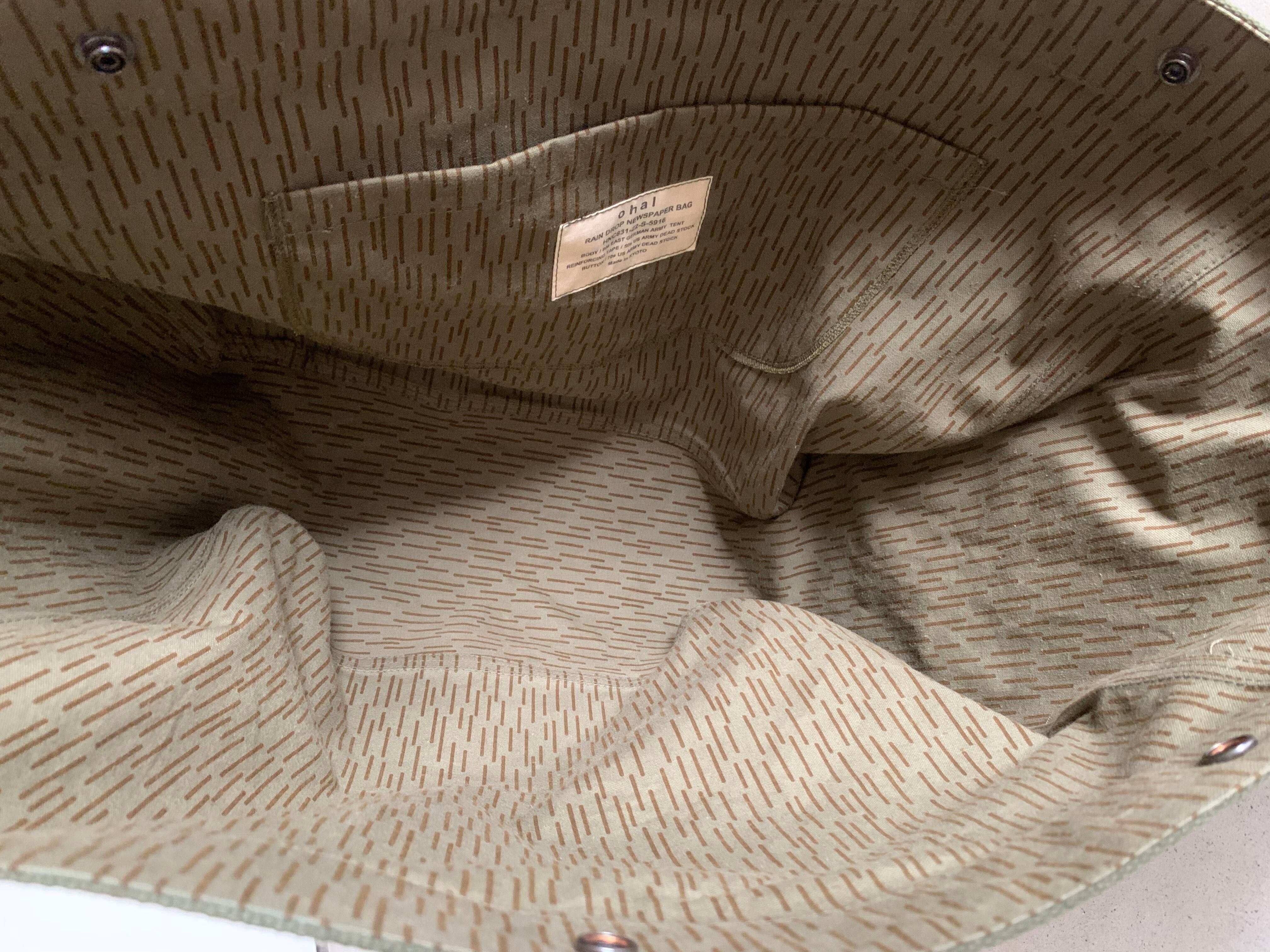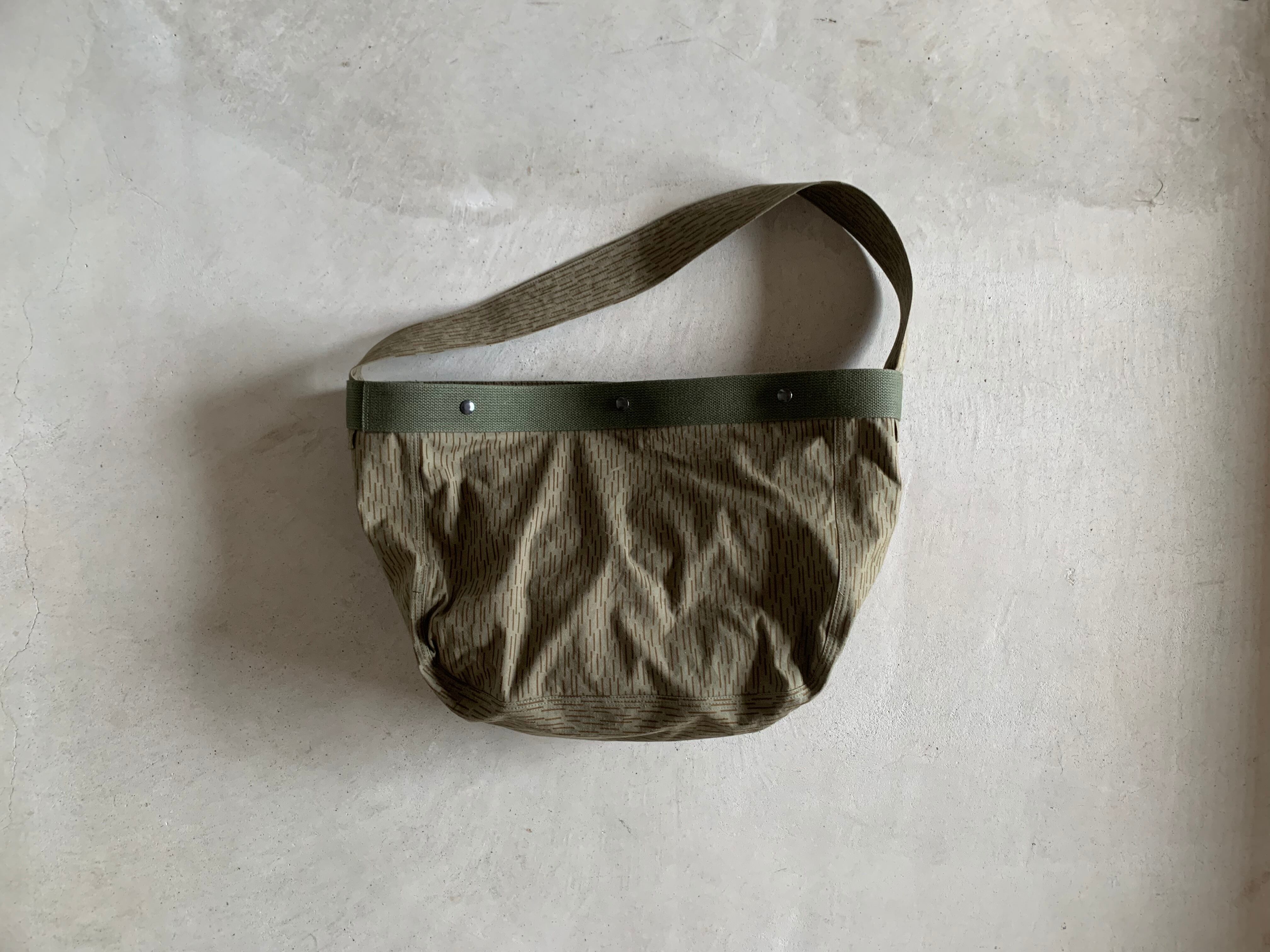 ボディーの生地は80年代頃、東ドイツ軍のレインドロップカモのハーフテント生地。素材はハリのあるコットン。雨模様の飽きのこないカモ柄が目を惹きます。所々に小傷がございますが、そういった物も含めてデザインとしております。(画像でご確認ください)なので、ハードに使っても多少の汚れなどは気にもなりません。細かな汚れなども味として捉えて、経年変化を楽しんでもらえればと思います。