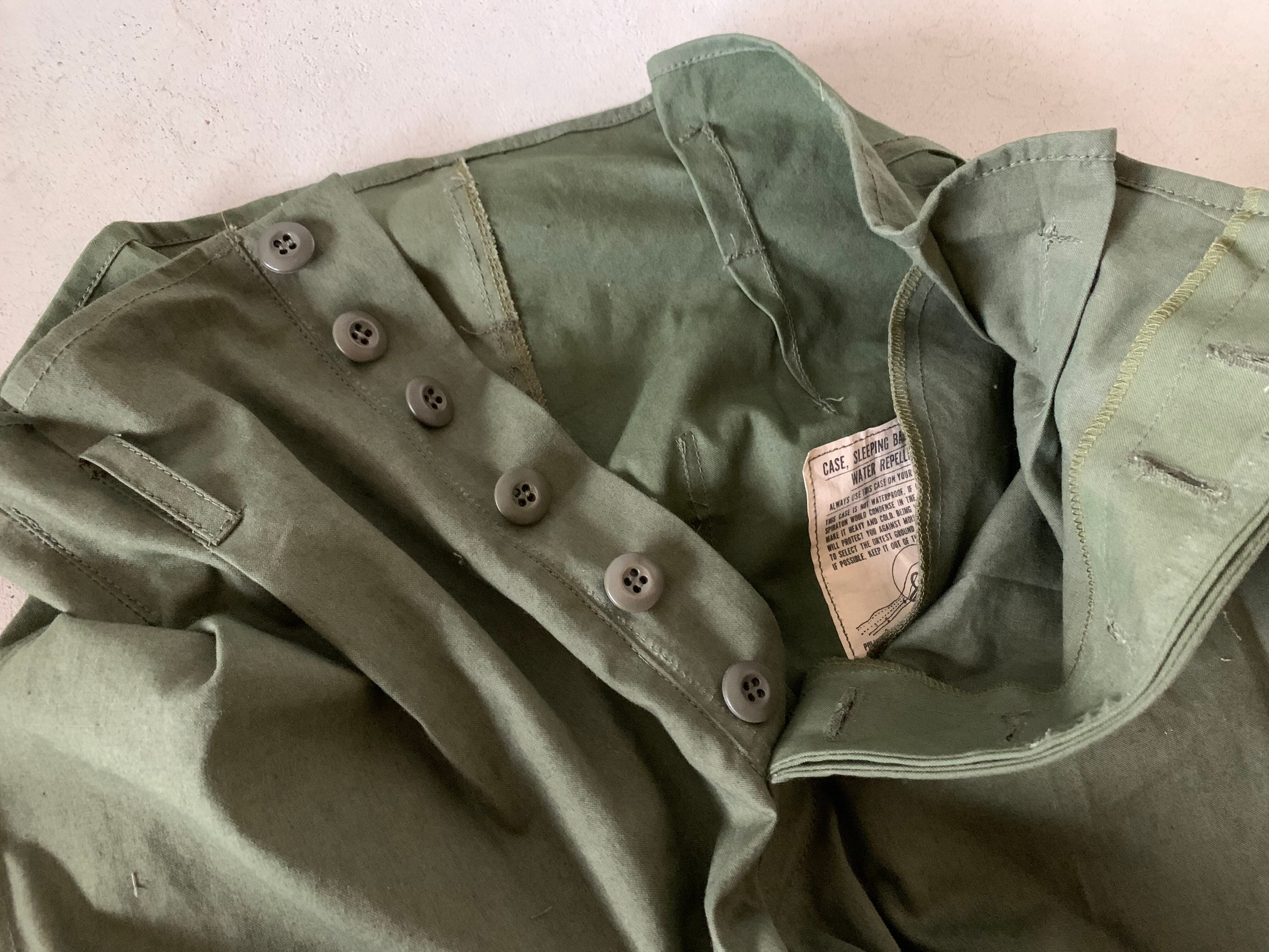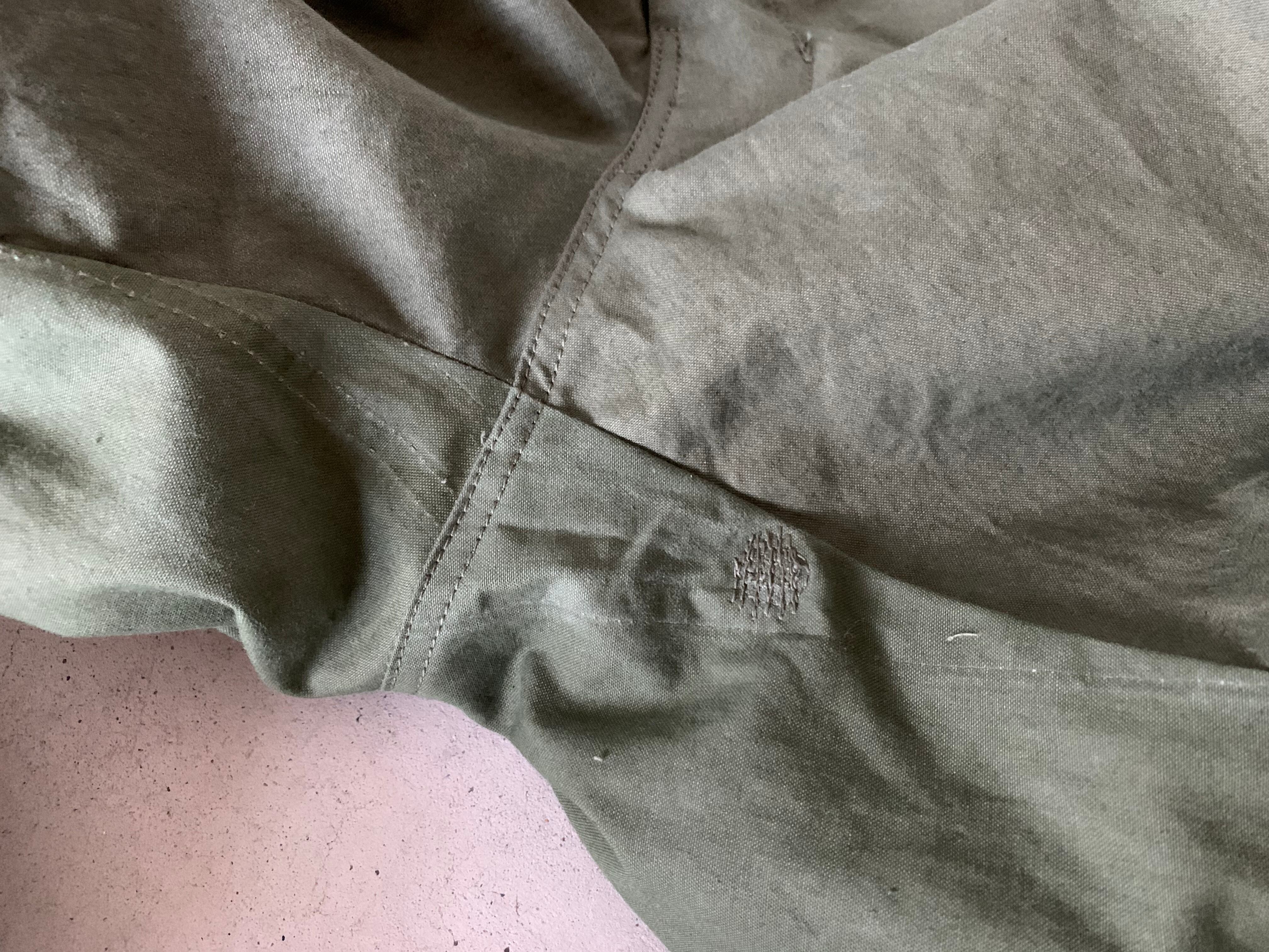 ボディーの生地は70年代、アメリカ軍のスリーピングバッグケース。ボタンは80年代、アメリカ軍のもの。糸は30番手の太めの綿糸で縫っているので、ミリタリー らしい武骨な雰囲気を醸し出しいます。