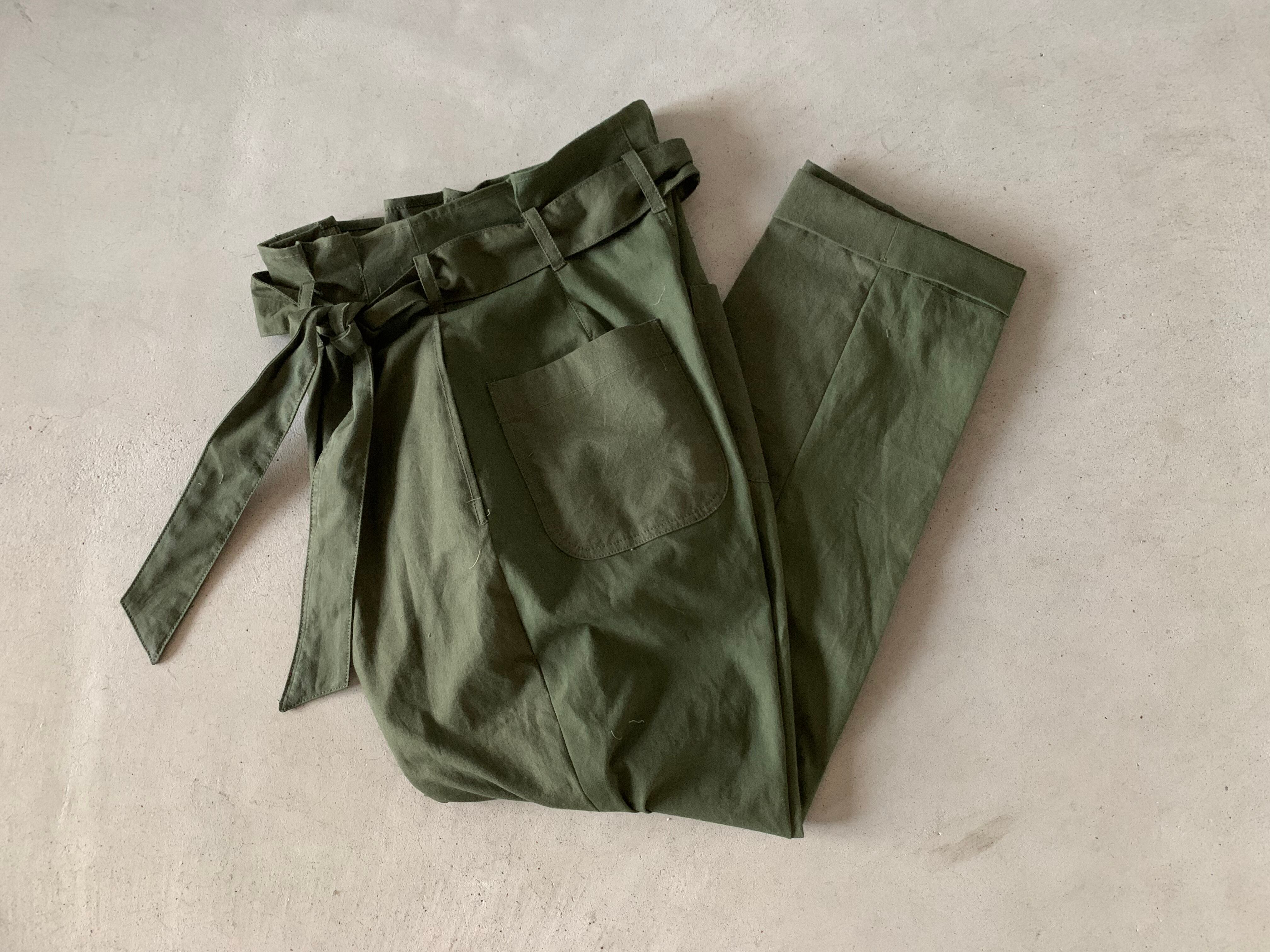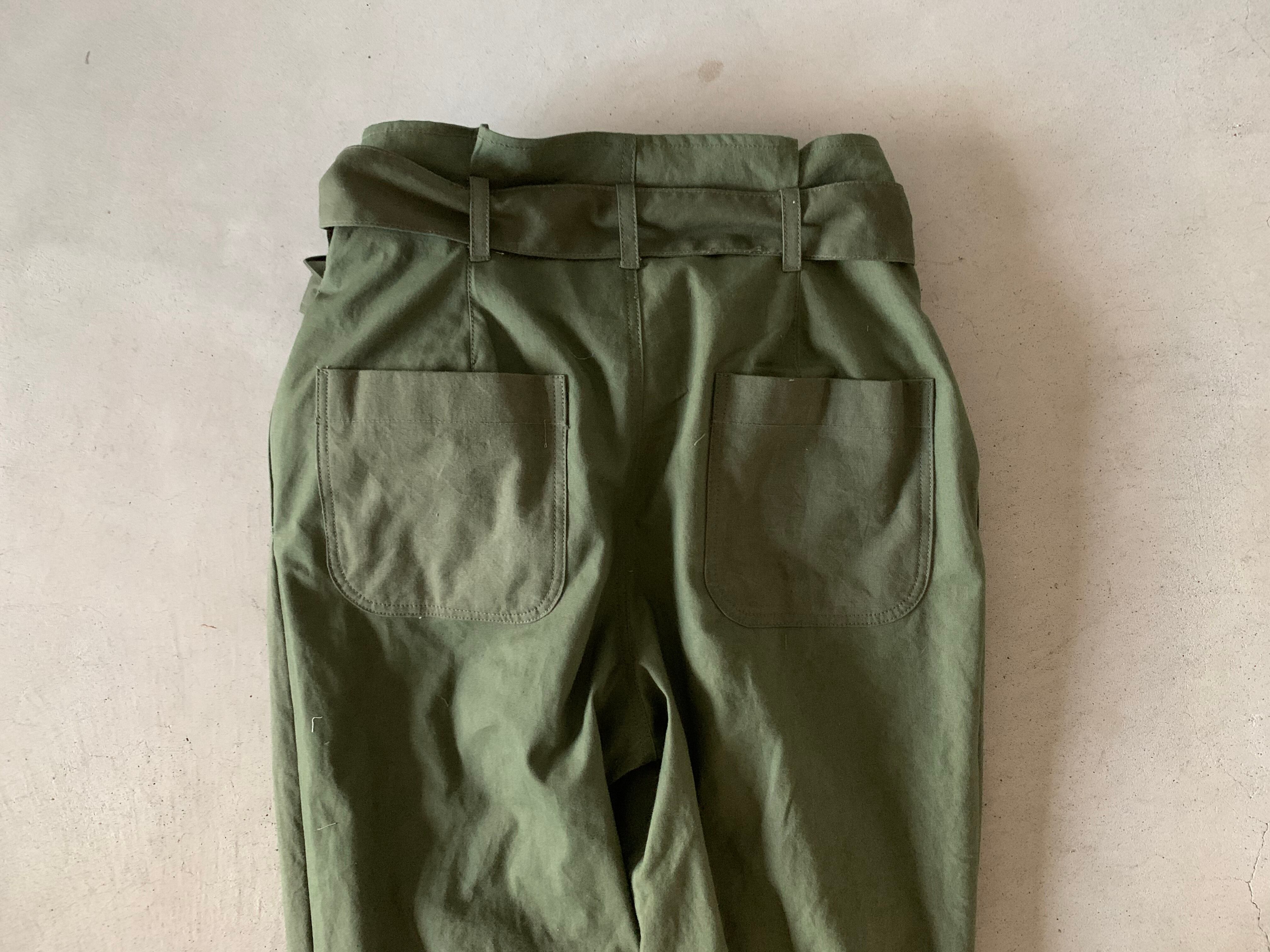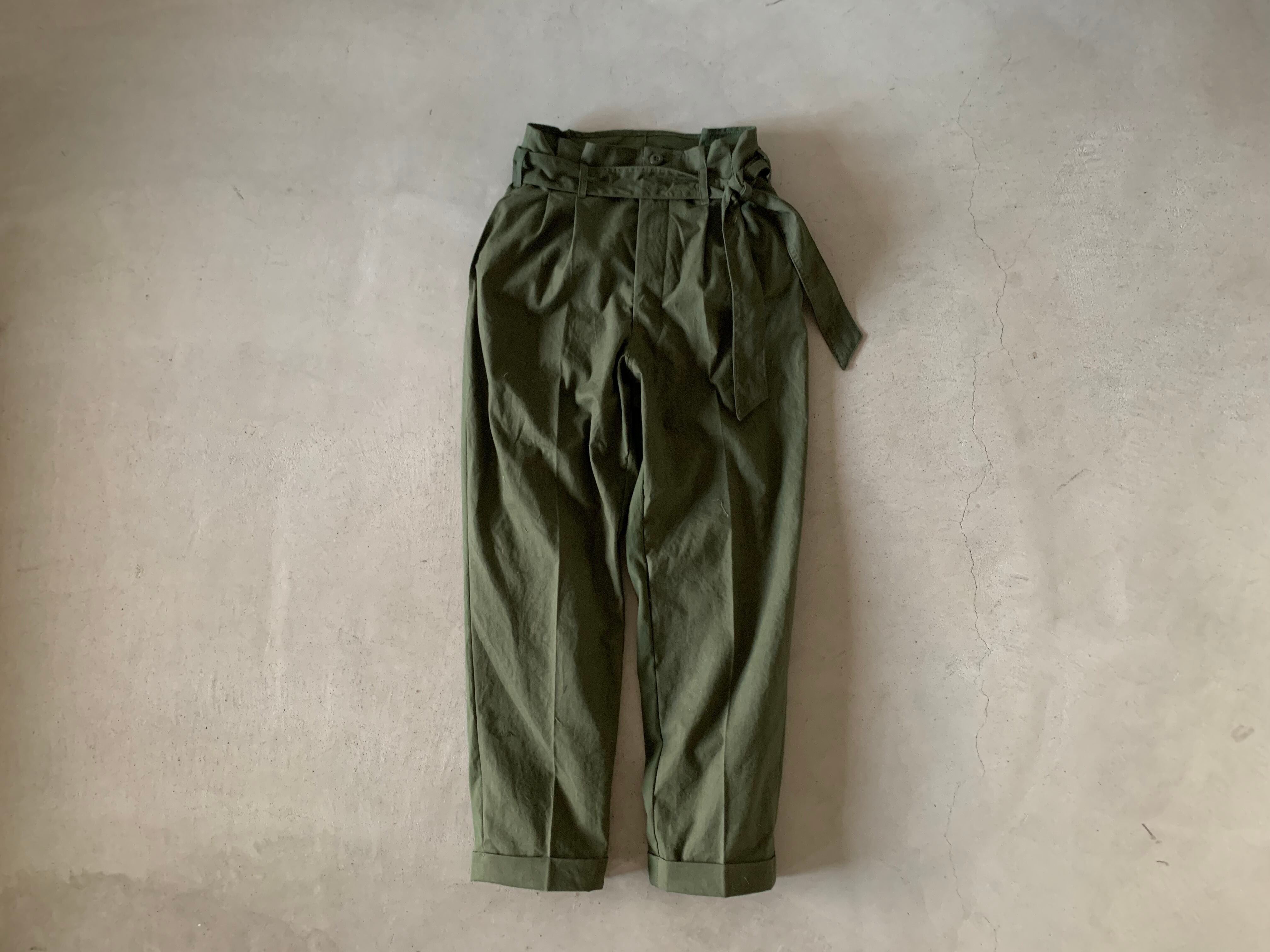 シルエットはセンタープレスが入ったキレイなシルエットです。履いた時にウエストがクシュッとギャザーができるようデザインしております。タックインをしてベルトでギュッとしめると独特な雰囲気が出ます。