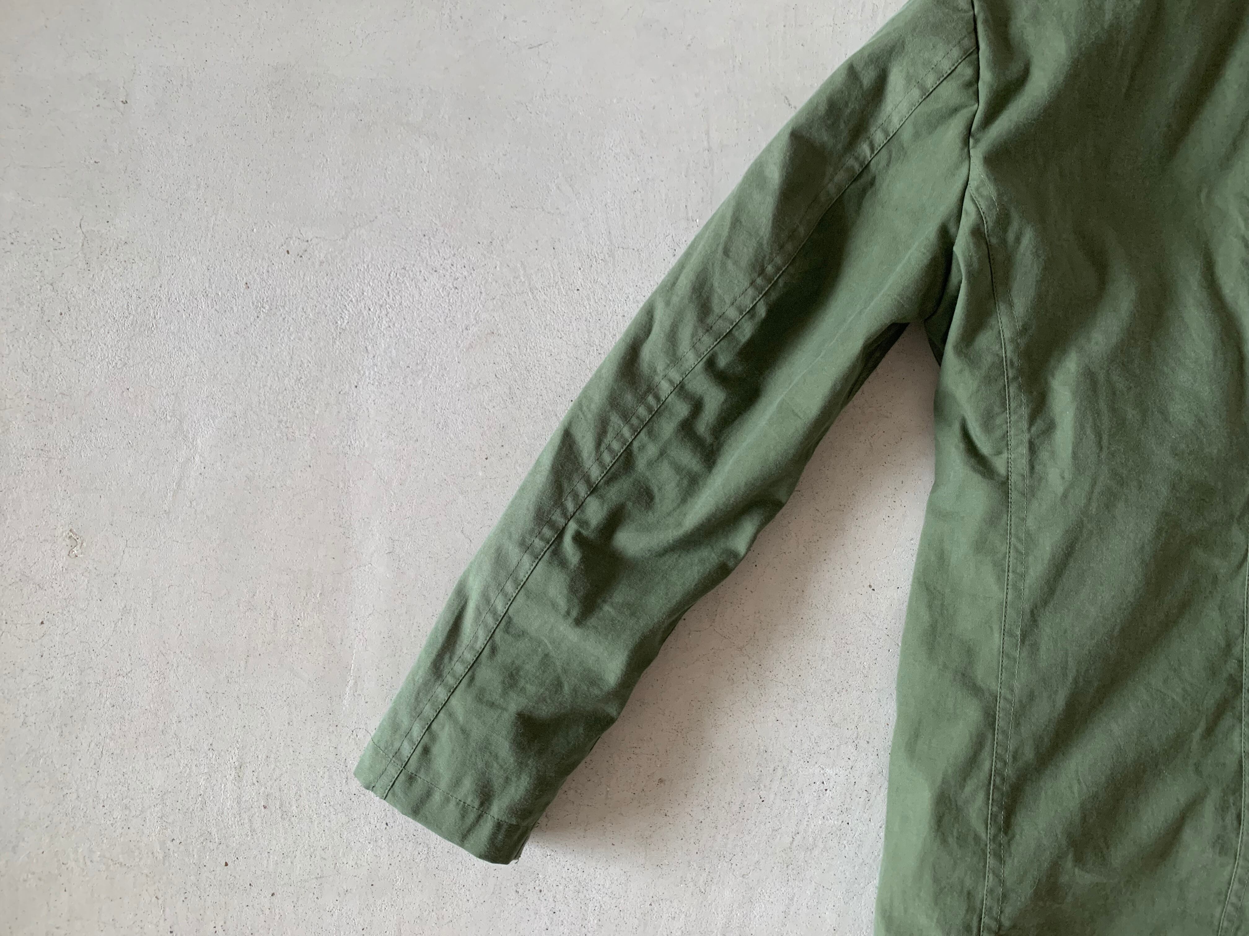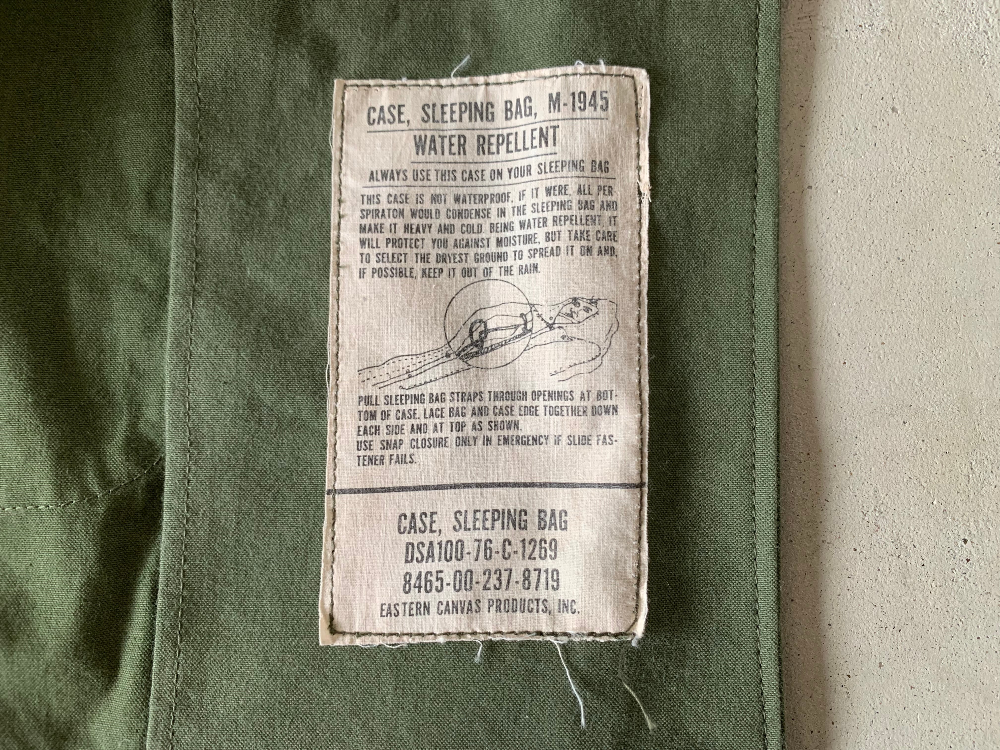 ボディーは、70年代アメリカ軍のスリーピングバッグケースの生地。コットン100%で通気性の良い素材感。一年通して使える生地かと思います。糸はヴィンテージの雰囲気を損なわないように、30番手の綿糸で縫っております。胸にはUSのステンシルが入っていた箇所を切り取り胸ポケットとして取り付けました。