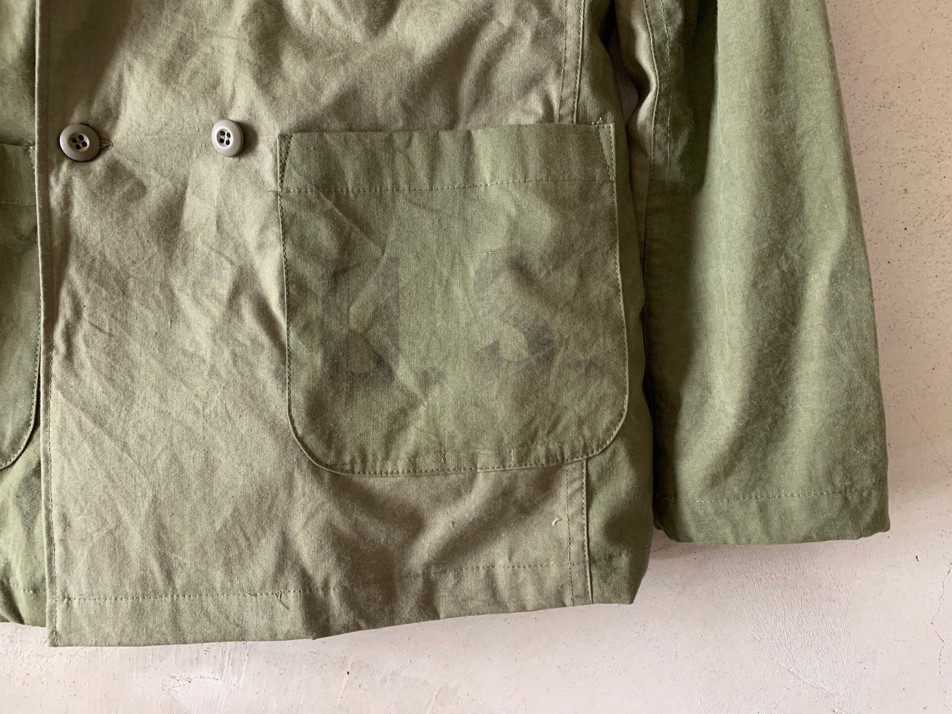 ボディーは、40年代アメリカ軍のスリーピングバッグケースの生地。コットン100%で通気性の良い素材感。一年通して使える生地かと思います。糸はヴィンテージの雰囲気を損なわないように、30番手の綿糸で縫っております。左ポケットにはUSの大きめのステンシルが入っていた箇所を切り取り胸ポケットとして取り付けました。