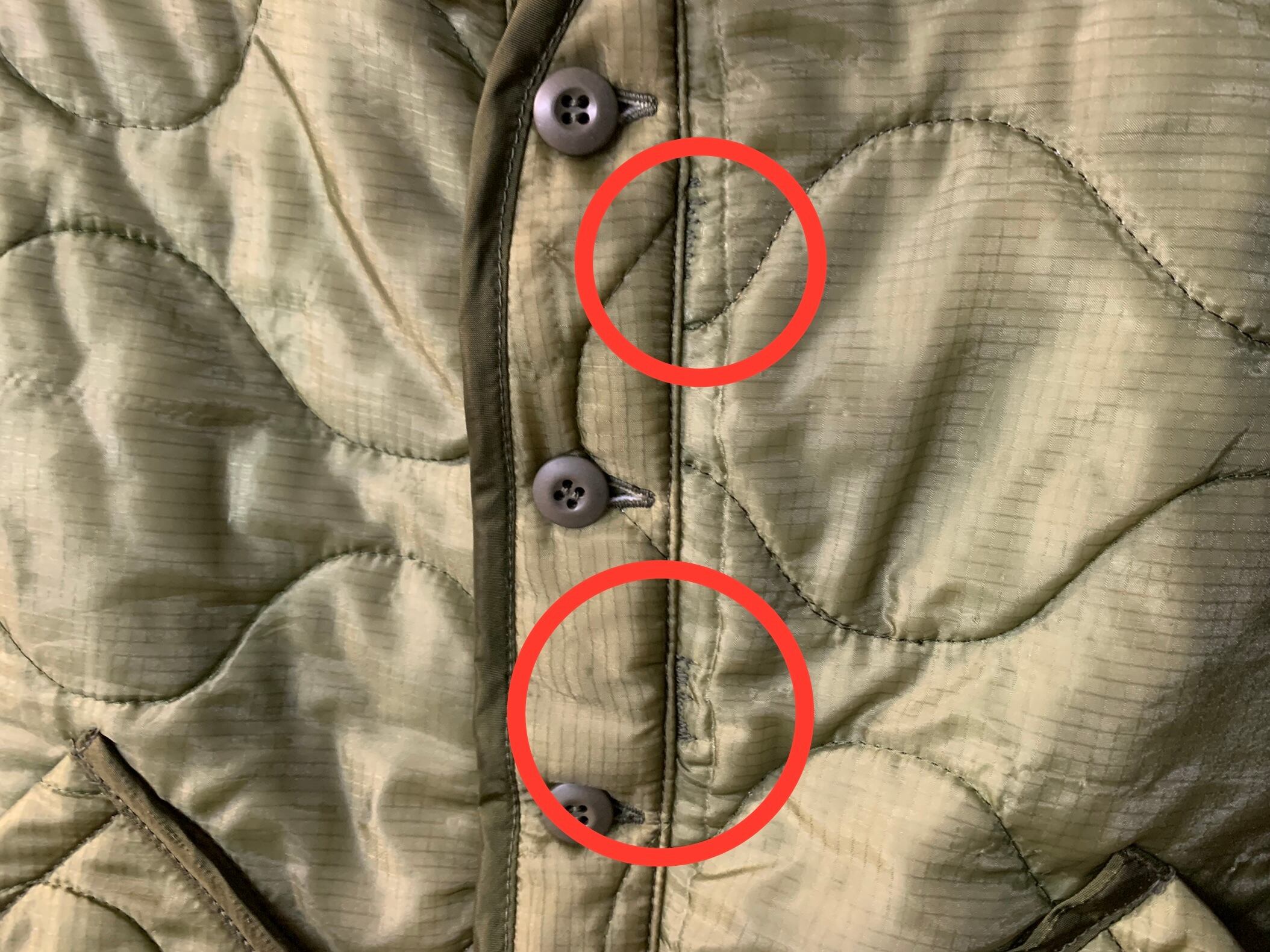 第1、第3ボタン付近と裾付近に、元々ついていたボタンホールをたたいて塞いだ補修跡があります。