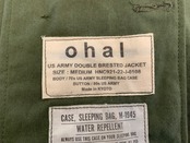 ボディーは、70年代アメリカ軍のスリーピングバッグケースの生地。コットン100%で通気性の良い素材感。一年通して使える生地かと思います。糸はヴィンテージの雰囲気を損なわないように、30番手の綿糸で縫っております。胸にはUSのステンシルが入っていた箇所を切り取り胸ポケットとして取り付けました。