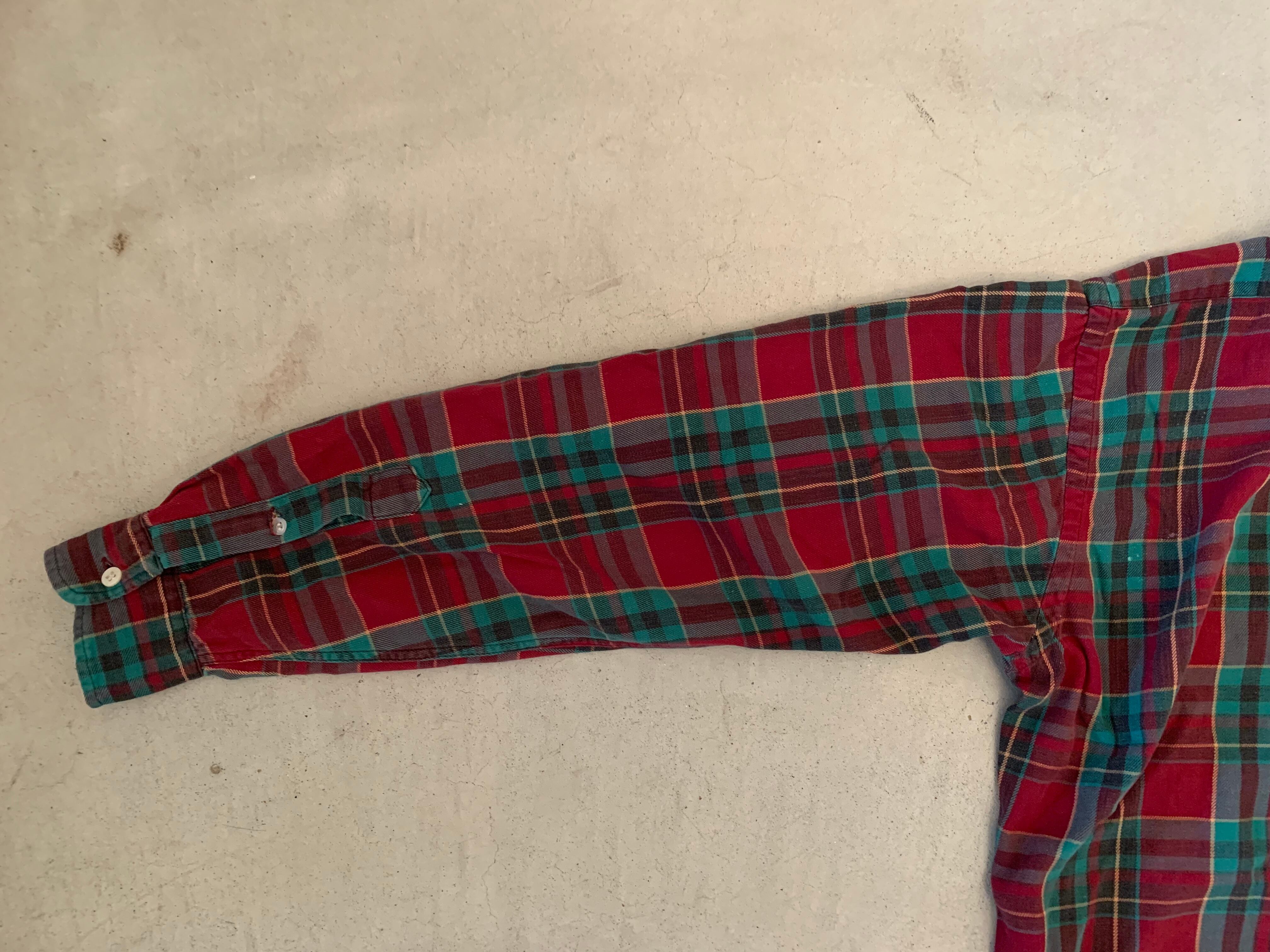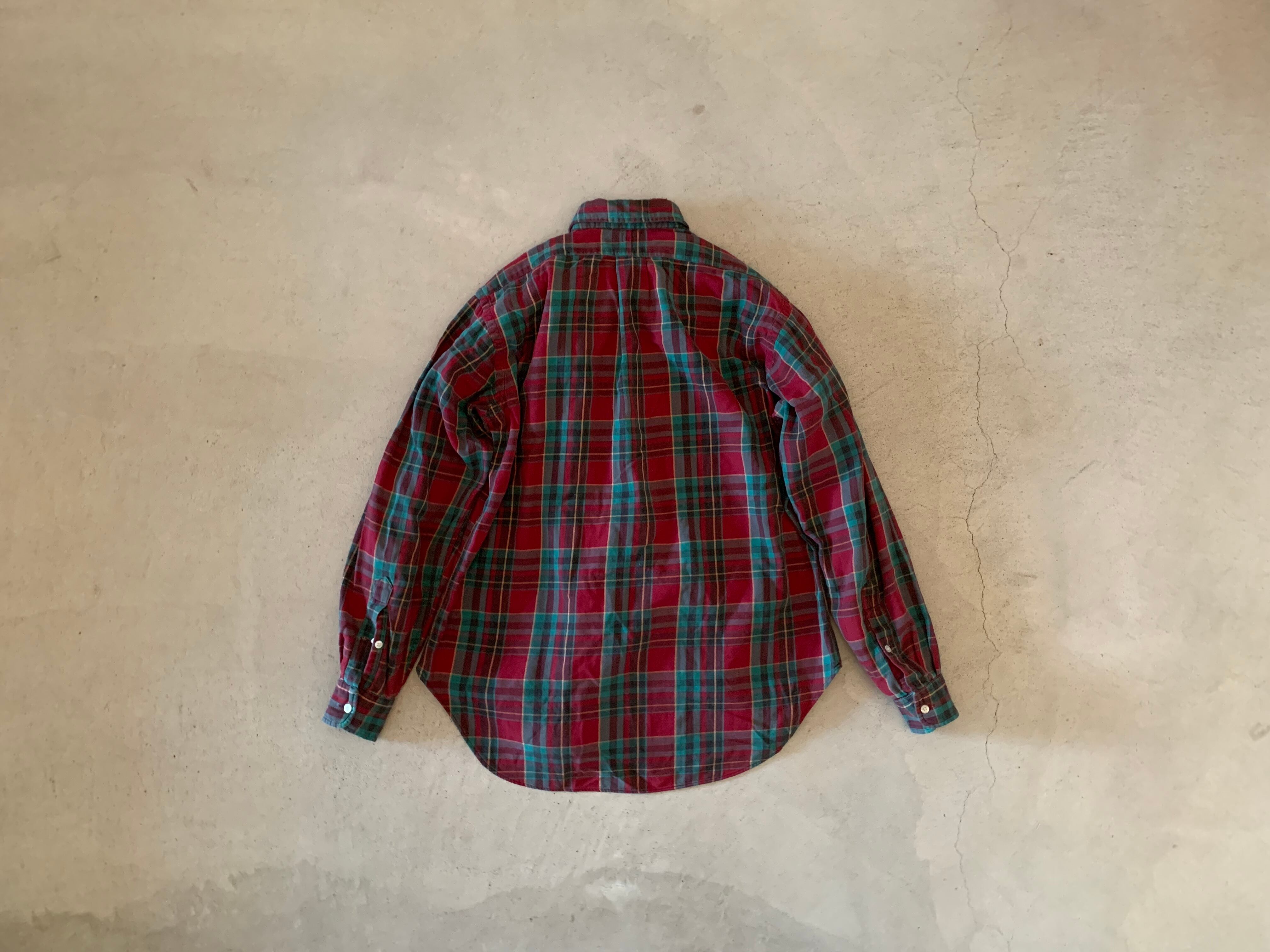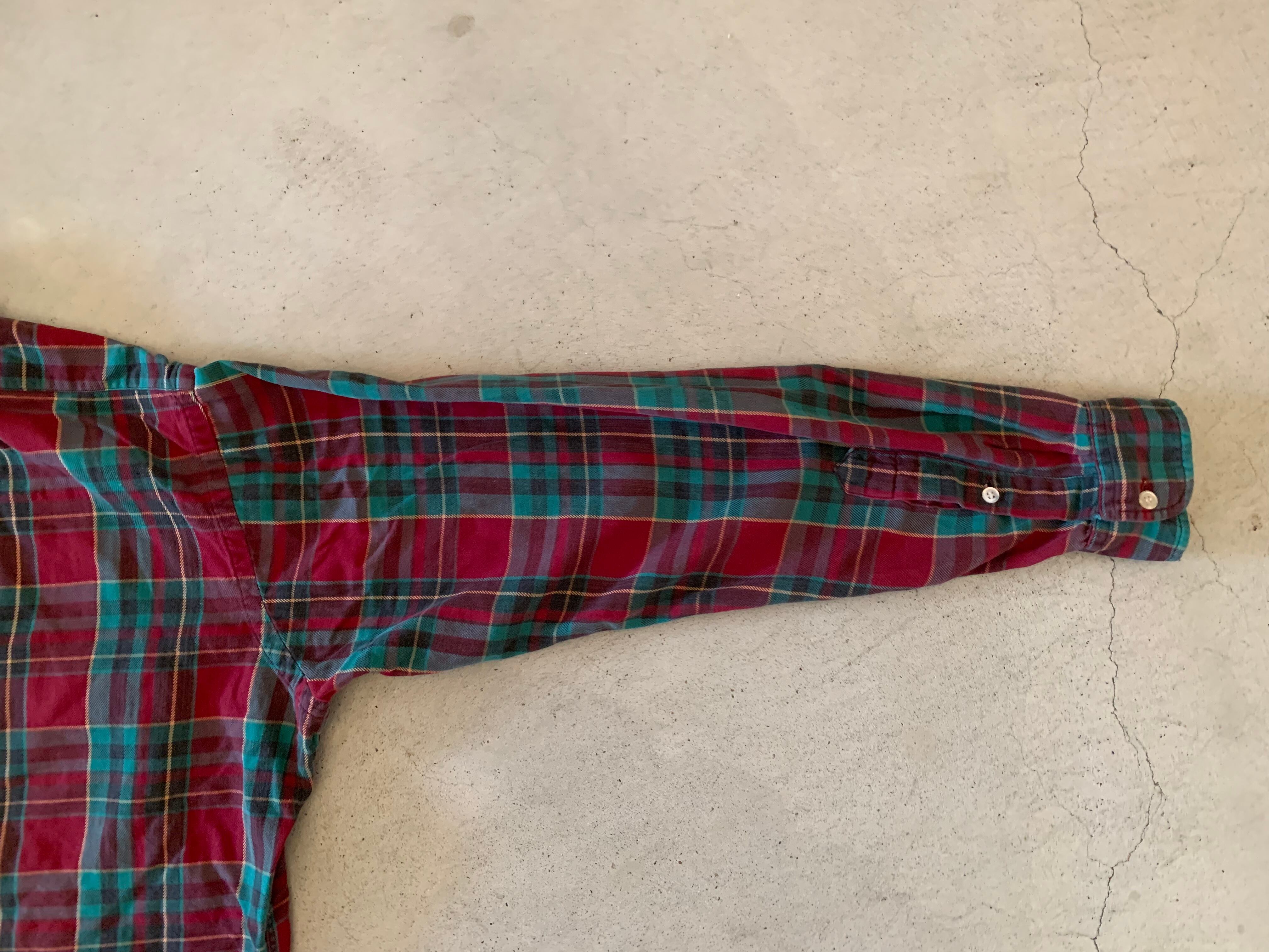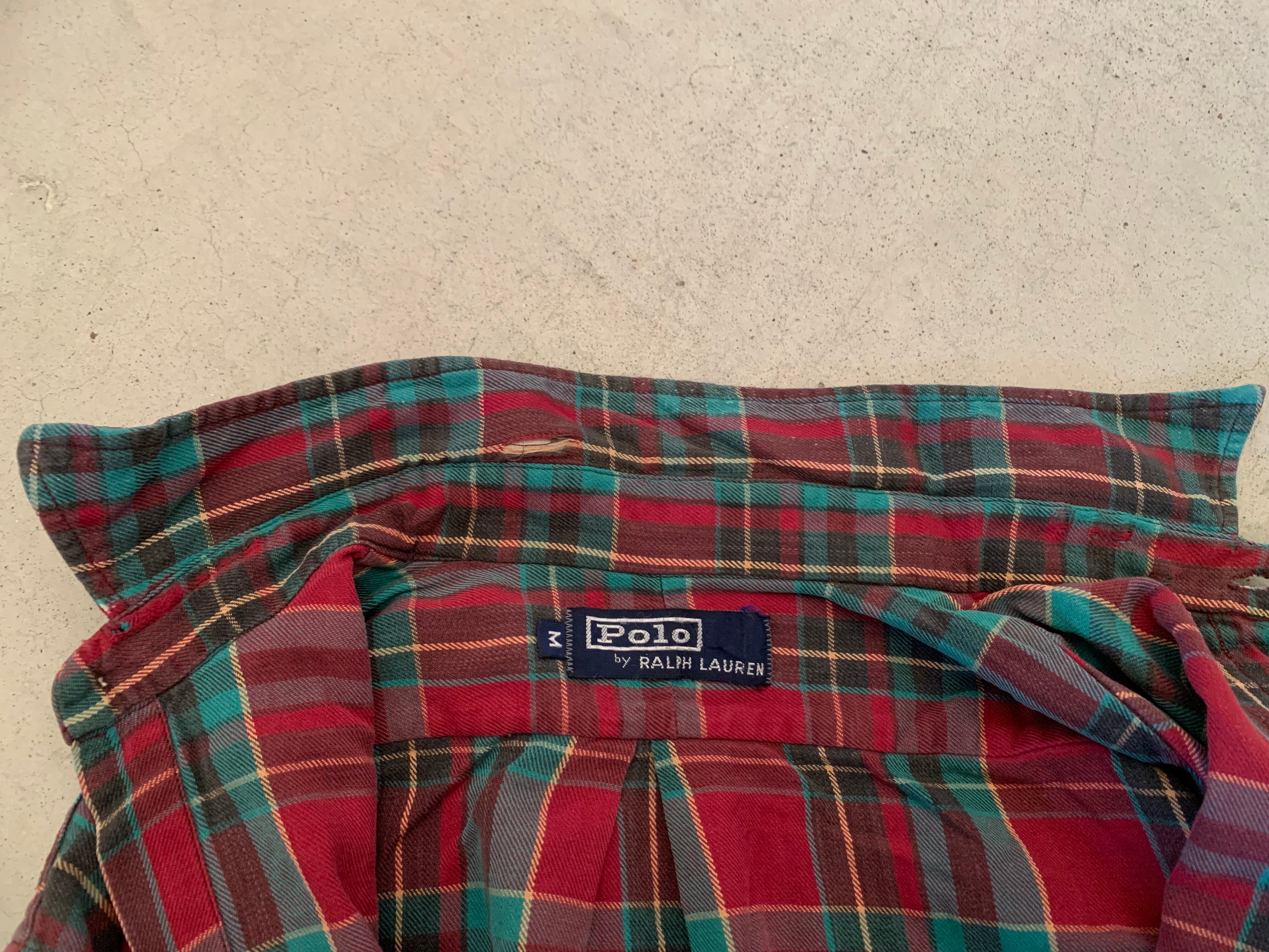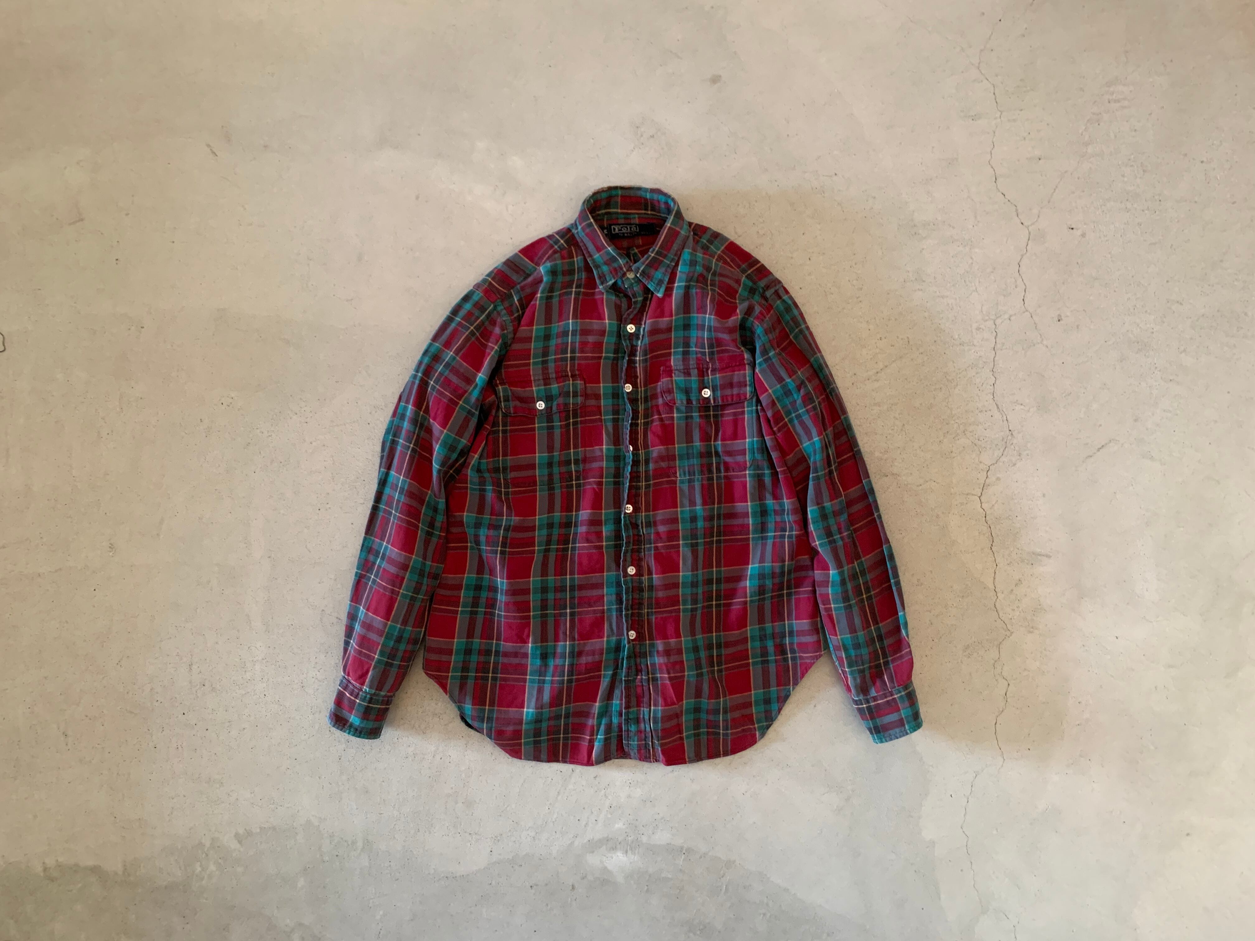 ラルフローレンの大文字タグがつく、70年代のチェックシャツ。ボタンは貝ボタン。フラップ付きのポケットでアウトドアな雰囲気のする一枚。