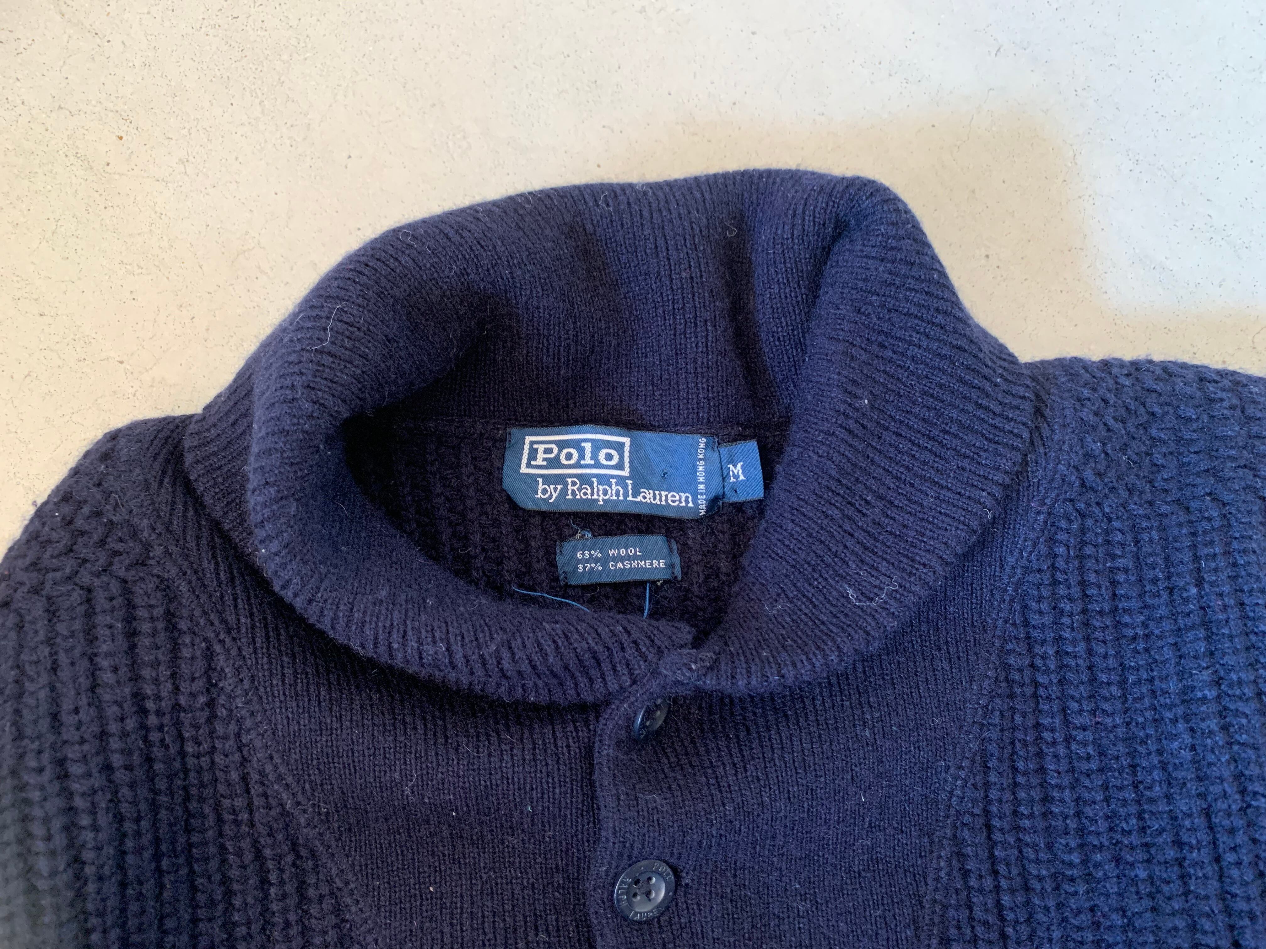 90年代オールドタグのつくラルフローレンのショールカラーセーター。カシミアが37%入っていることでとても肌触りの良い一枚です。中にシャツなどを着てレイヤードも楽しめます。