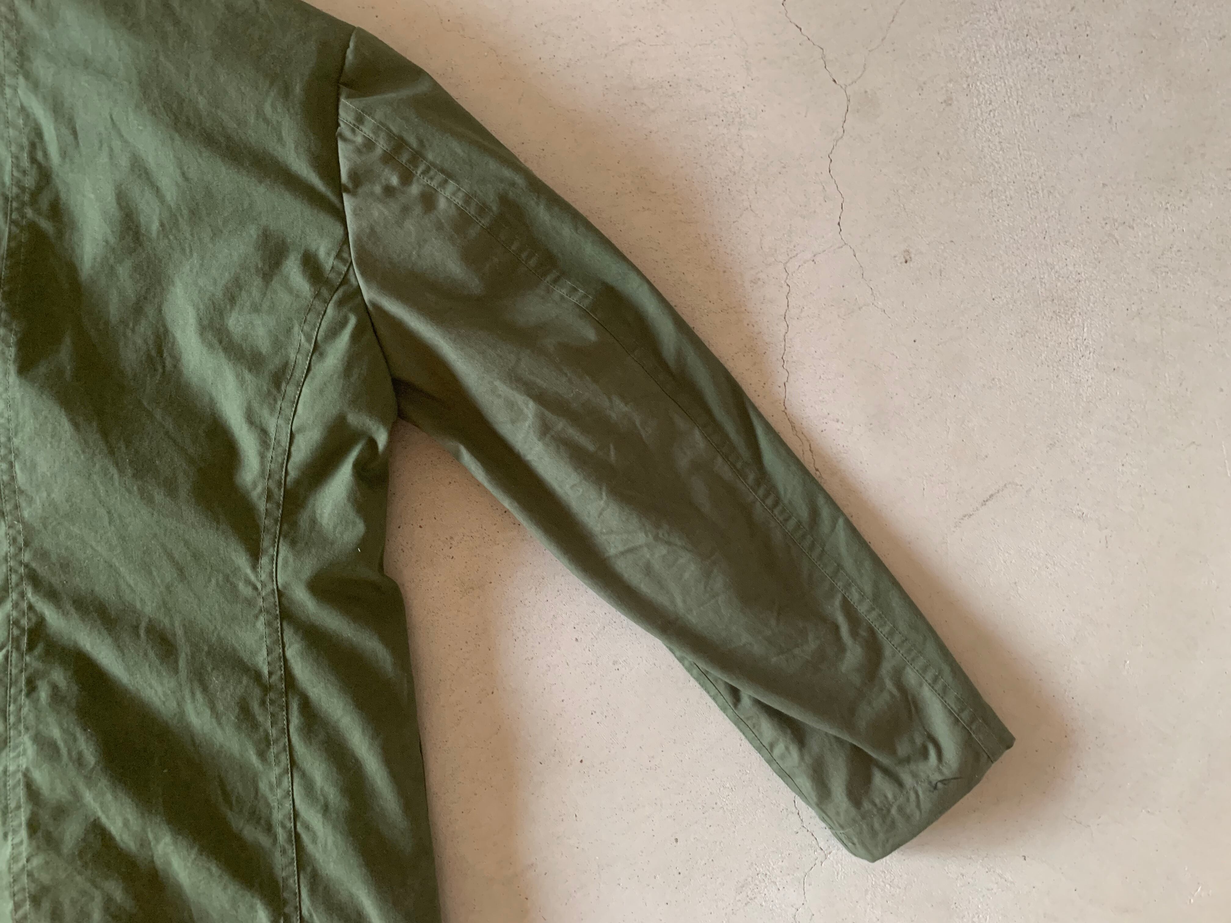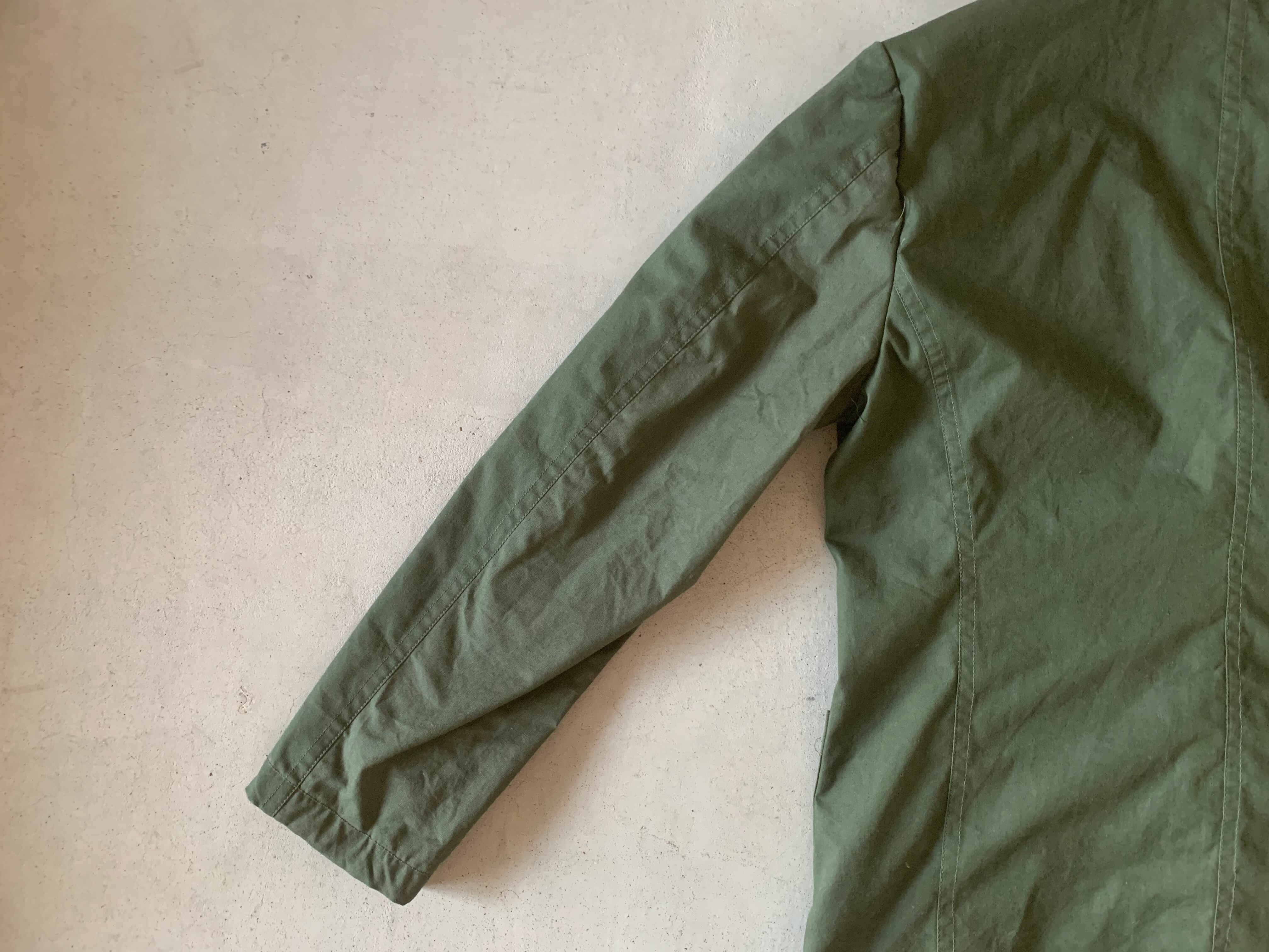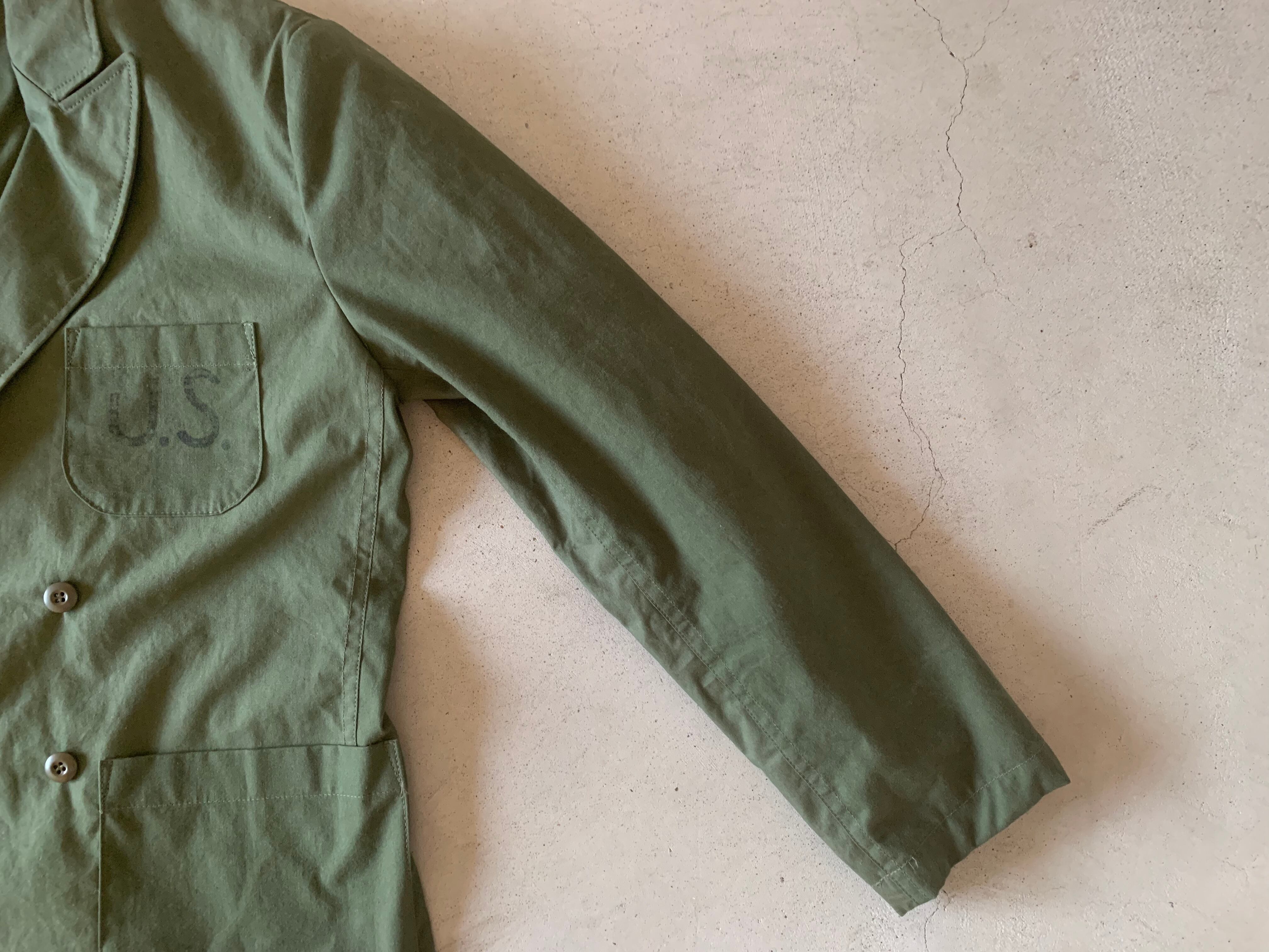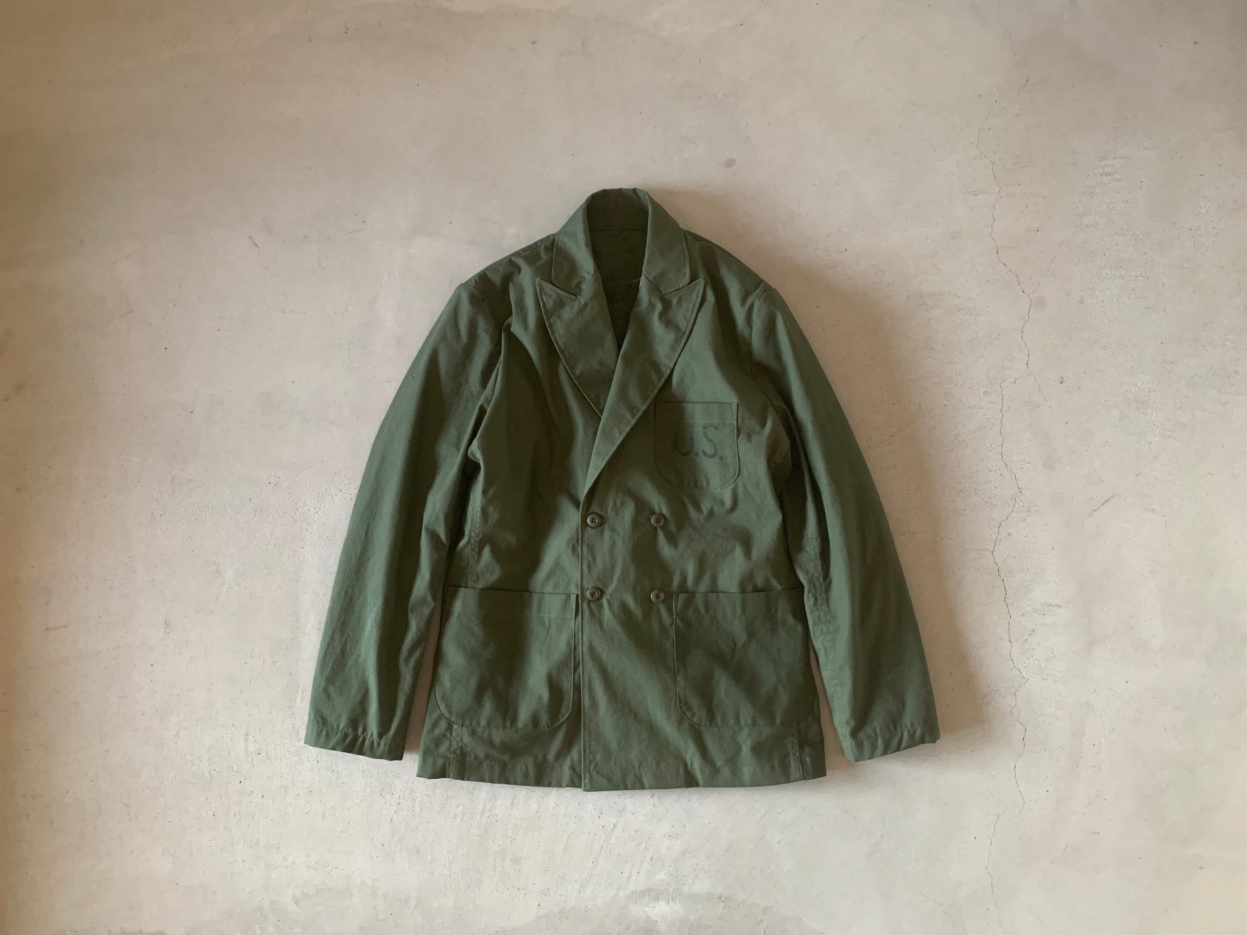 ボディーは、60年代アメリカ軍のスリーピングバッグケースの生地。コットン100%で通気性の良い素材感。一年通して使える生地かと思います。糸はヴィンテージの雰囲気を損なわないように、30番手の綿糸で縫っております。胸ポケットにはUSのステンシルが入っていた箇所を切り取り胸ポケットとして取り付けました。